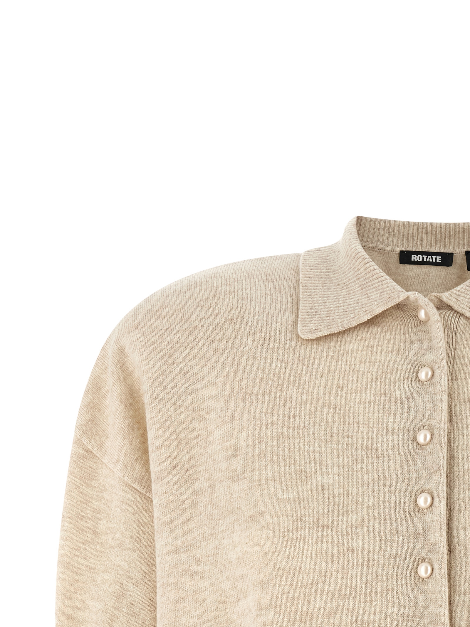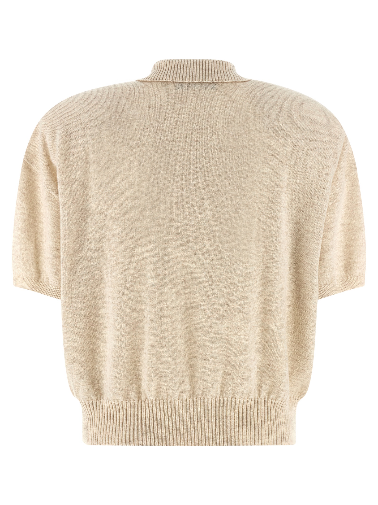 Crop knit wool and cashmere polo shirt, pearl collar and buttons, short sleeves with cuffs and dropped shoulder, removable padded shoulder, and headband on the hem.