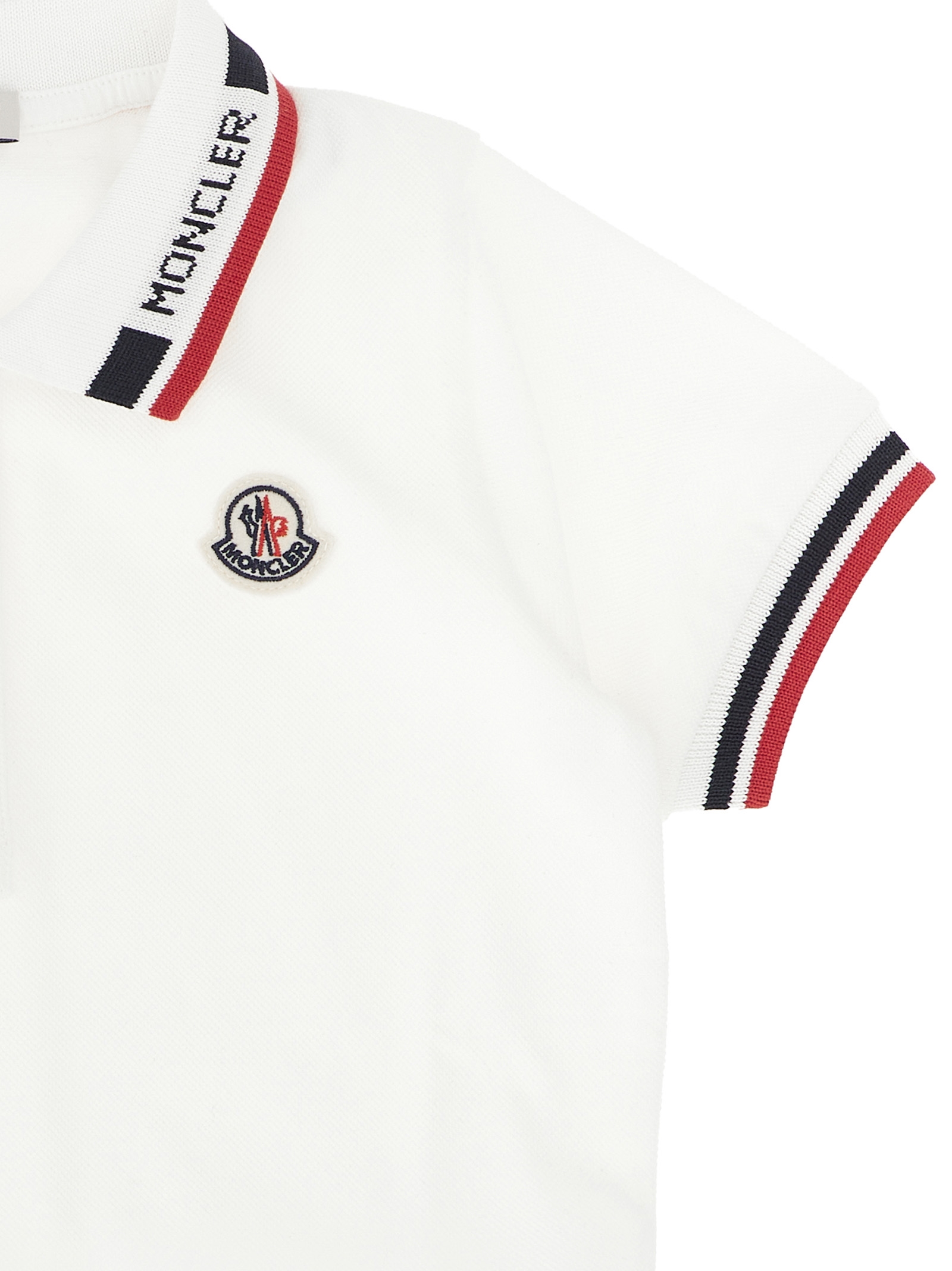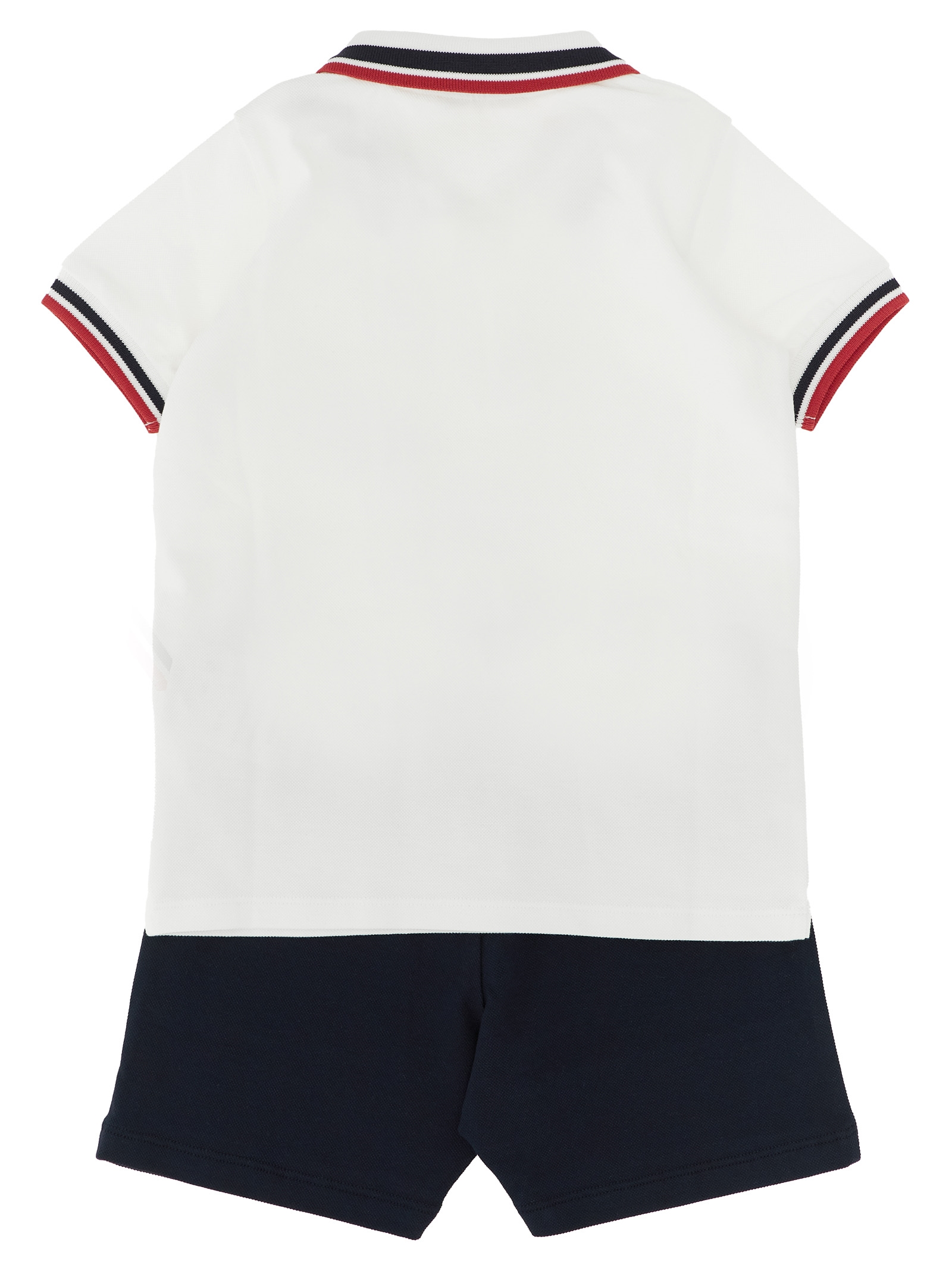 Set in stretch cotton piquet consisting of polo shirt with tricolor trim on the collar and sleeves, front felt logo patch, collar and buttons, short sleeves with cuffs and bermuda shorts with elastic waistband, trompe l’oeil flap.