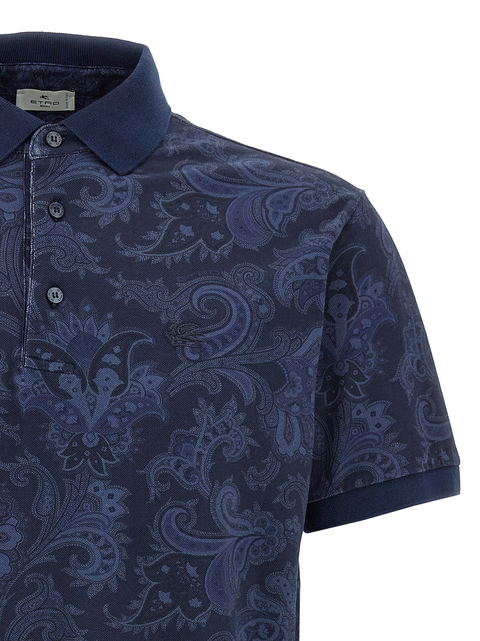 Piqué cotton polo shirt with all-over maxi flower Paisley print and solid color details, tone-on-tone logo embroidery on the front, collar and buttons, short sleeves, side splits.