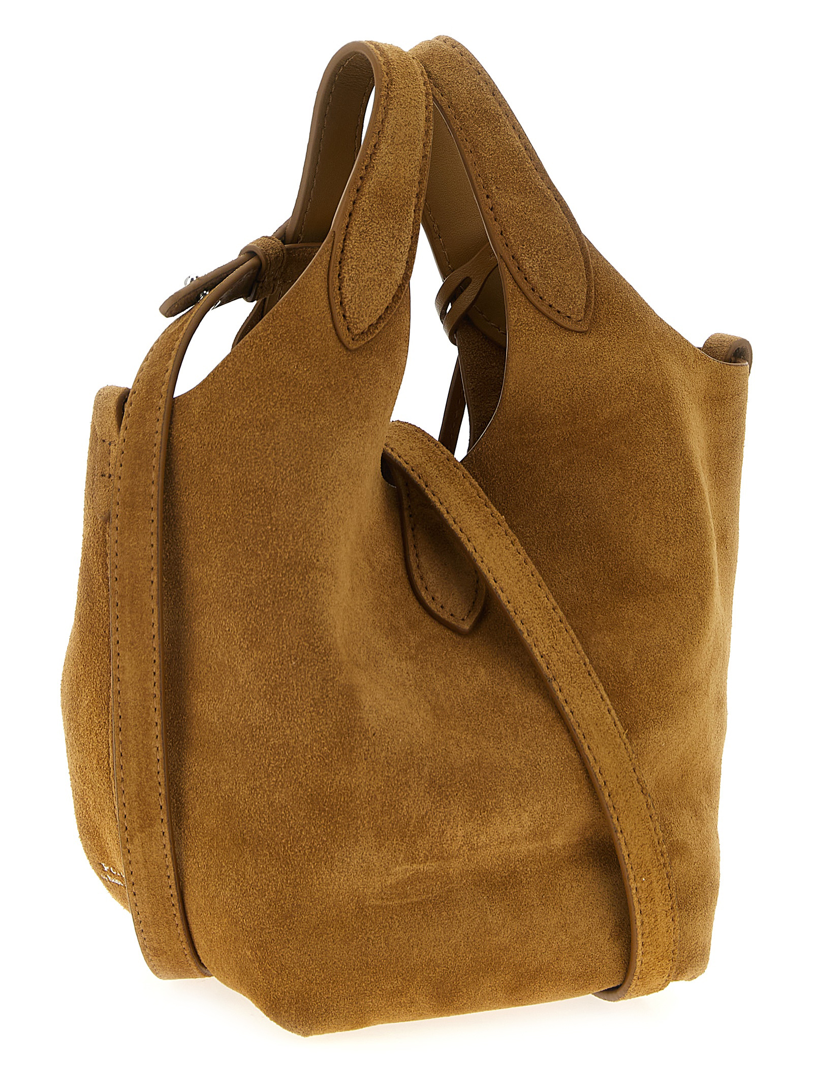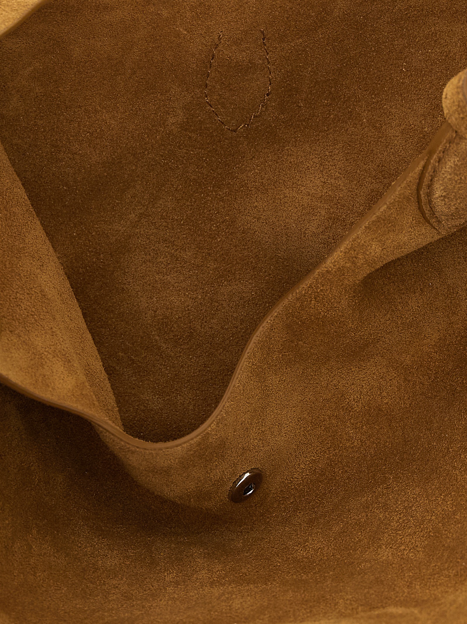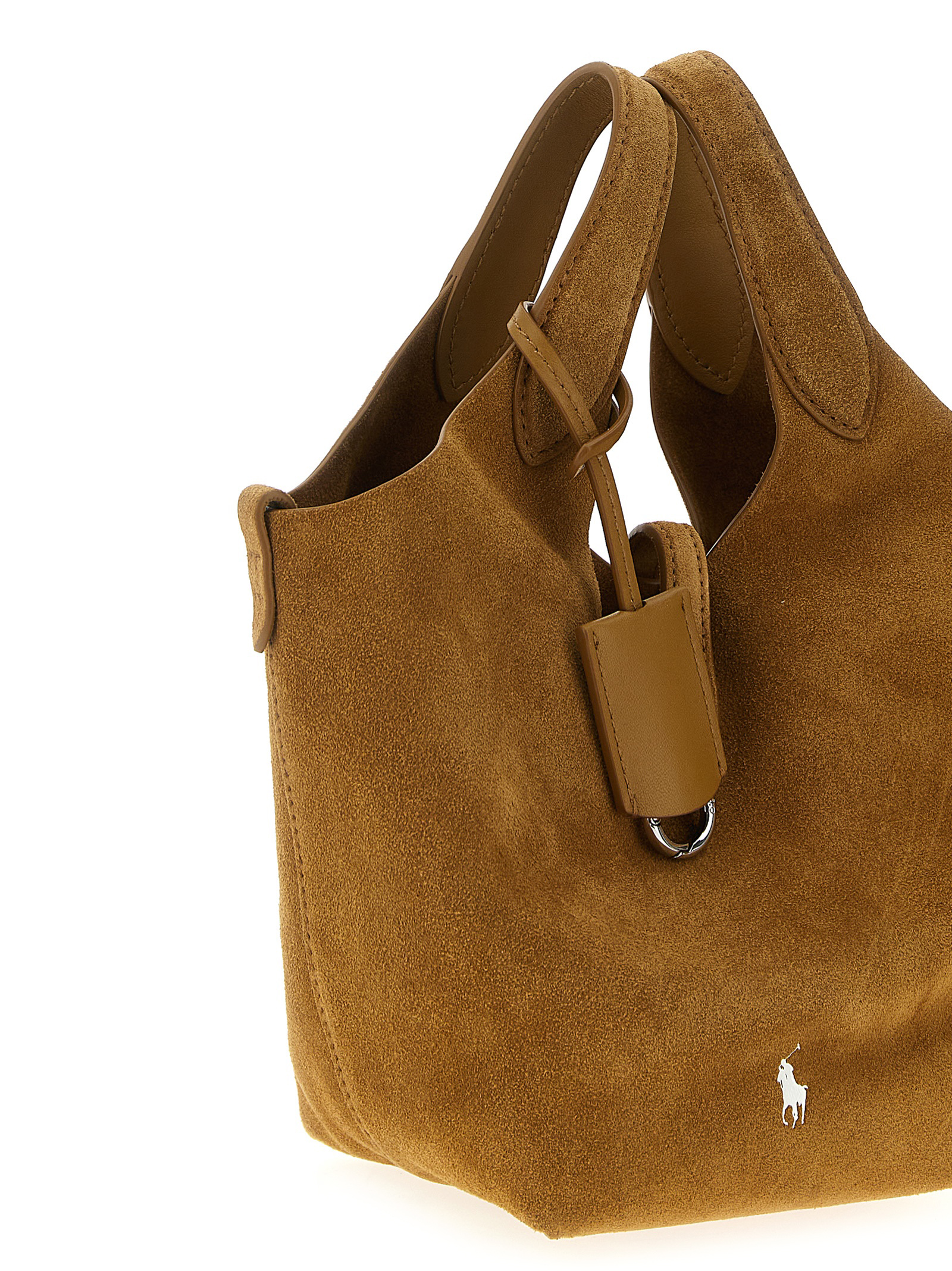 ‘Polo Play’ suede shopping bag with front logo embroidery, double fixed tank top handle, snap button closure, frog, adjustable and removable shoulder strap.
