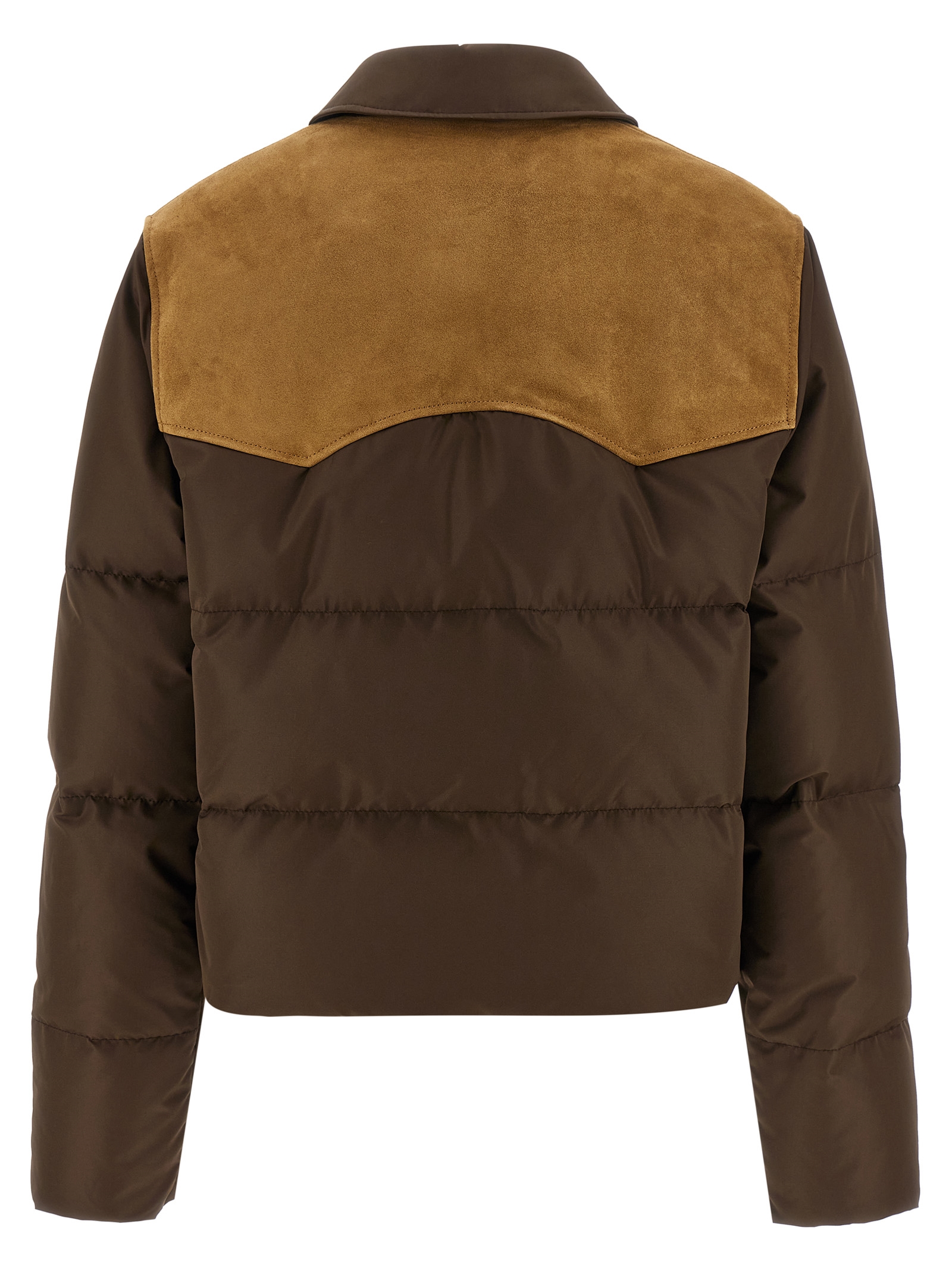 Quilted and goose feather padded pongé jacket with contrasting crust leather top, slightly crop style, shirt collar, logo patch and front snap button closure, pockets, long sleeves with elastic cuffs, drawstring on the hem.