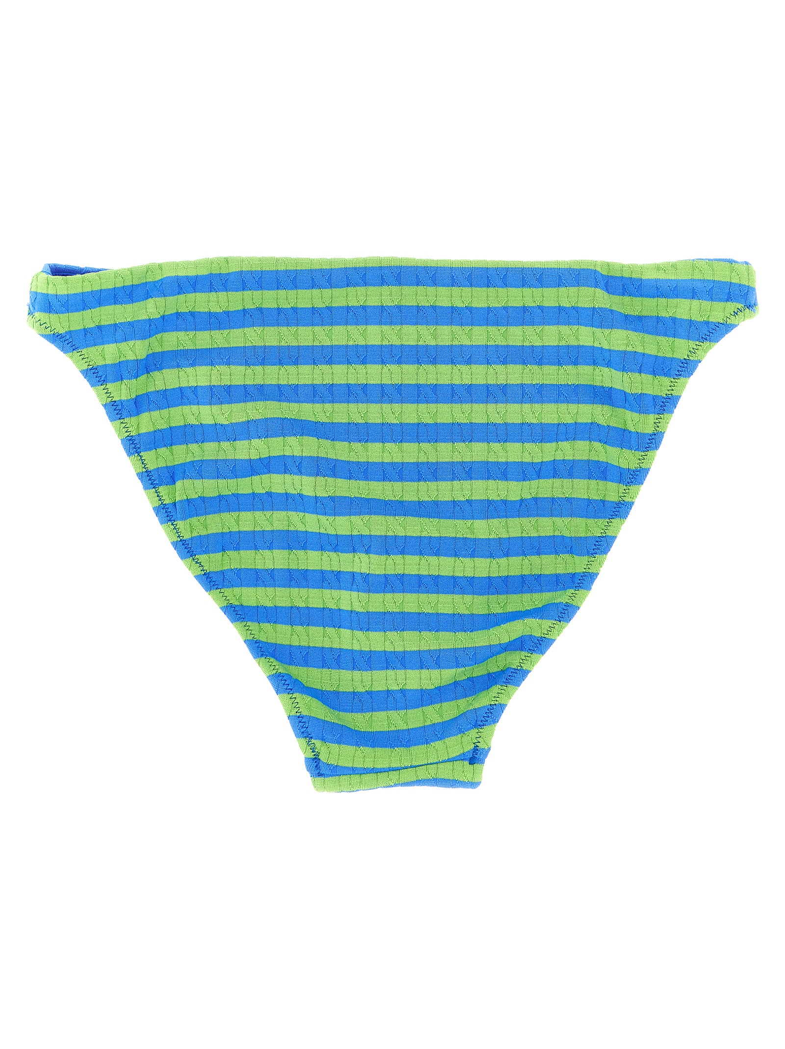 Bikini briefs in technical fabric with horizontal striped patterned braids, contrast ‘Pony’ embroidery on the front, high leg, cheeky cover.