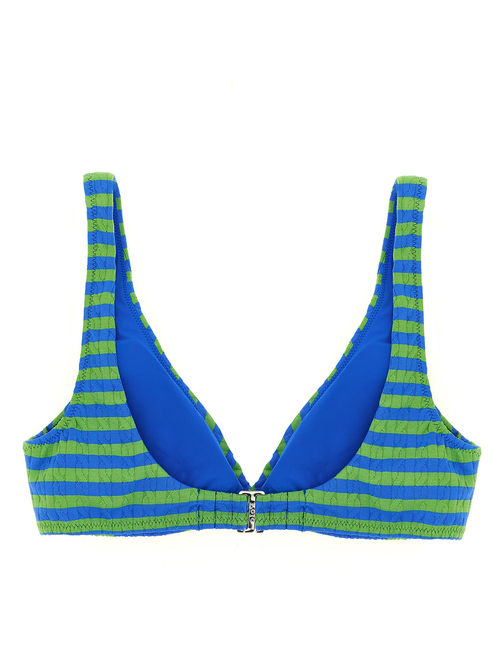 Bikini top in technical fabric with horizontal striped patterned braids, bralette model, contrast ‘Pony’ embroidery and V-neck, removable cups, back hook closure.