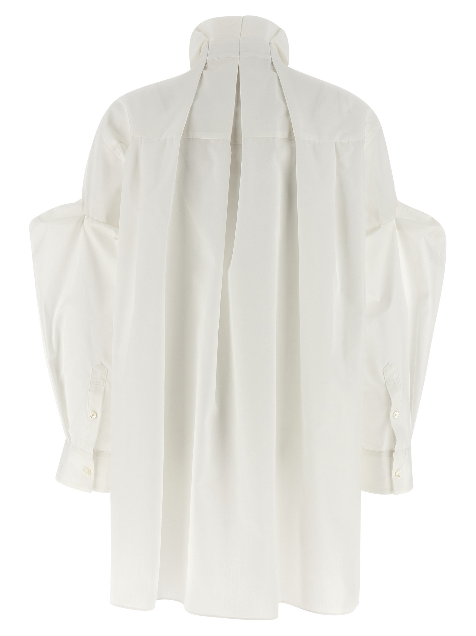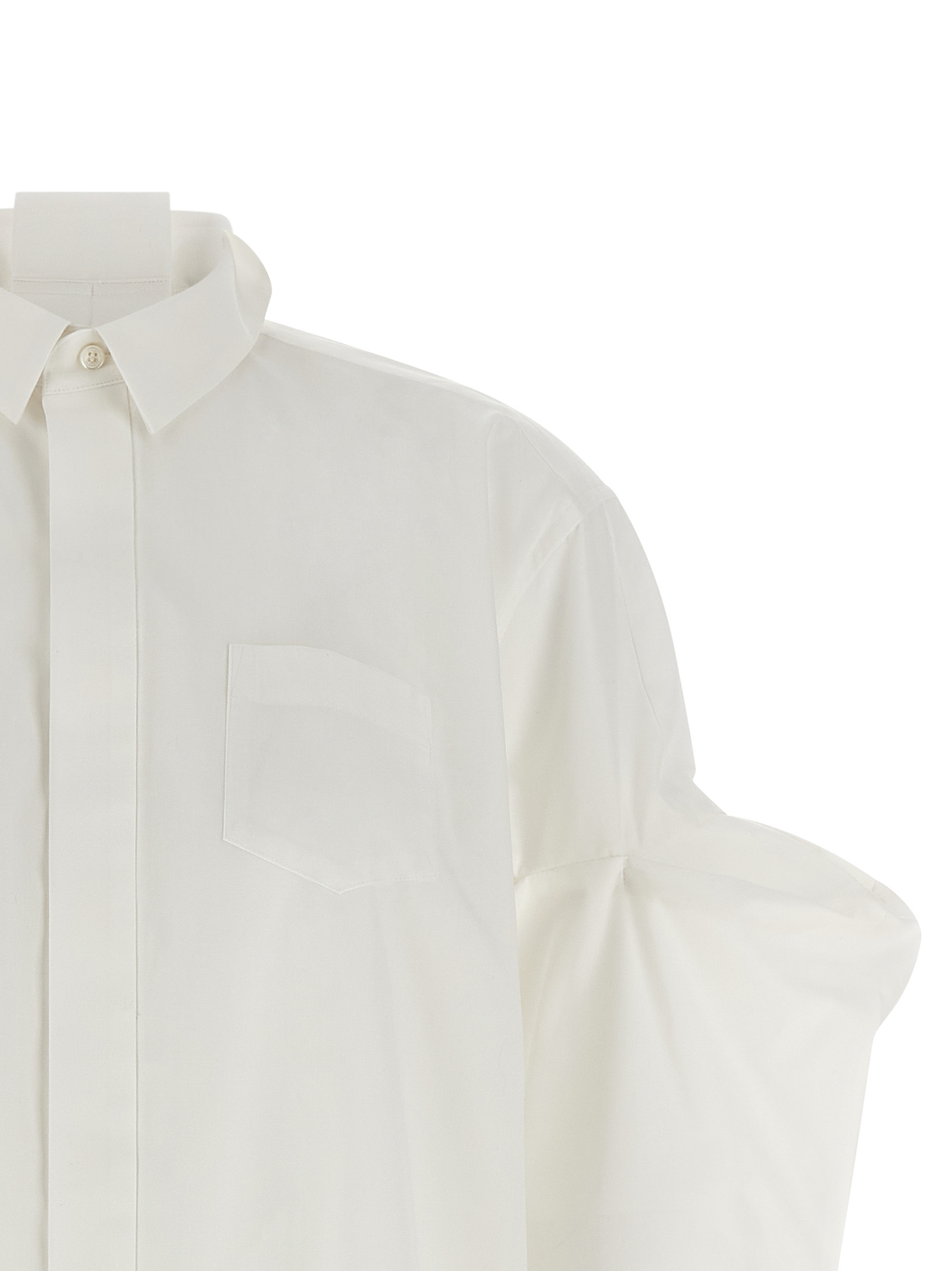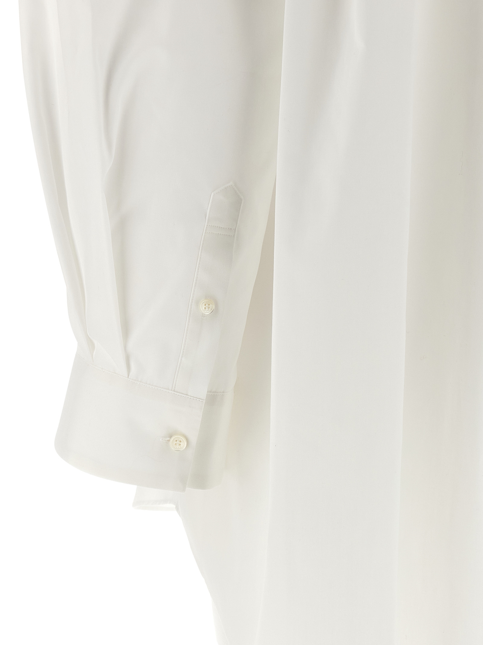 Cotton poplin shirt, chest pocket, concealed front button closure, long sleeves with cuffs and gusset insert, rounded and asymmetrical hem.