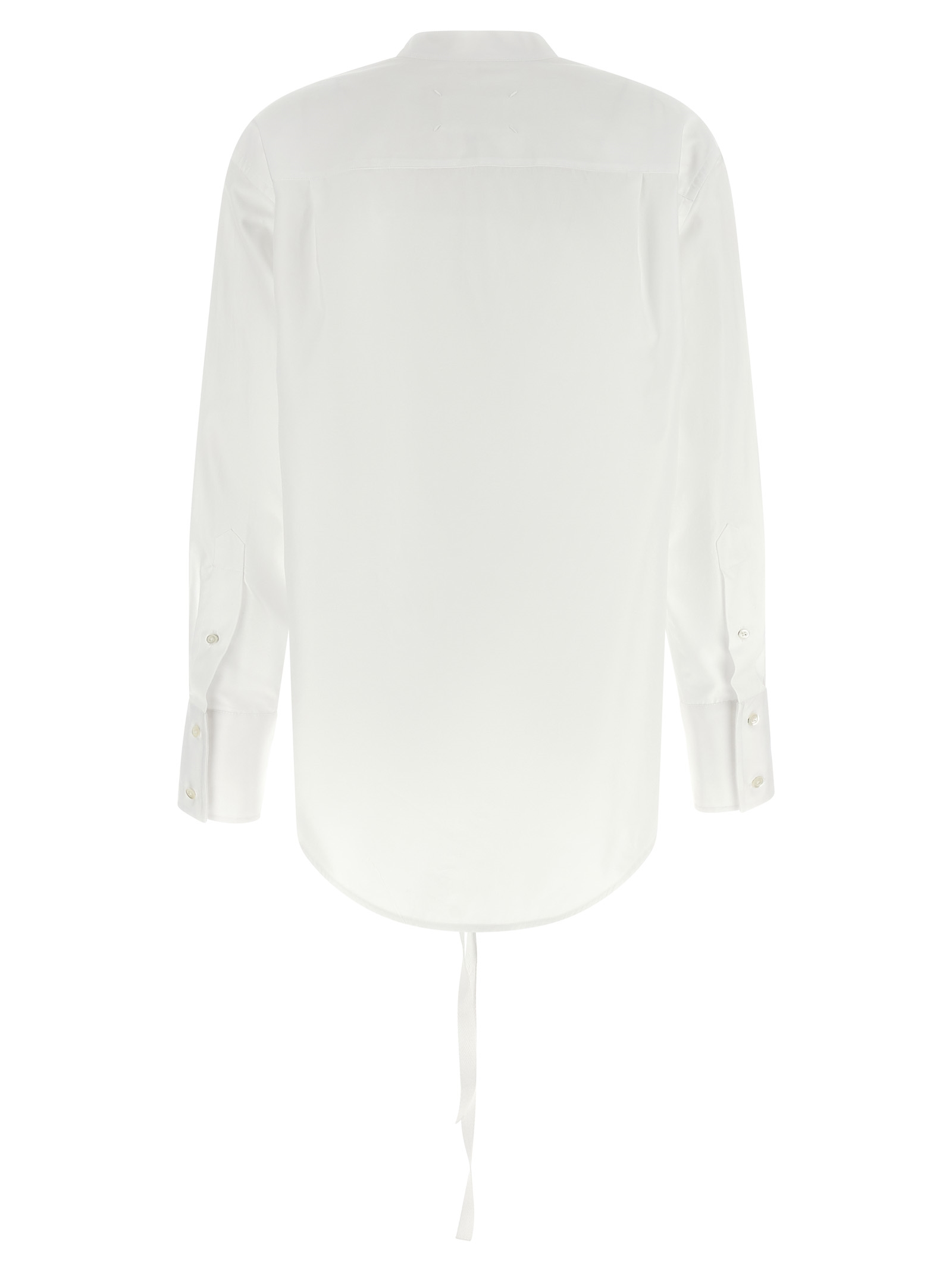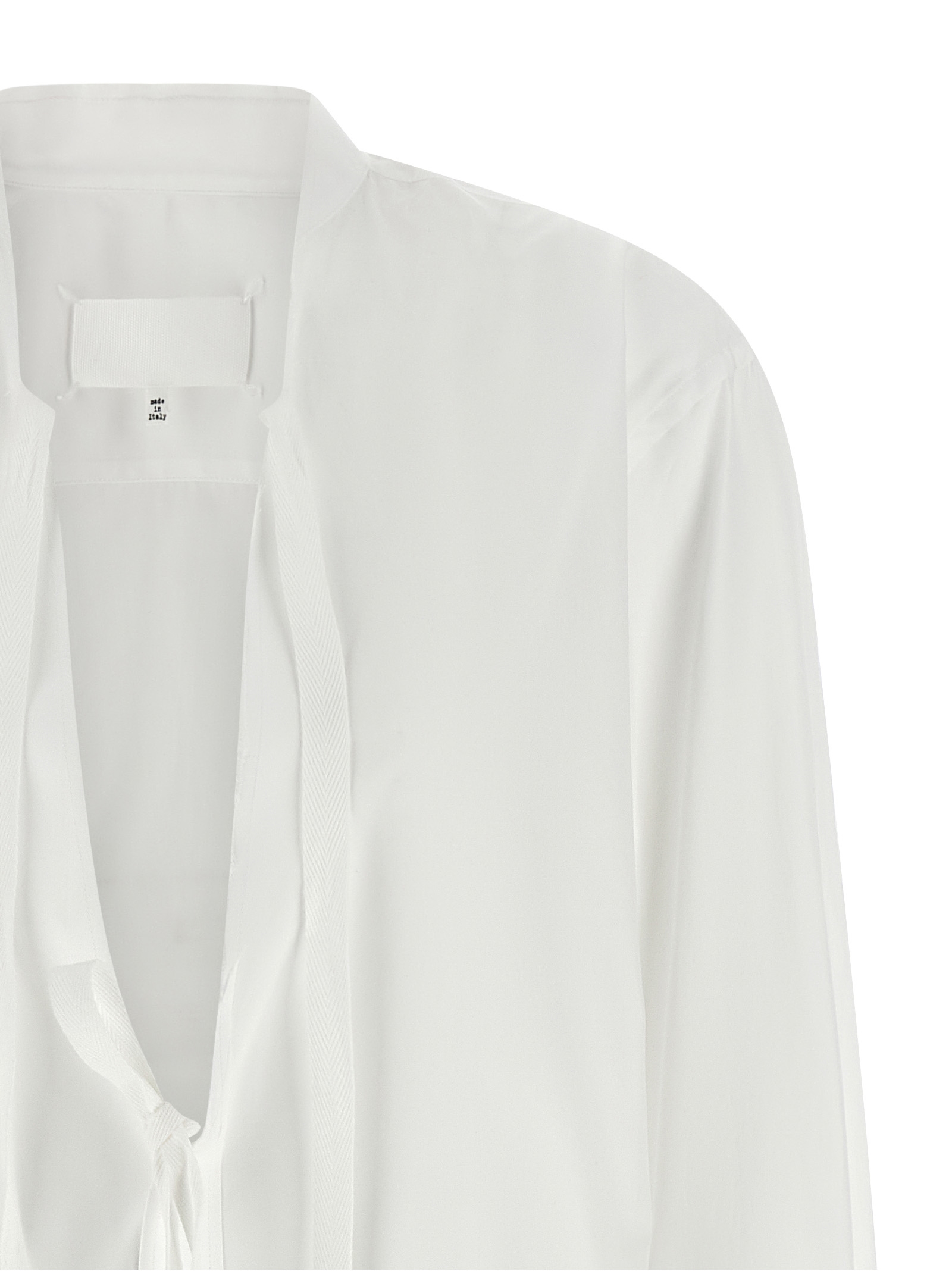 Cotton poplin shirt, V-neck with raw trim, front button and lacing closure, ‘4 stiches’ logo detail at the back and long cuffed sleeves.