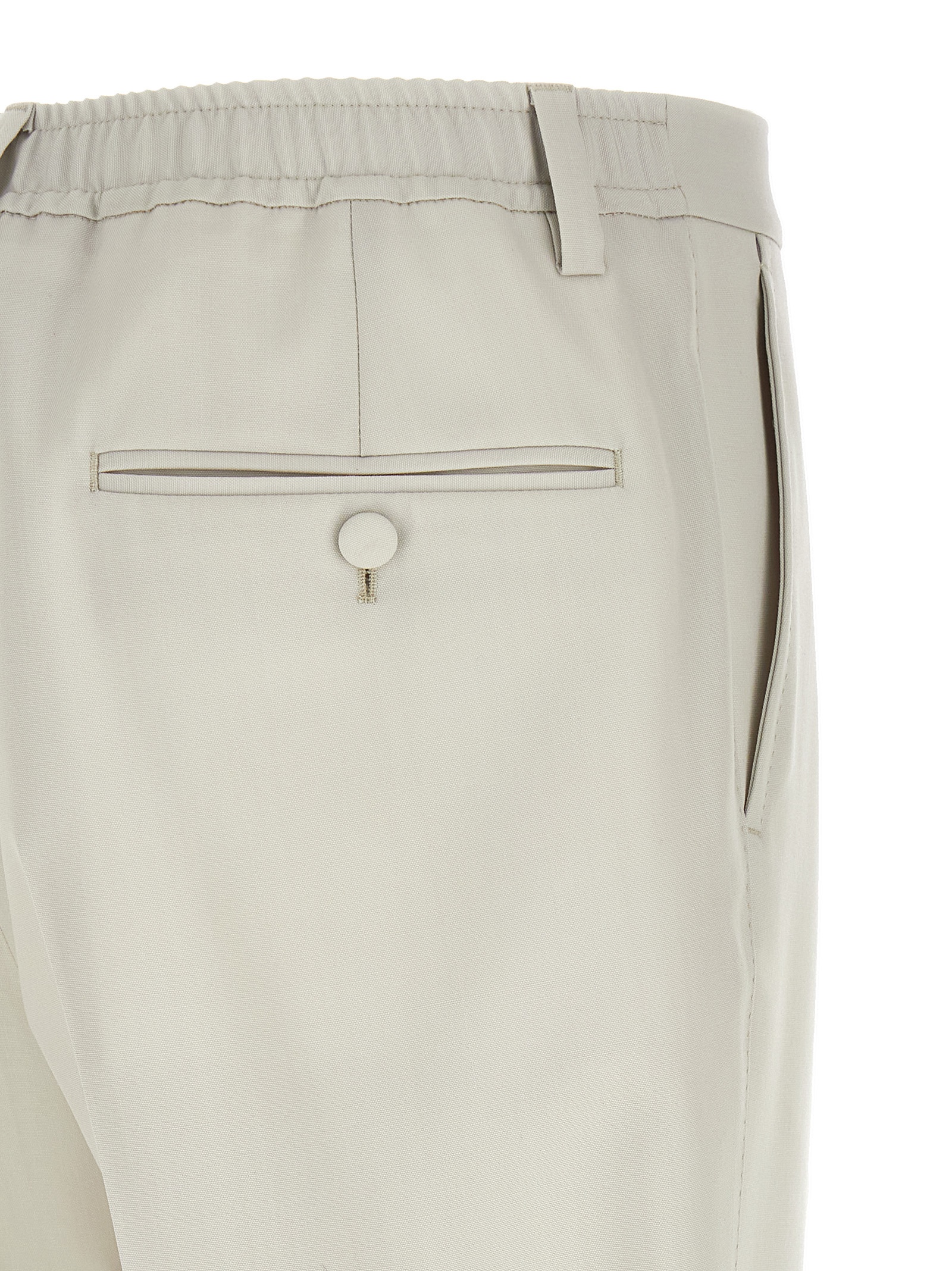 Classic wool poplin pants with belt and elastic at the back, front zip and covered button closure, slanted side pockets and back welt pockets with button, straight leg with front stretched pleat, tone-on-tone stitching details with handcrafted motif.