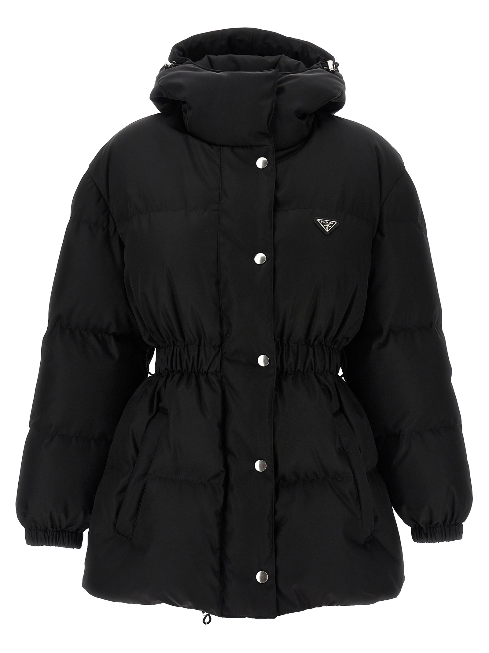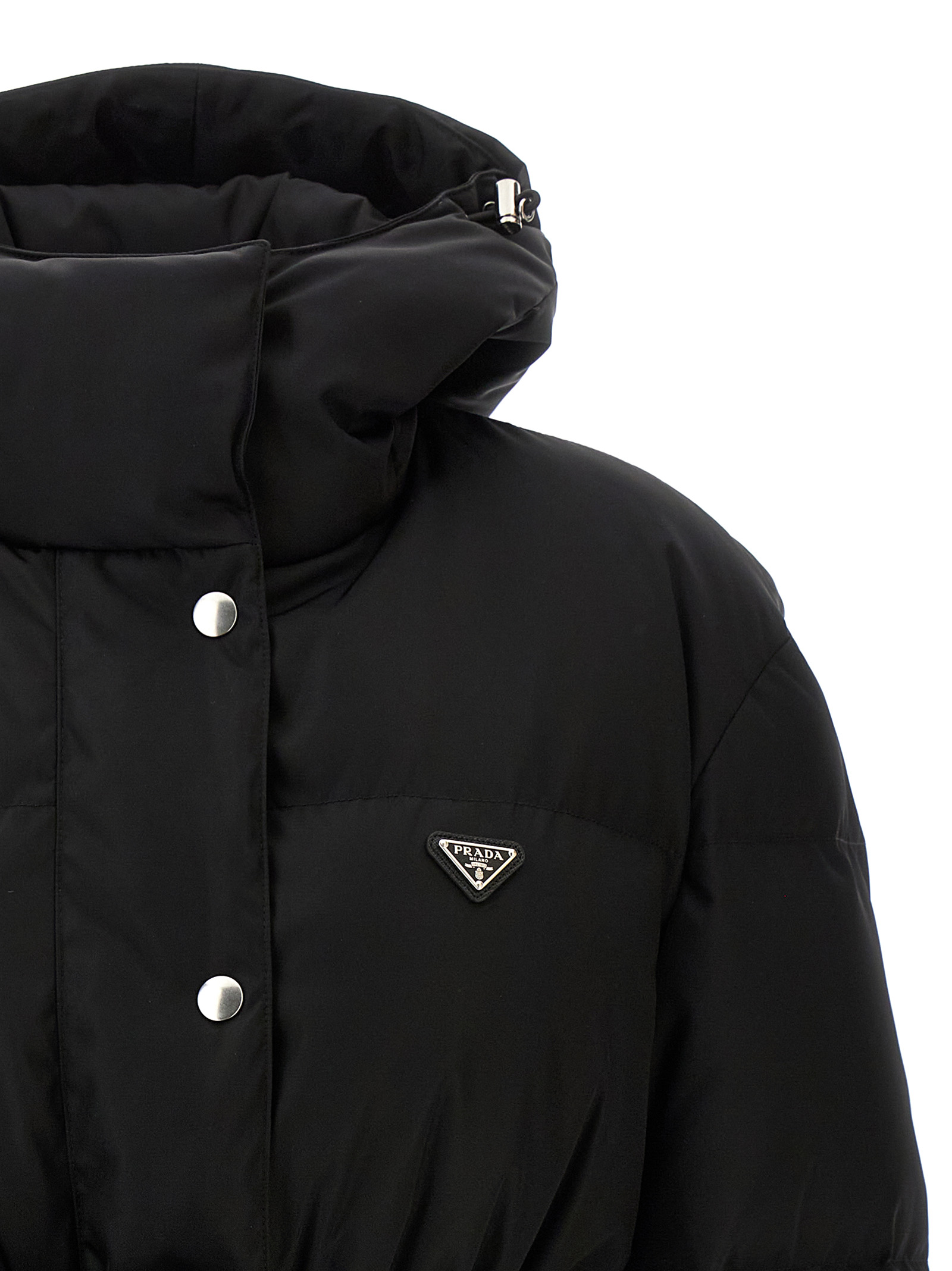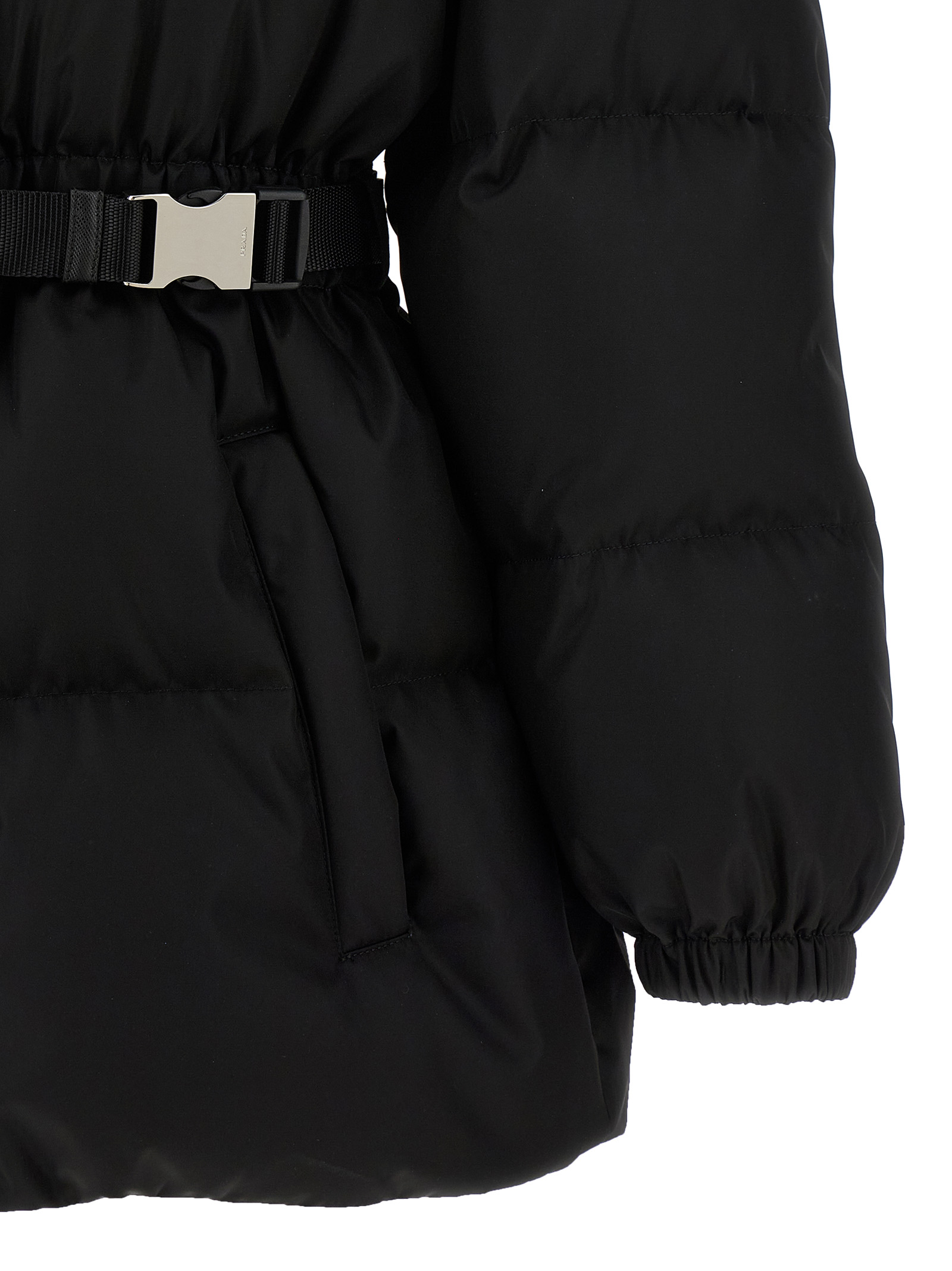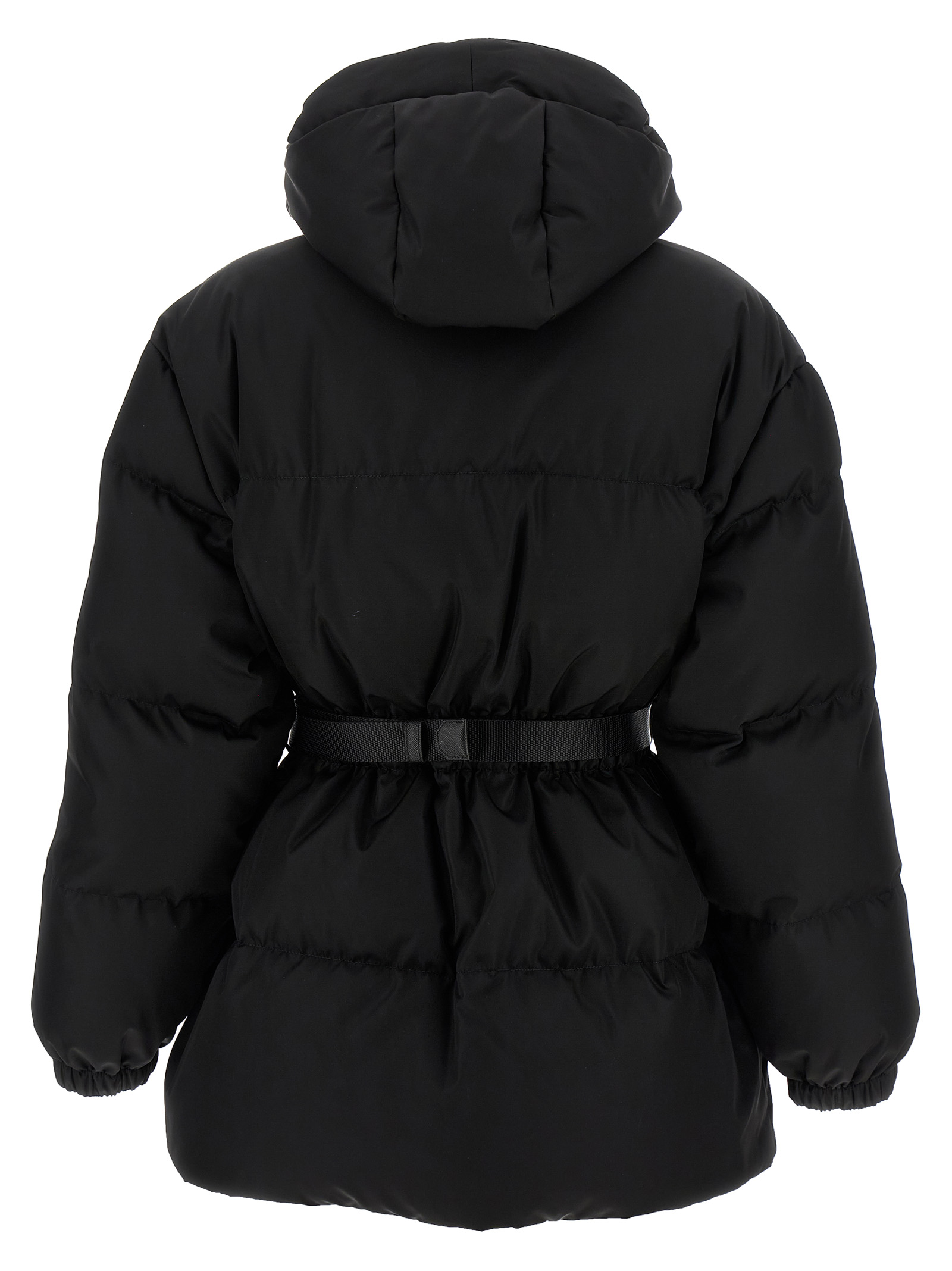 Quilted Re-Nylon down jacket with goose feather padding, adjustable hood, high neck, front enameled metal triangle logo and zip and snap button closure on the front, elastic waistband, long sleeves with elastic cuffs, drawstring on the hem, fabric belt with tuc closure and removable Re-Nylon belt bag.