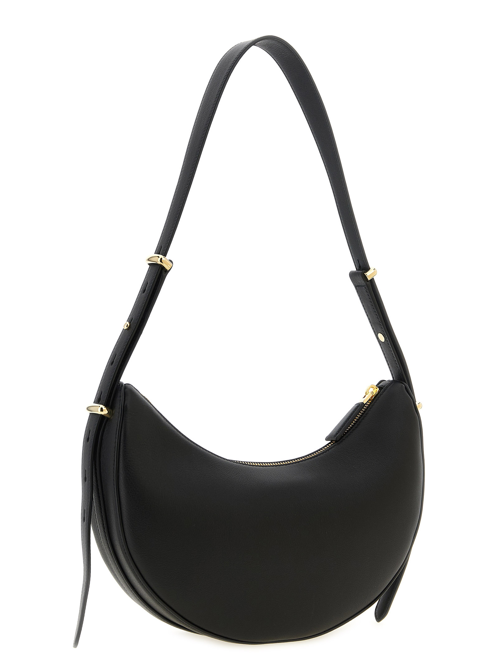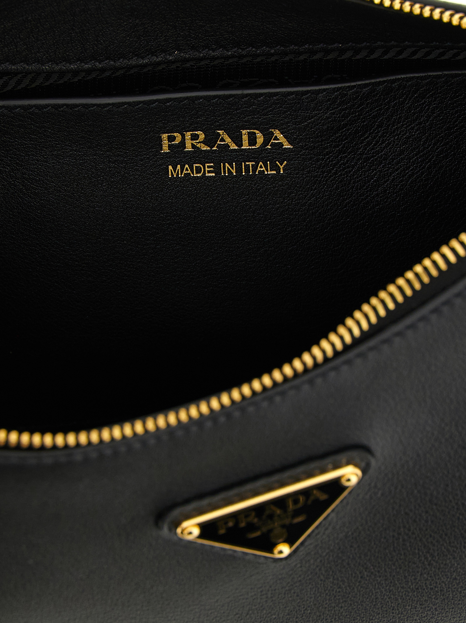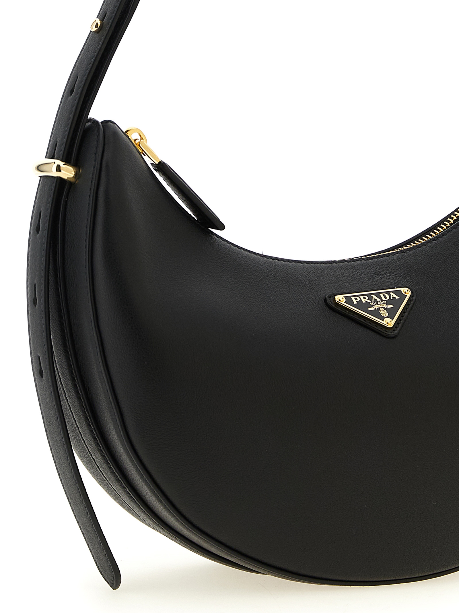 ‘Prada Arqué’ smooth leather shoulder bag with crescent silhouette, front enameled metal triangle logo, top zip closure, adjustable shoulder strap.