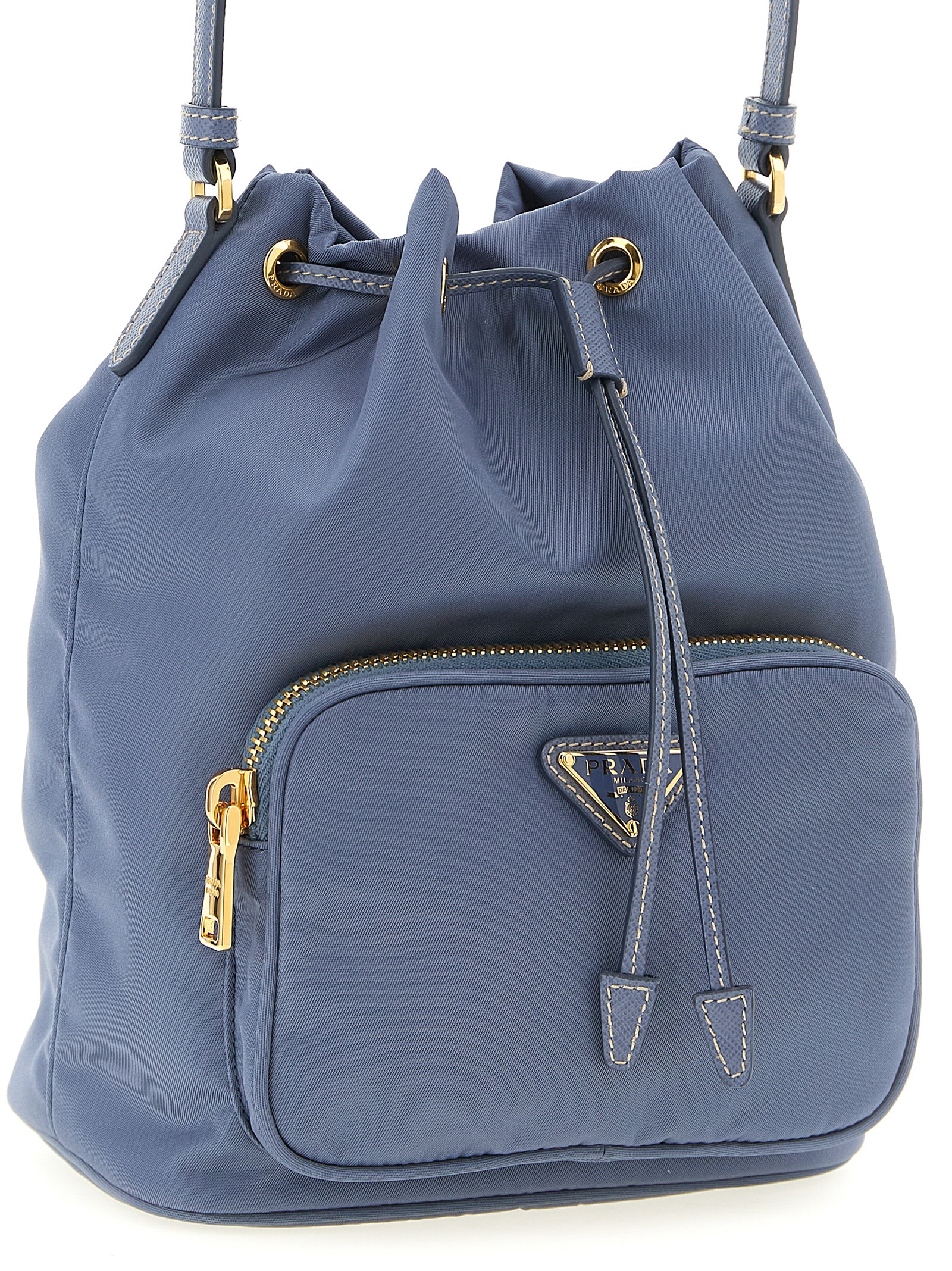 ‘Prada Duet’ Re-Nylon and Saffiano leather tone-on-tone bucket bag, zip pocket and front enameled metal triangle logo, fixed handle, drawstring closure, signed Re-Nylon lining, adjustable and removable shoulder strap.