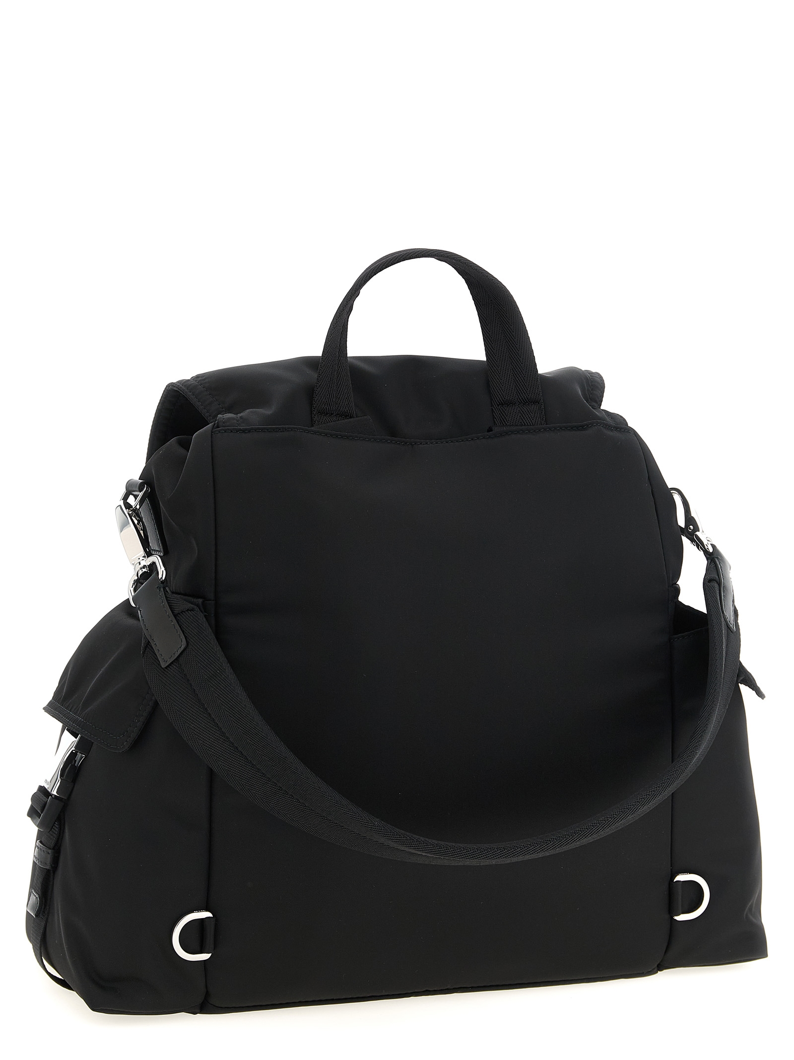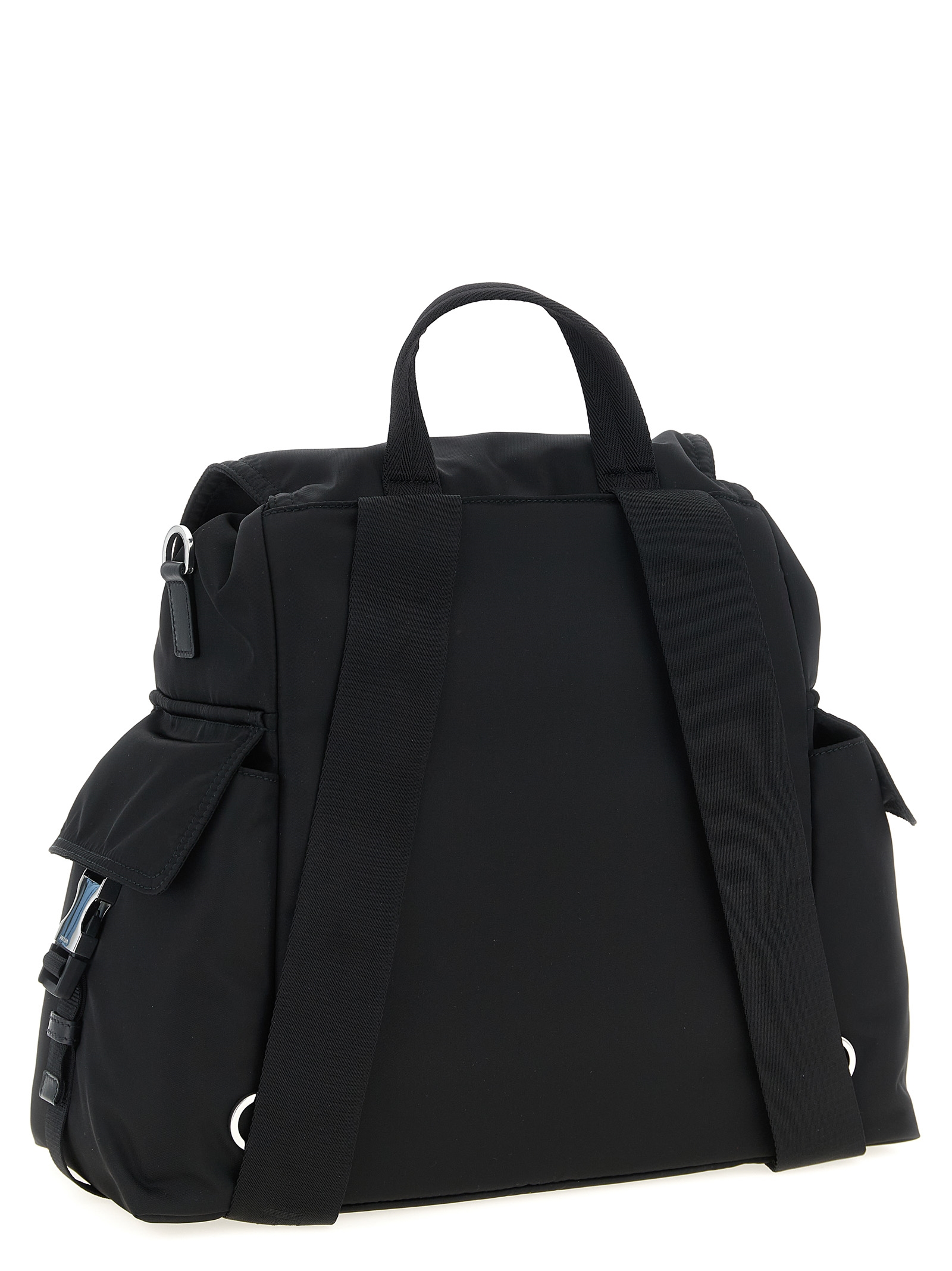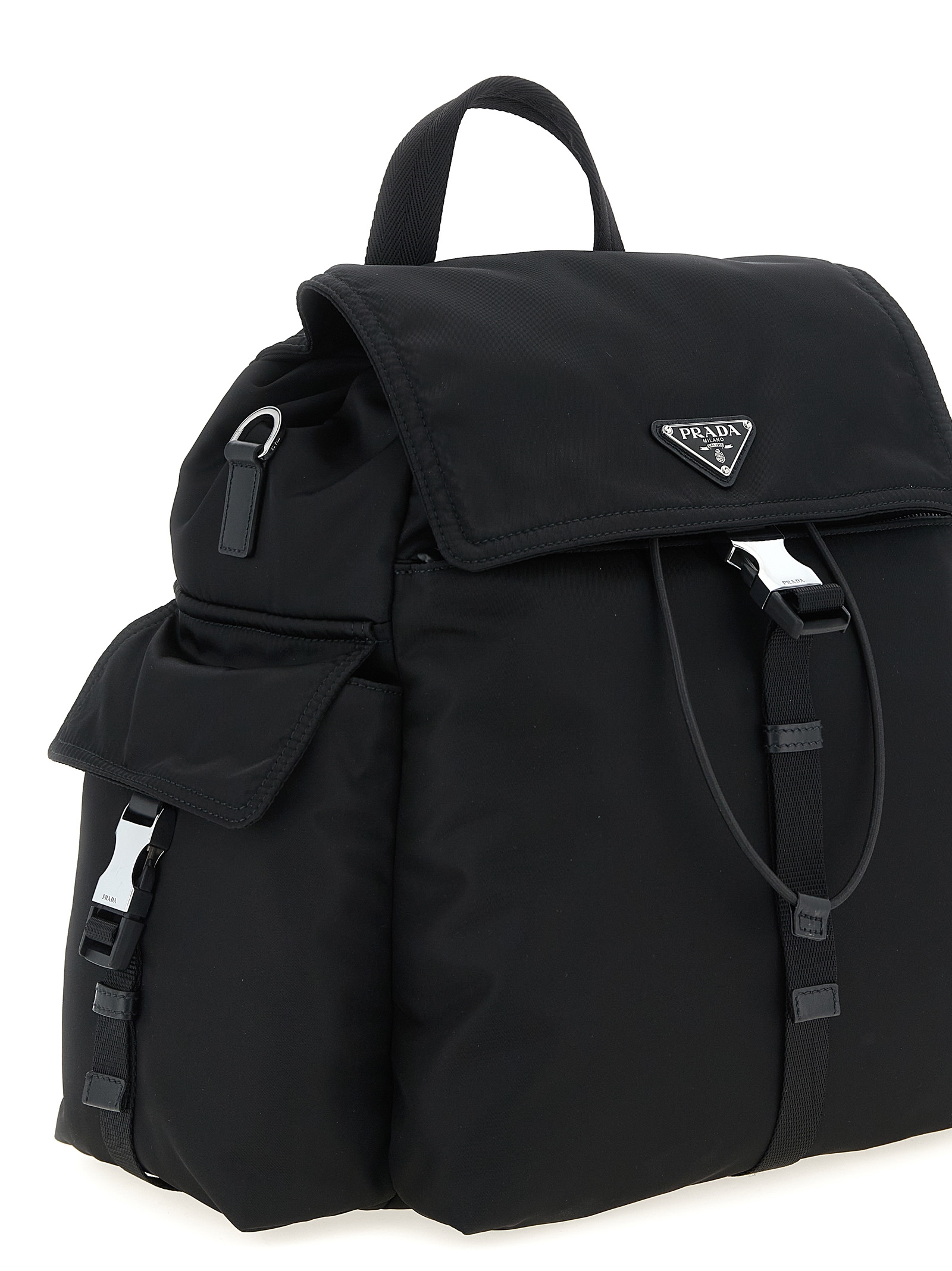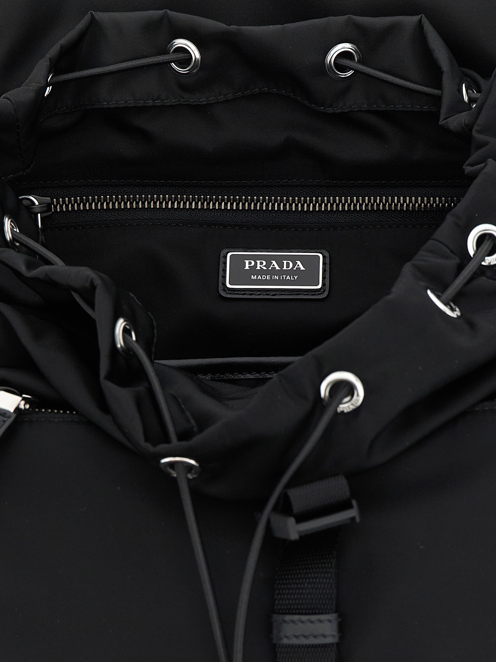 ‘Prada Explore’ Re-Nylon and leather backpack, multi-pocket silhouette, tape top handle, flap closure with tuc and front enameled metal triangle logo, removable padded handle, adjustable shoulder straps.