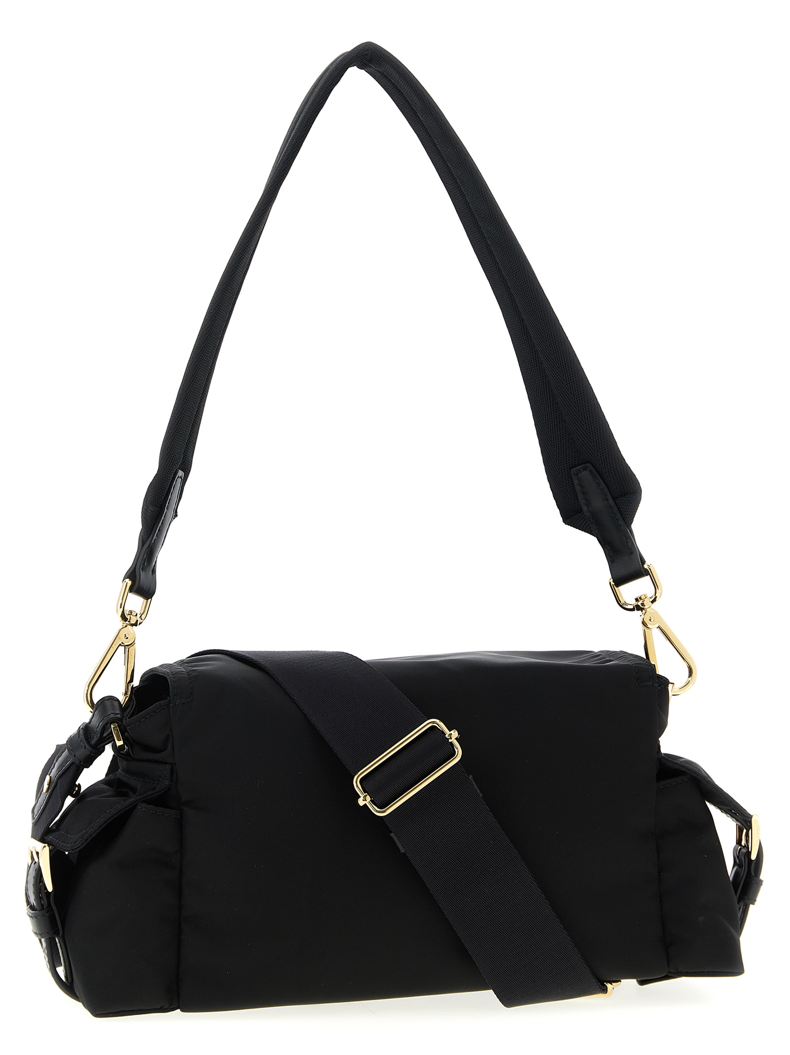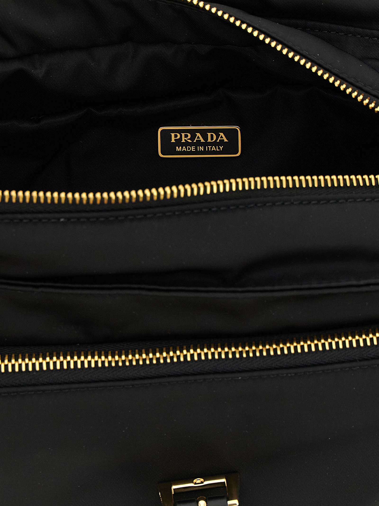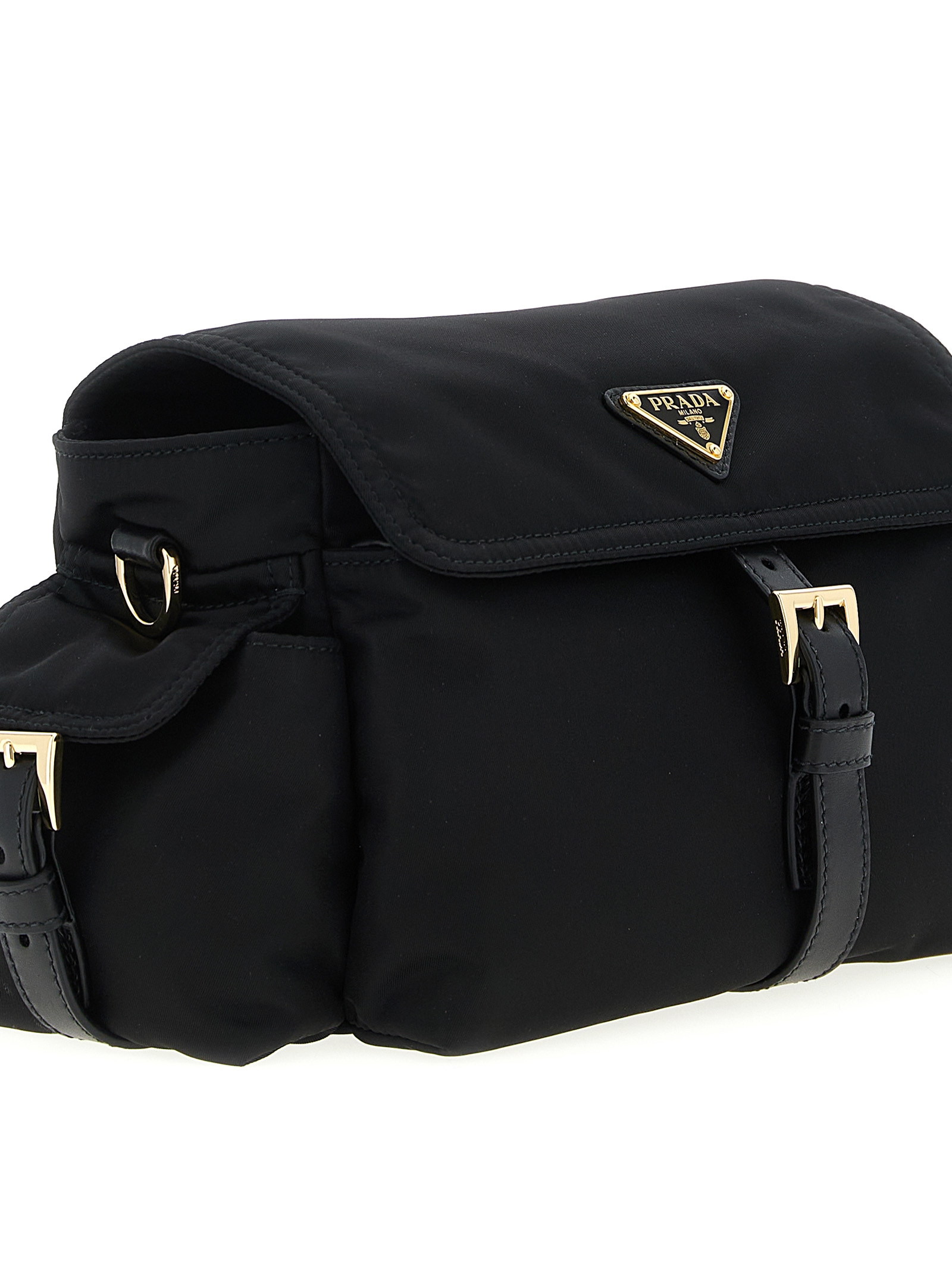 ‘Prada Explore’ shoulder bag in Re-Nylon and smooth leather, multi-pocket style, flap closure with front enameled metal triangle strap and logo, inner zip closure, slightly padded removable tape handle, adjustable and removable logo tape shoulder strap.