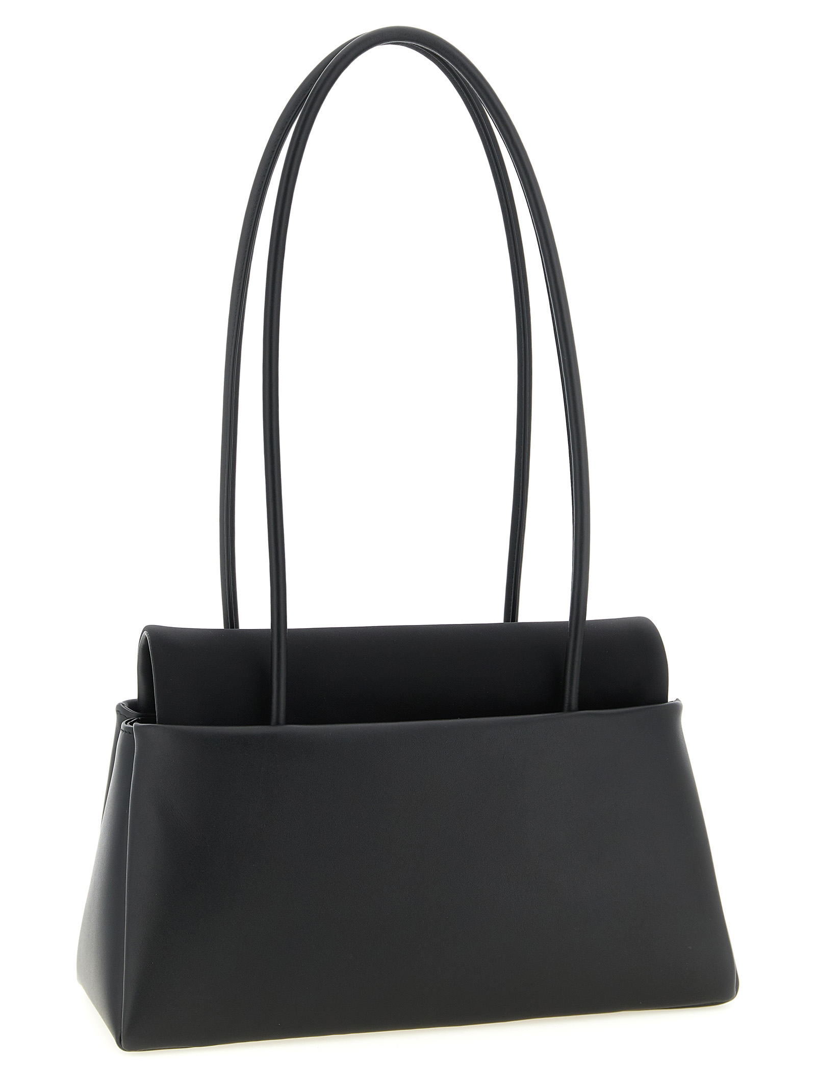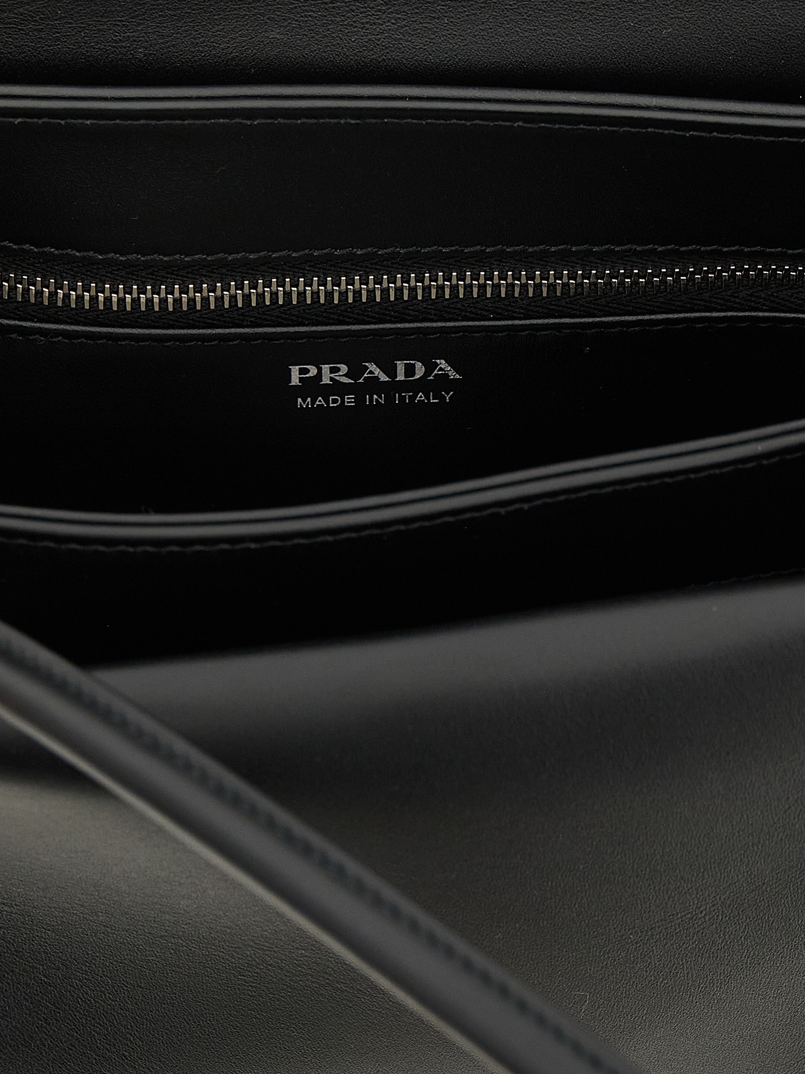 ‘Prada Passage’ smooth leather midi handbag, three inner compartment construction, magnetic flap closure with Re-Nylon flap and front enameled metal triangle logo, double fixed tubular handle, nappa lining.