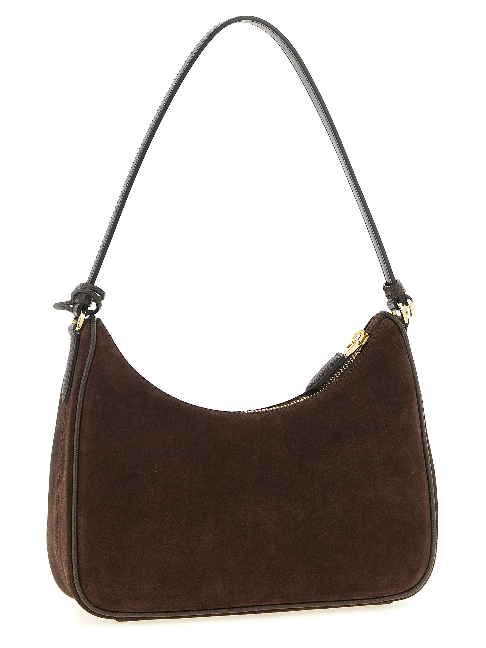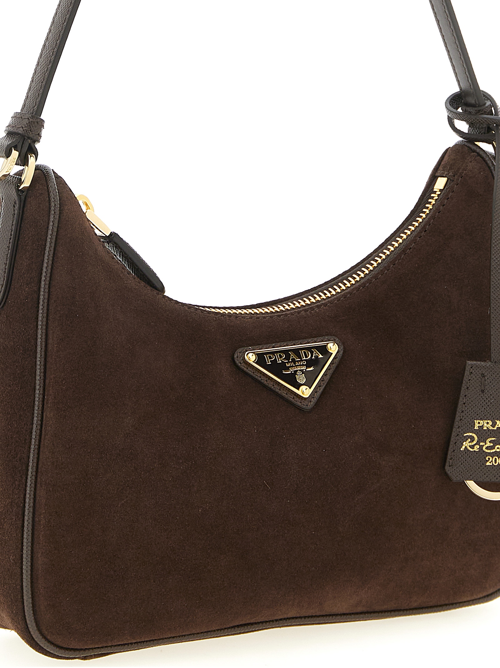 ‘Prada Re-Edition 2005’ mini shoulder bag in suede and Saffiano leather, front enameled metal triangle logo, top zip closure, fixed handle, signed nylon lining, removable keyring.
