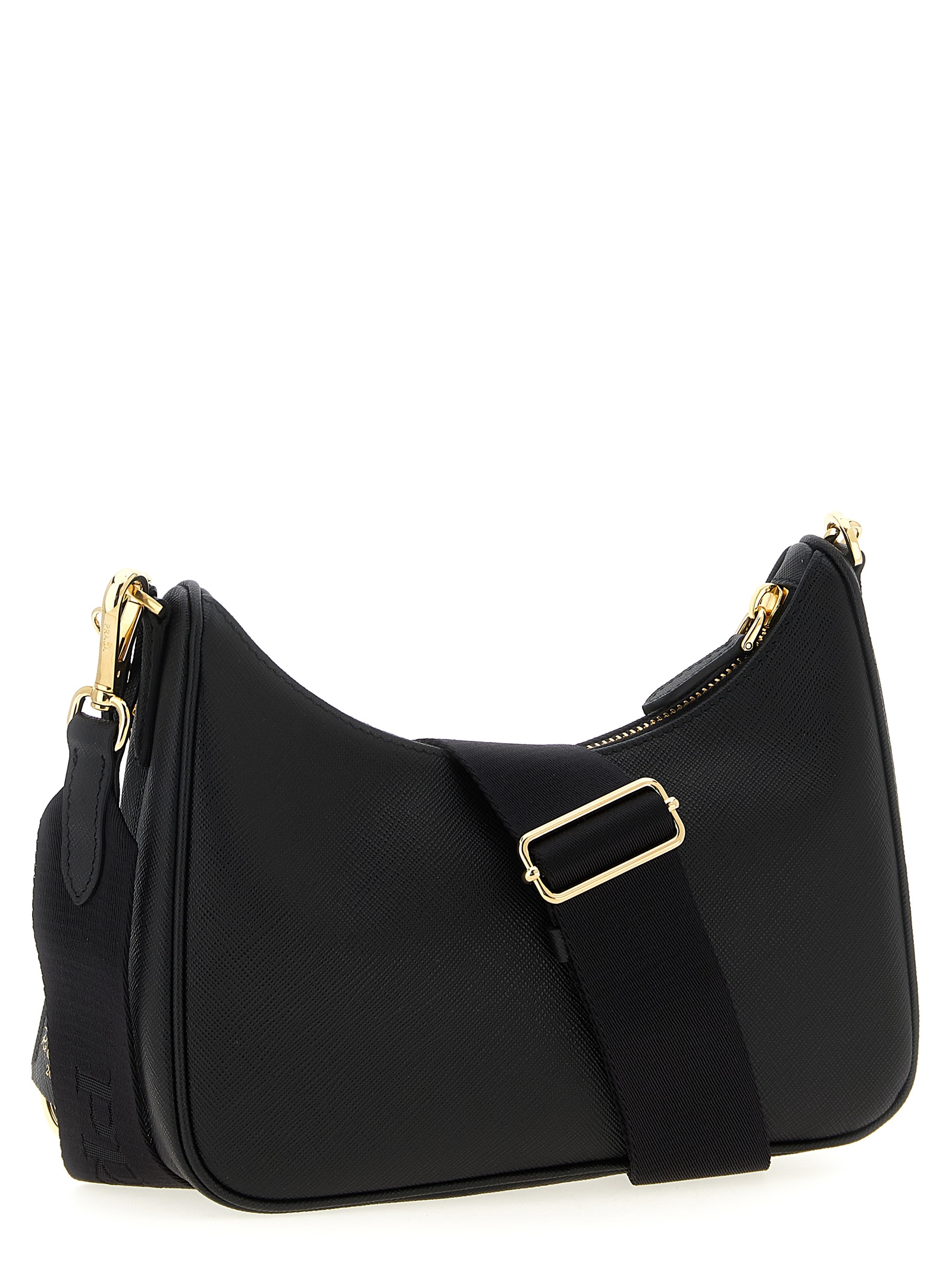 ‘Prada Re-Edition 2005’ shoulder bag in Saffiano leather with front enameled metal triangle logo, top zip closure, fabric shoulder strap with adjustable and removable jacquard logo, removable chain handle, removable pouch, removable leather and metal key ring.