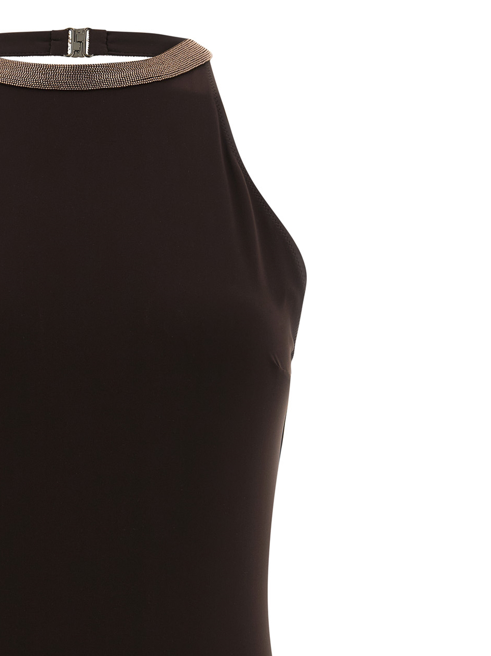 One-piece swimsuit in techno jersey, American neckline with ‘Precious Collar’ in ‘Monile’ and hook back closure, deep round neckline at the back, classic cover.