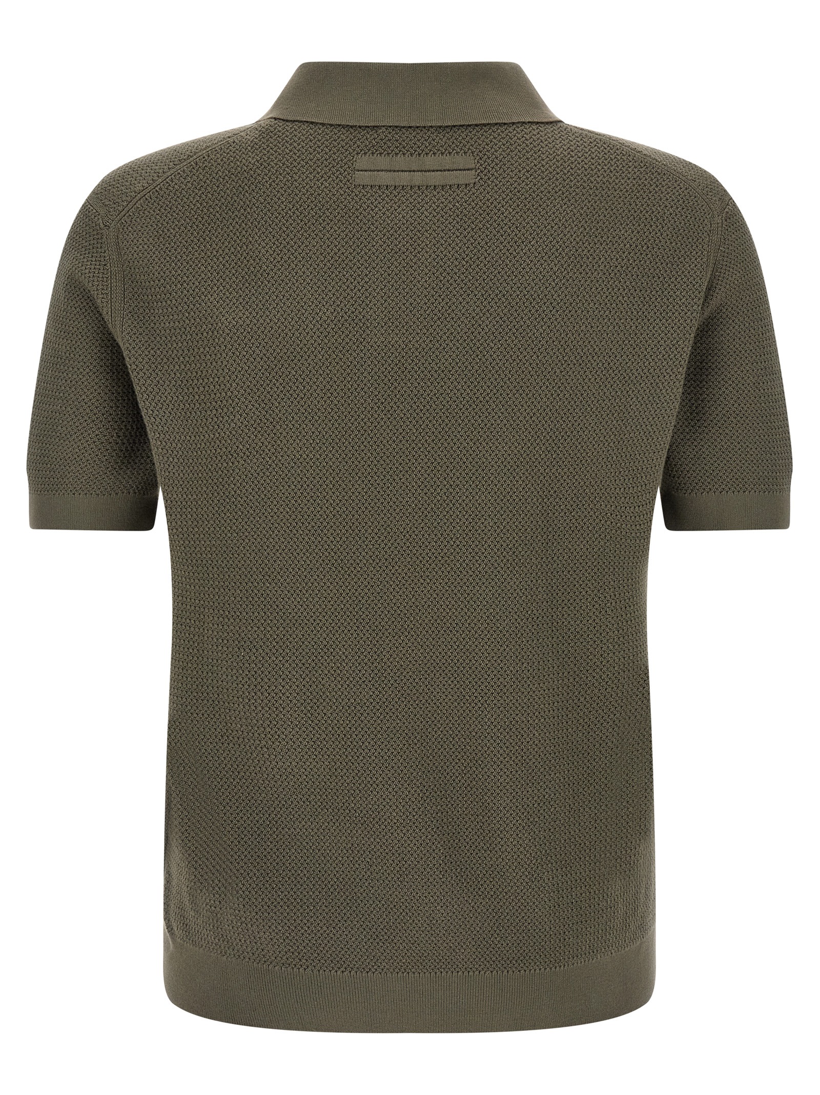 Premium cotton knitted polo shirt with open collar, short sleeves with cuffs, tone-on-tone fabric ‘Zegna 232 Road Brand Mark’ at the back, and headband.