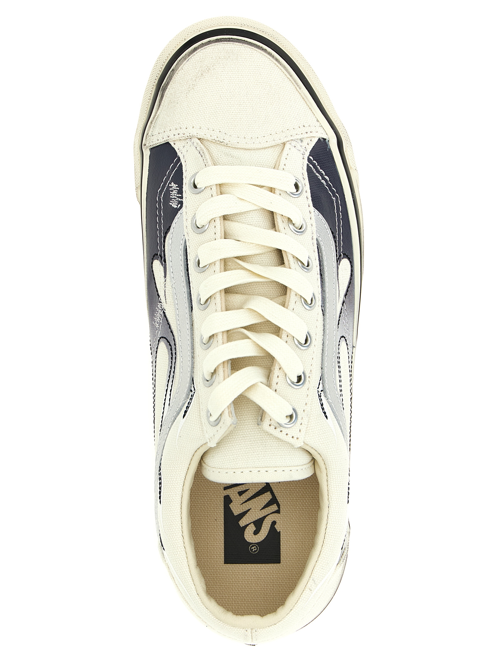 ‘Premium Old Skool 36’ canvas canvas sneakers with ‘Flames’ graphics and laminated leather detail, contrast stitching, vulcanized structure, low-top model, padded collar, higher sole sides, ribbon with original reinforcement in 90s Osnaburg, Sola Foam All-Day-Comfort (ADC) insole, midsole with used effect finish, iconic Sidestripe™. Rubber waffle sole.