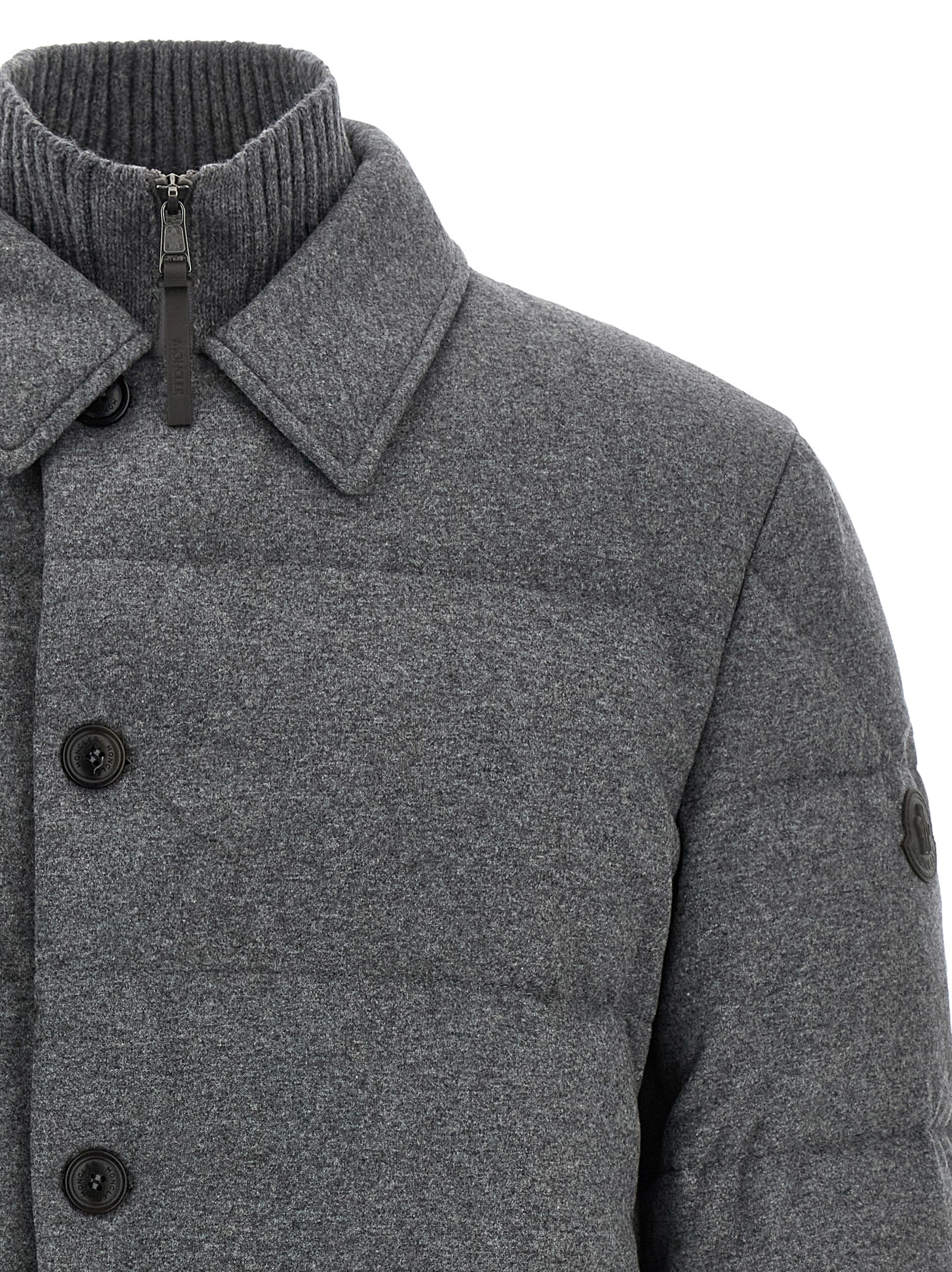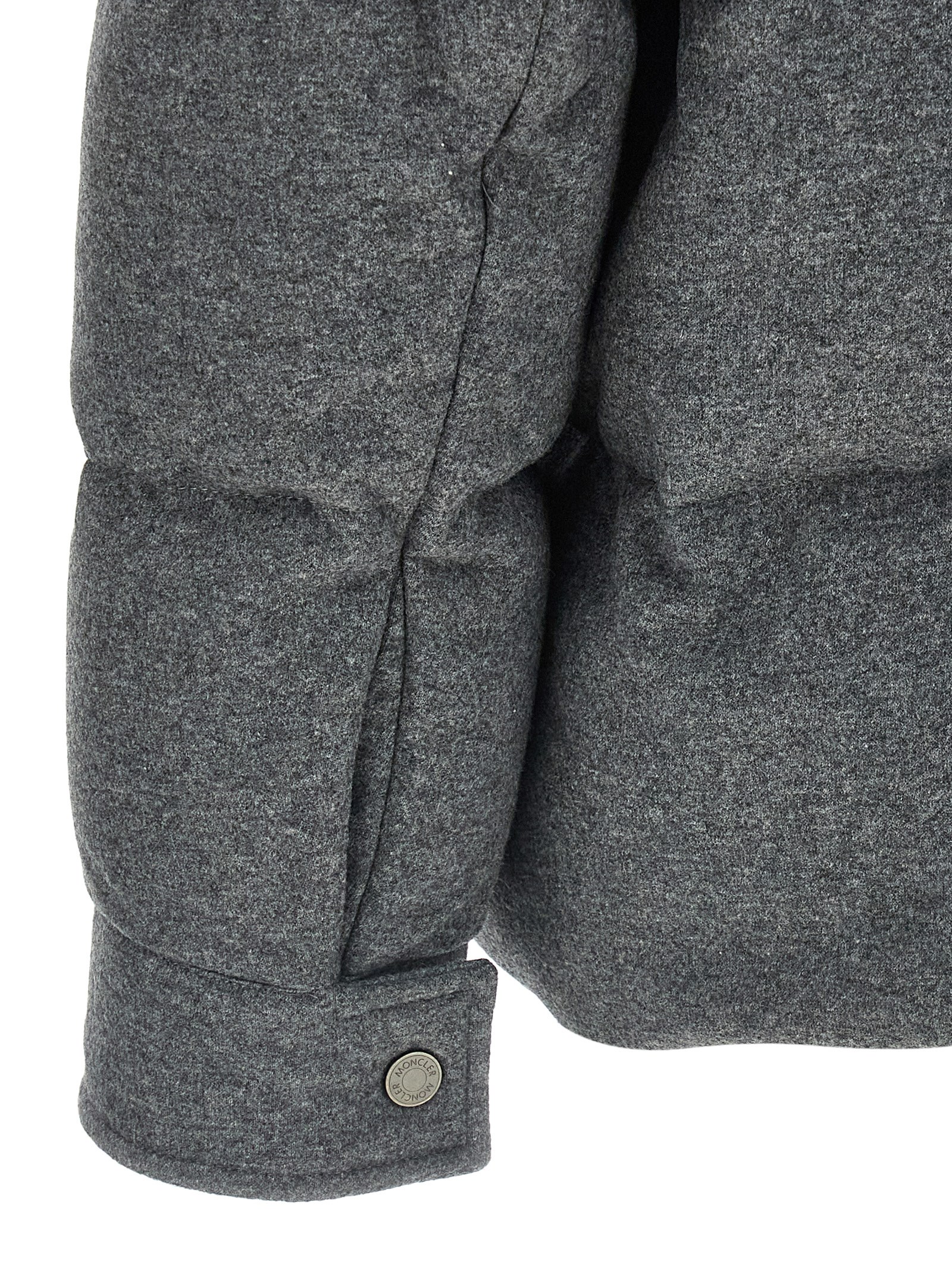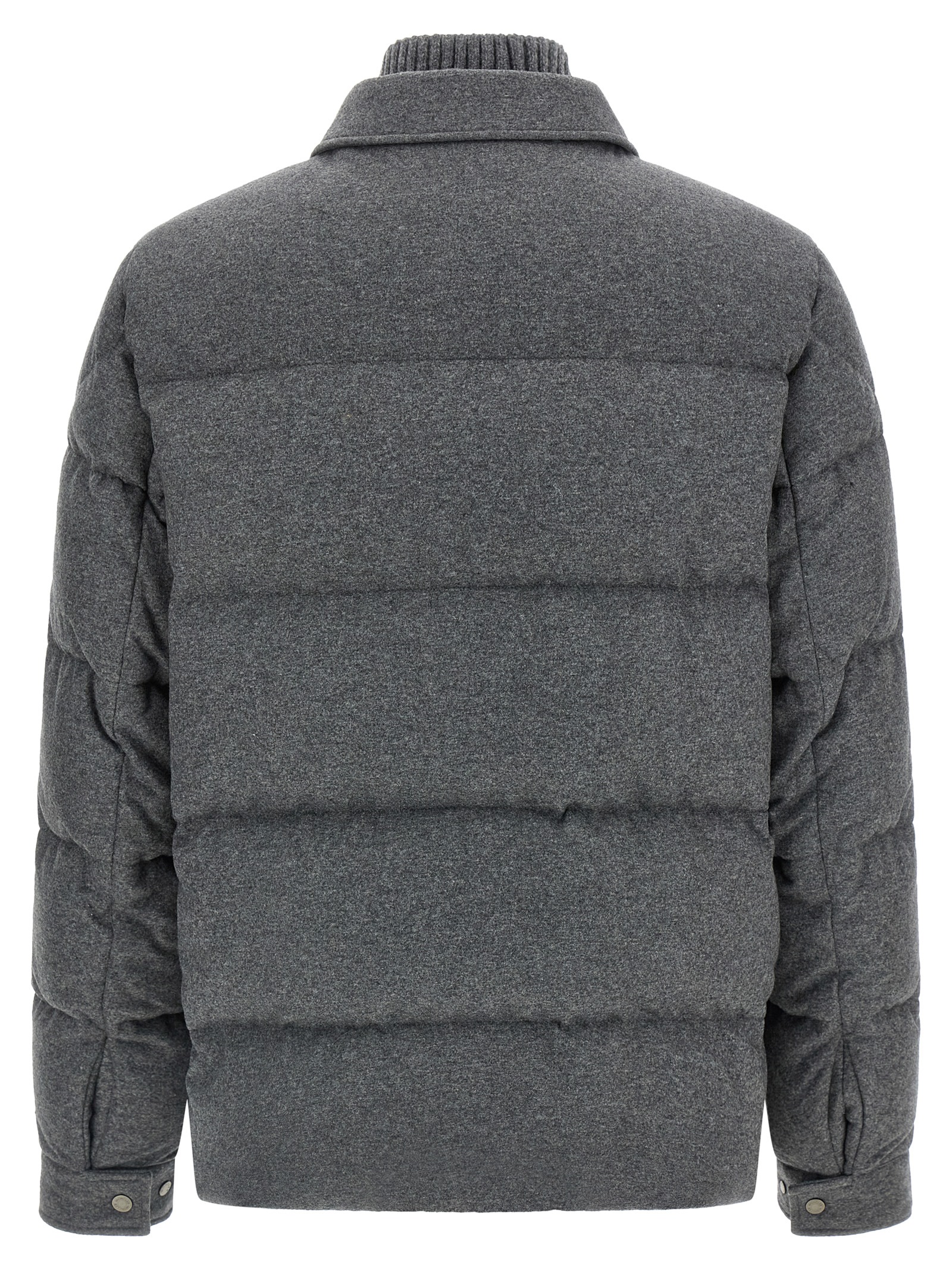 ‘Pres’ short down jacket in smart nylon and quilted cashmere blend with goose down padding, shirt collar with knitted high-neck insert, front zip and button closure, pockets, long cuffed sleeves and tone-on-tone leather logo patch.