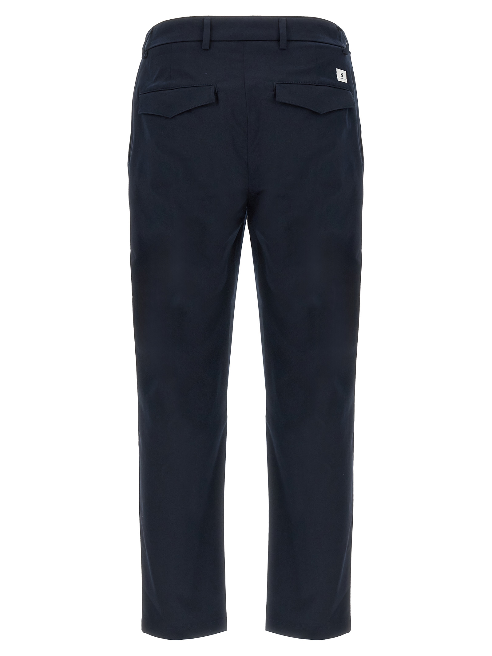 ‘Prince’ stretch cotton pants, crop model, stretched pleat, front zip and button closure, pockets, back logo patch.