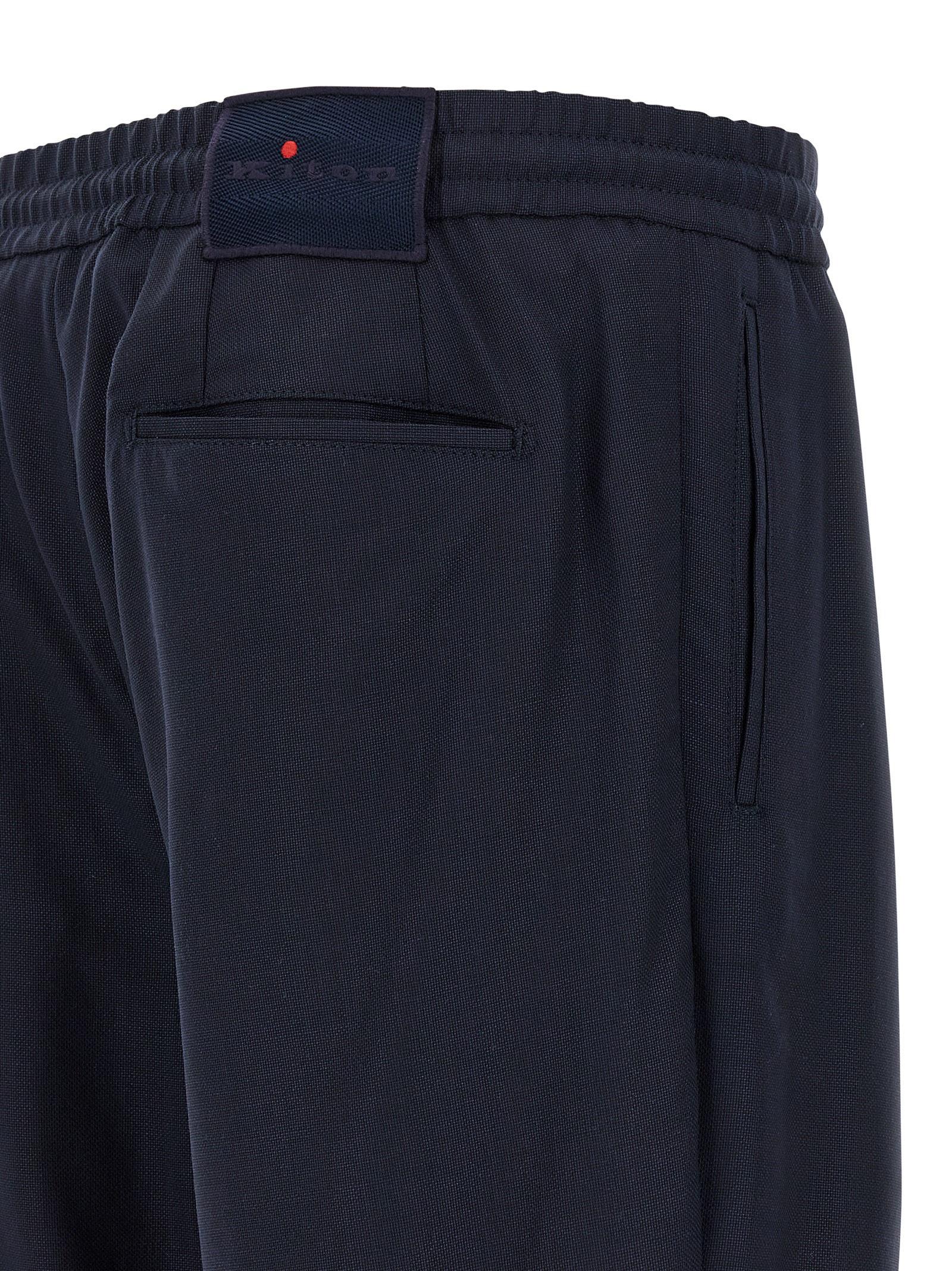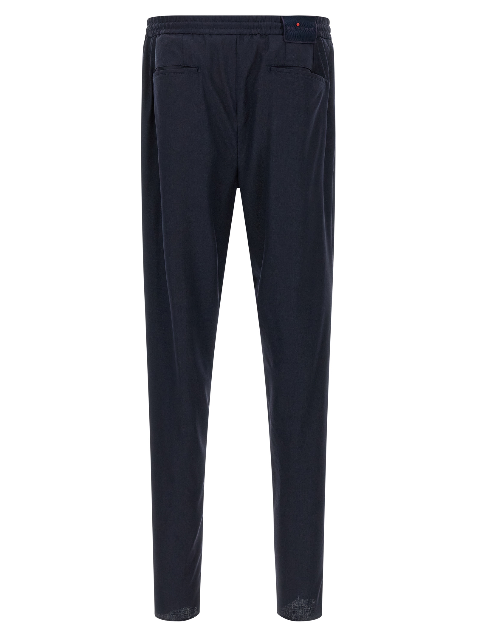 ‘Pull-on’ light wool pants, front closure with logo buttons, elastic waistband with adjustable drawstring, pleats, side pockets.