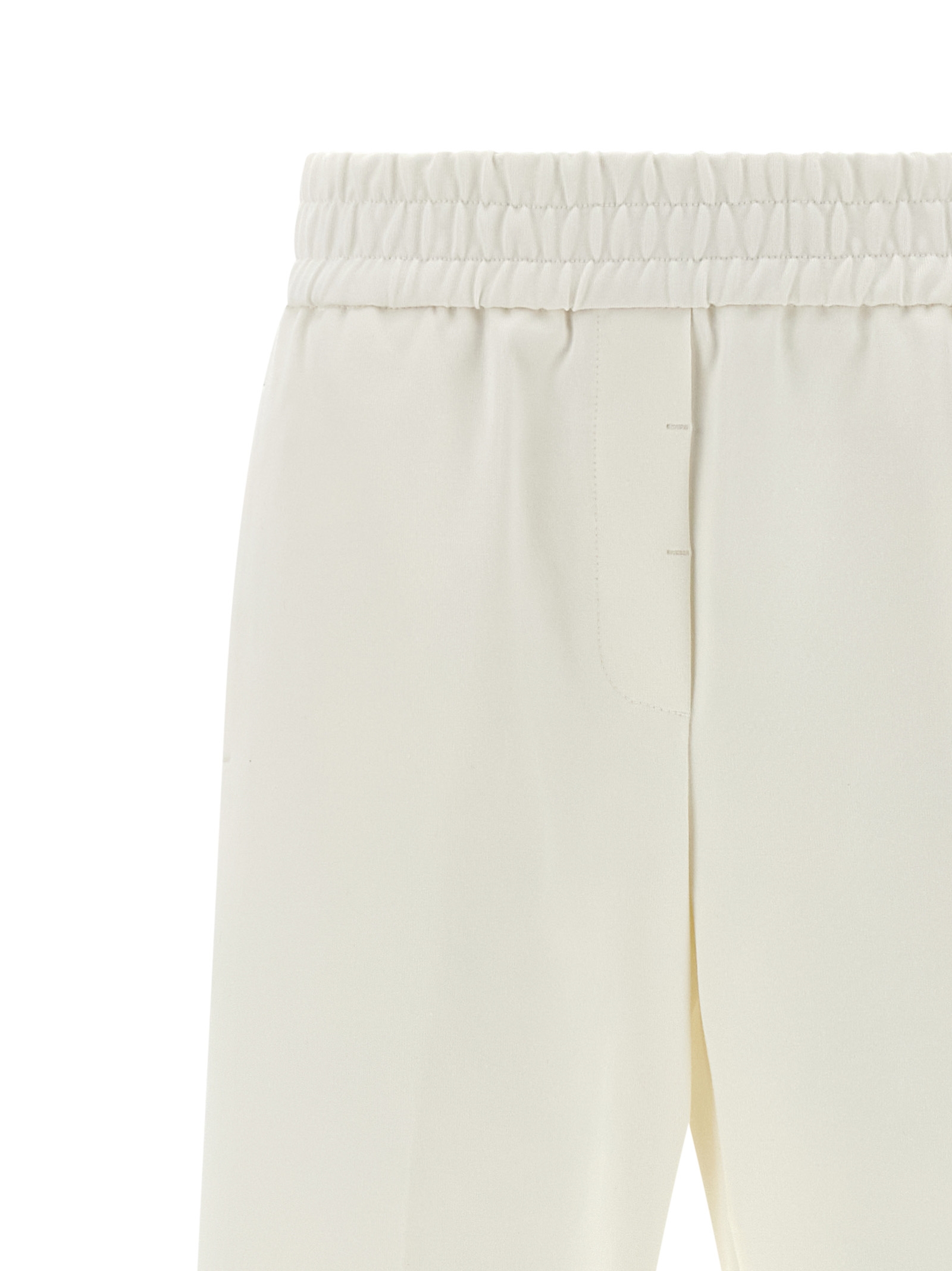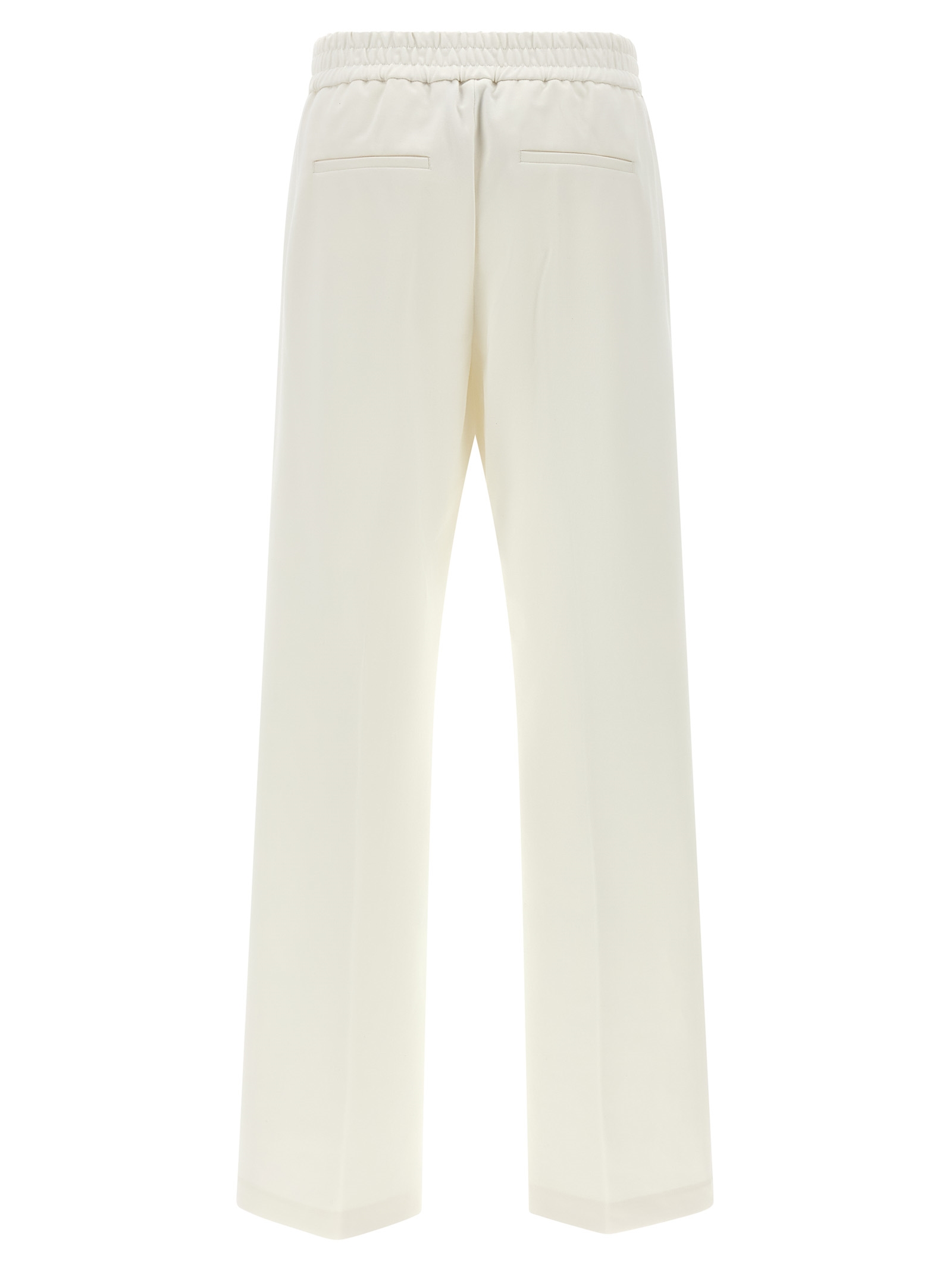 Stretch cotton blend jersey pants with side metal ‘Punto Luce’ details, wide and straight leg, stretched pleat, elastic waistband, trompe l’oeil flap, pockets.