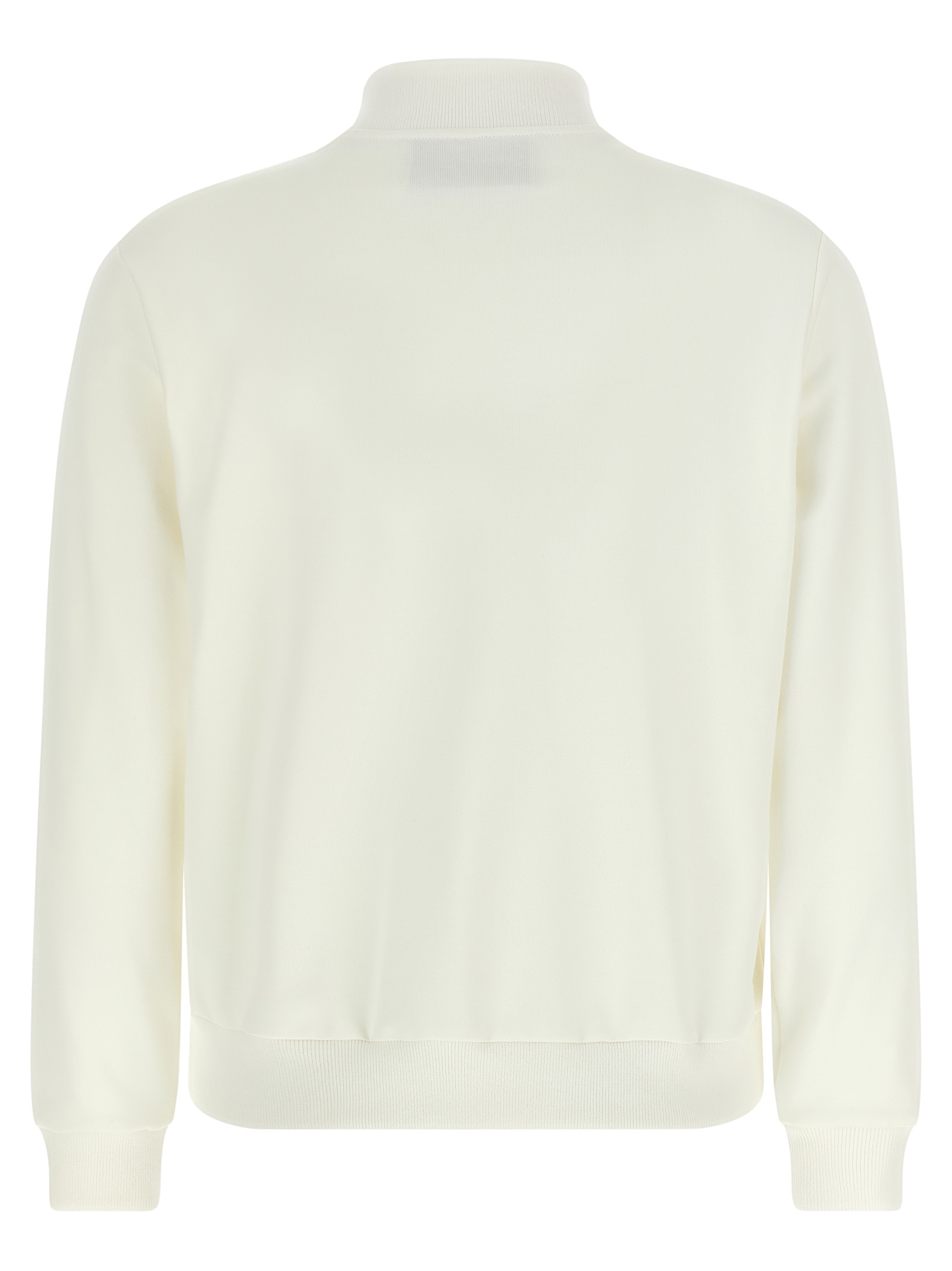 Stretch cotton jersey sweatshirt with ribbed knit details, high neck, front zip closure, pockets with metal ‘Punto Luce’ detail, long cuffed sleeves, and headband.