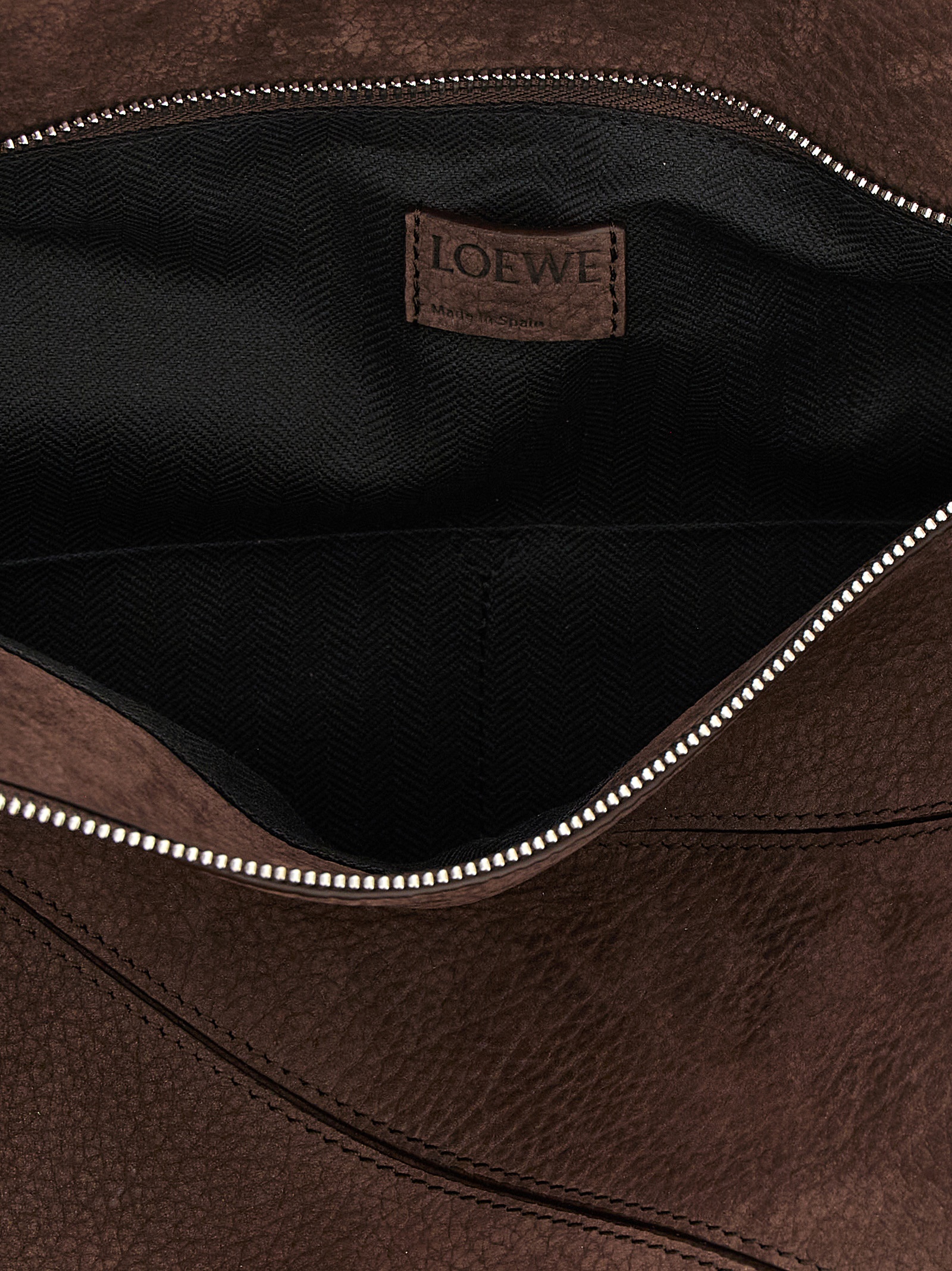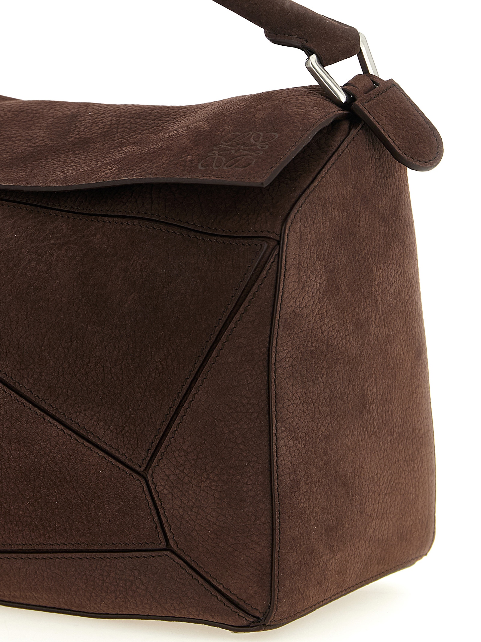 Large ‘Puzzle Edge’ shoulder bag in hammered nubuck, classic construction for overlapping panels with single-line stitching, fixed handle, flap closure with embossed Anagram logo and hidden zip underneath, back zip pocket, herringbone cotton canvas lining, adjustable and removable shoulder strap.