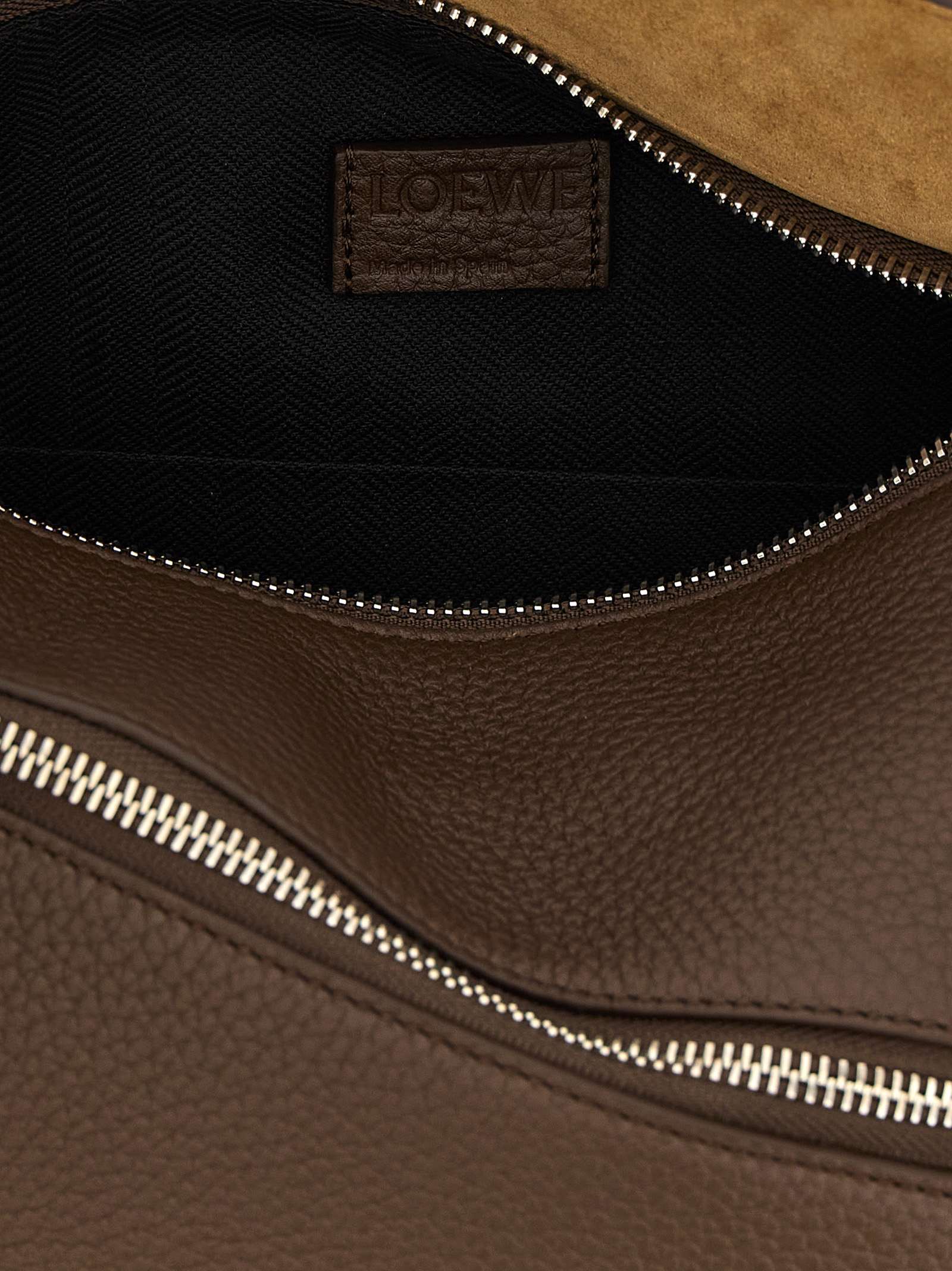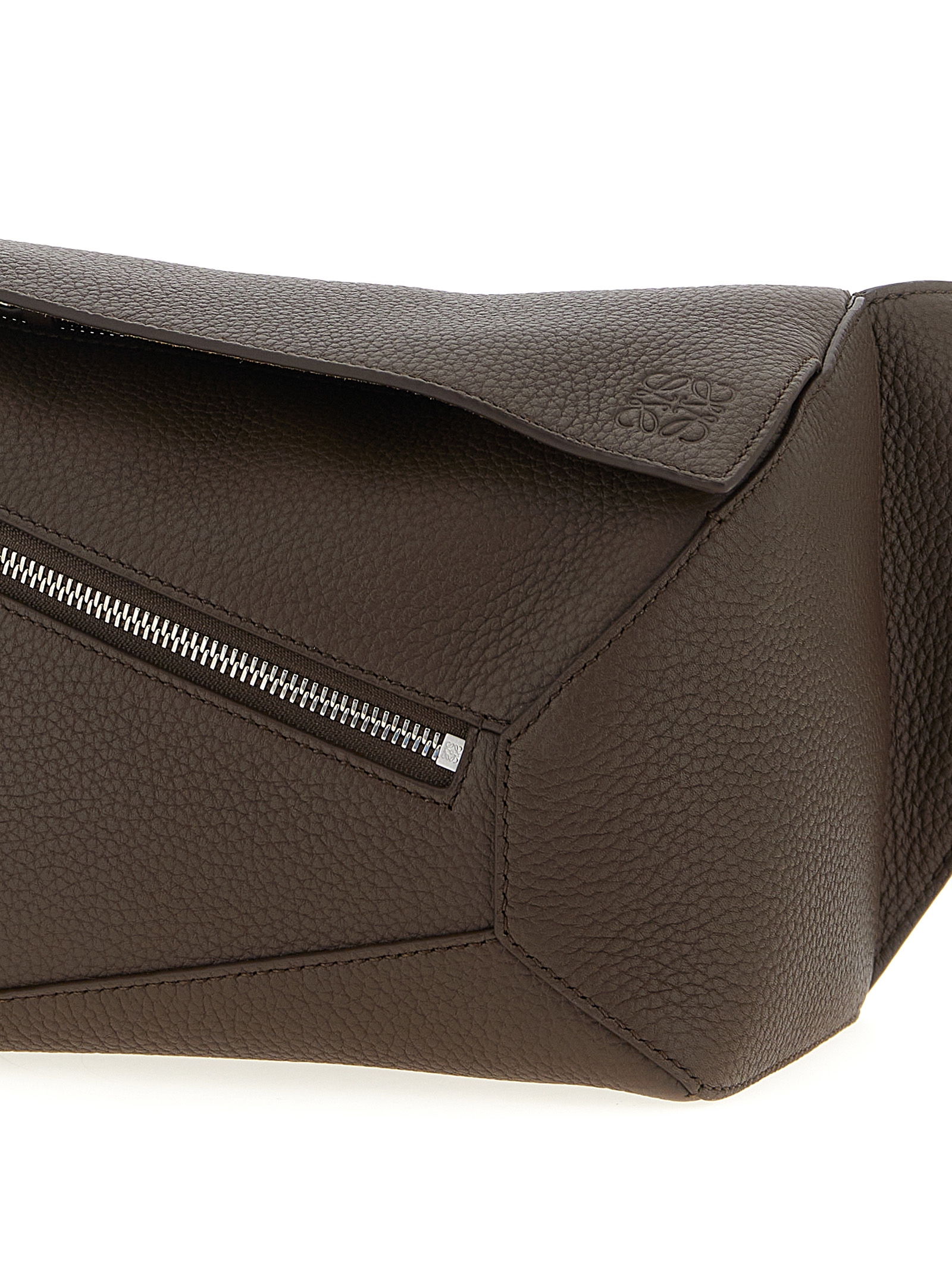 Small ‘Puzzle Edge’ grenade calf leather waist bag, classic overlapping panel construction with single-line stitching, flap closure with embossed Anagram logo and concealed zip underneath, front zip pocket, herringbone cotton canvas lining, adjustable shoulder strap with tuc closure.