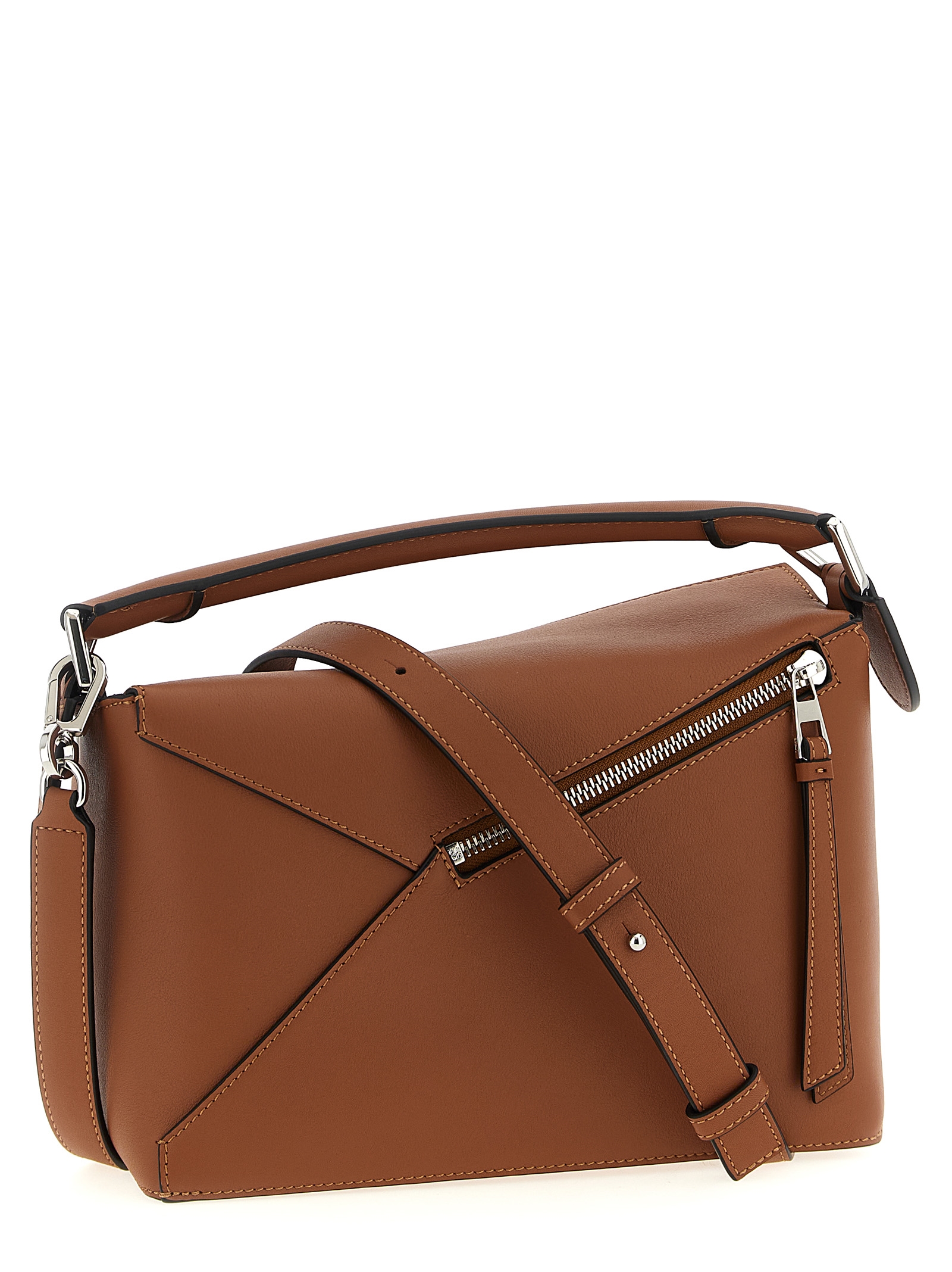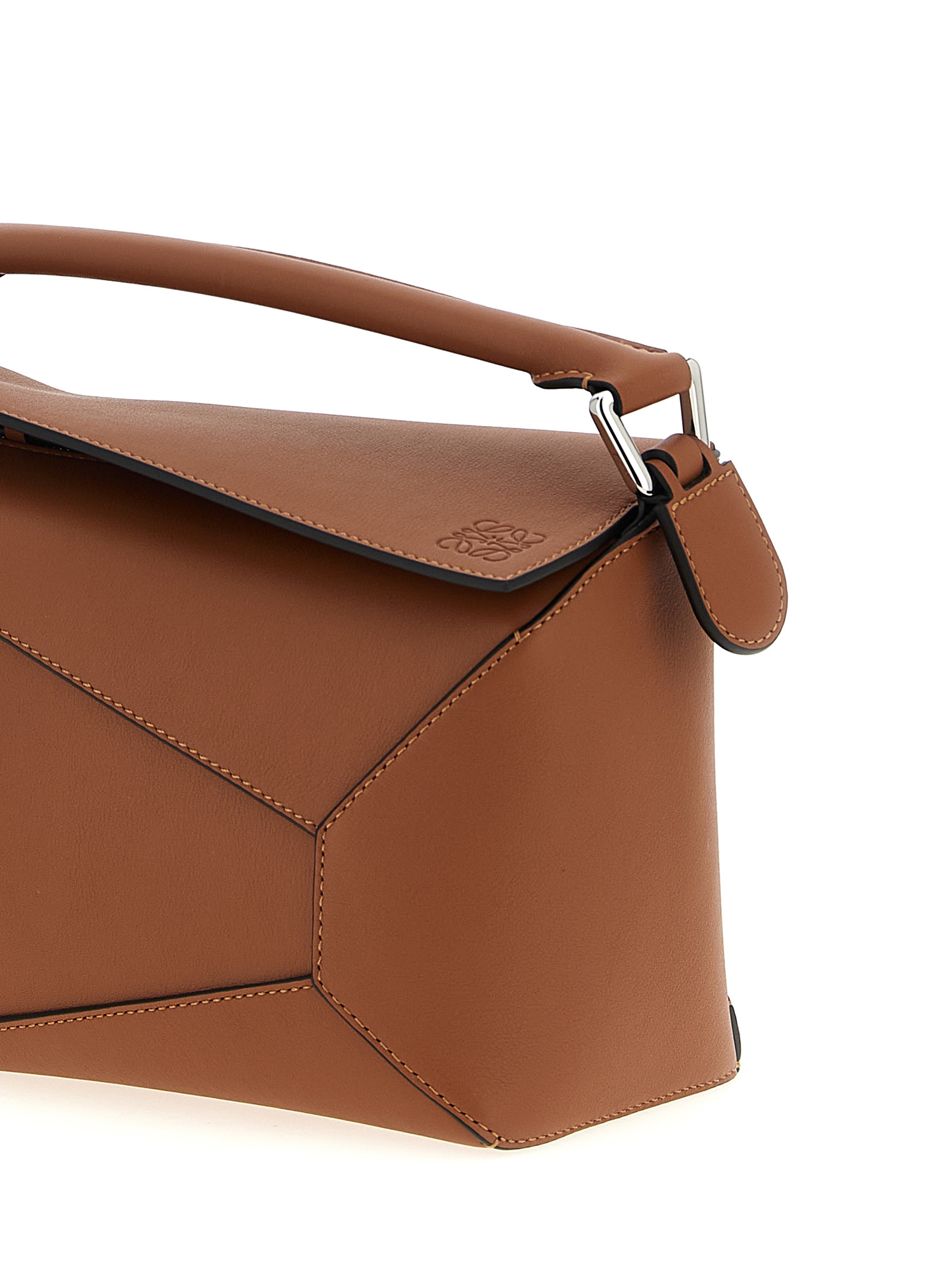 Small ‘Puzzle Edge’ smooth calf leather handbag, classic construction for overlapping panels with single-line stitching, fixed handle, flap closure with embossed Anagram logo and hidden zip underneath, back zip pocket, herringbone cotton canvas lining, adjustable and removable shoulder strap.