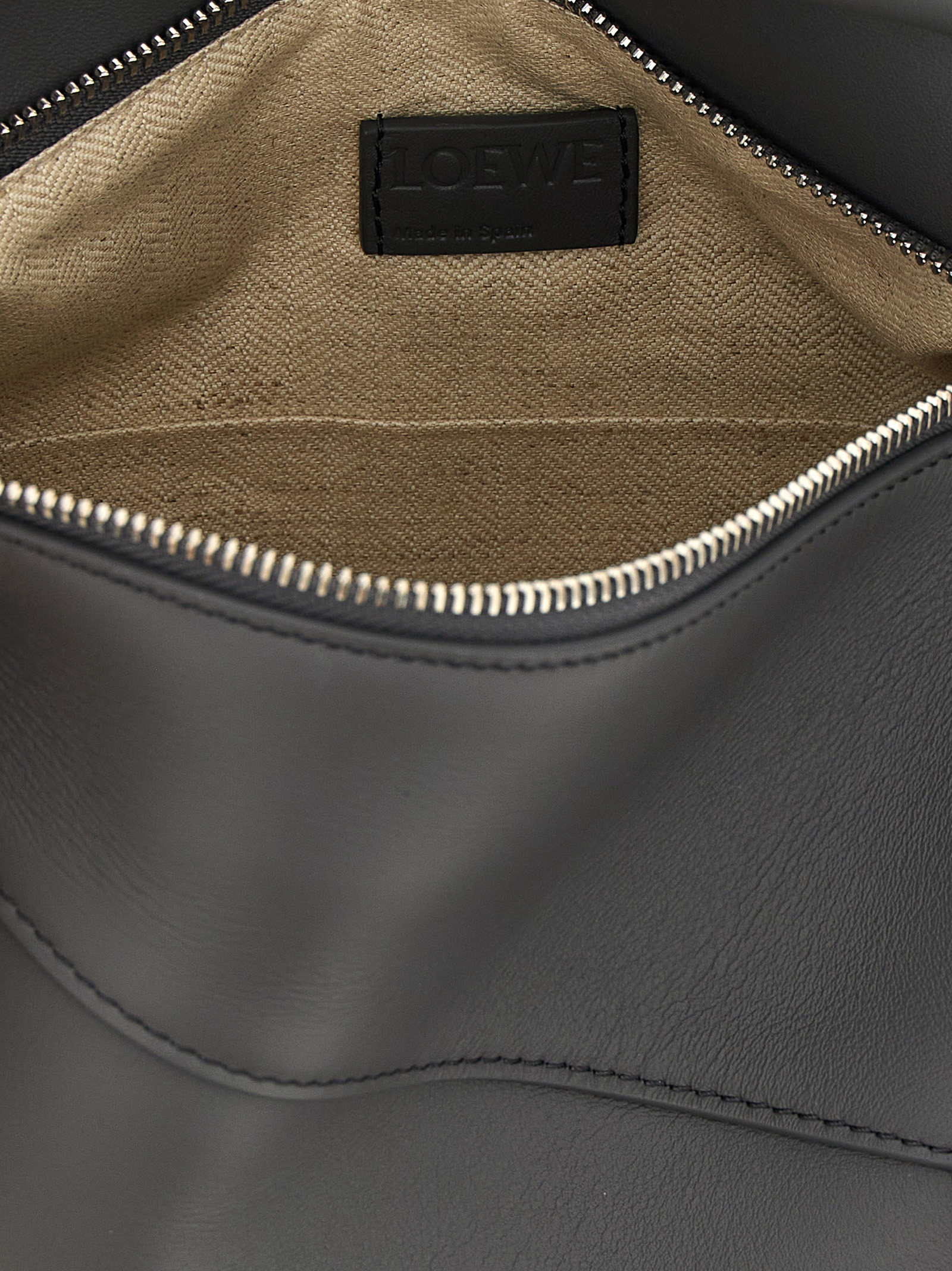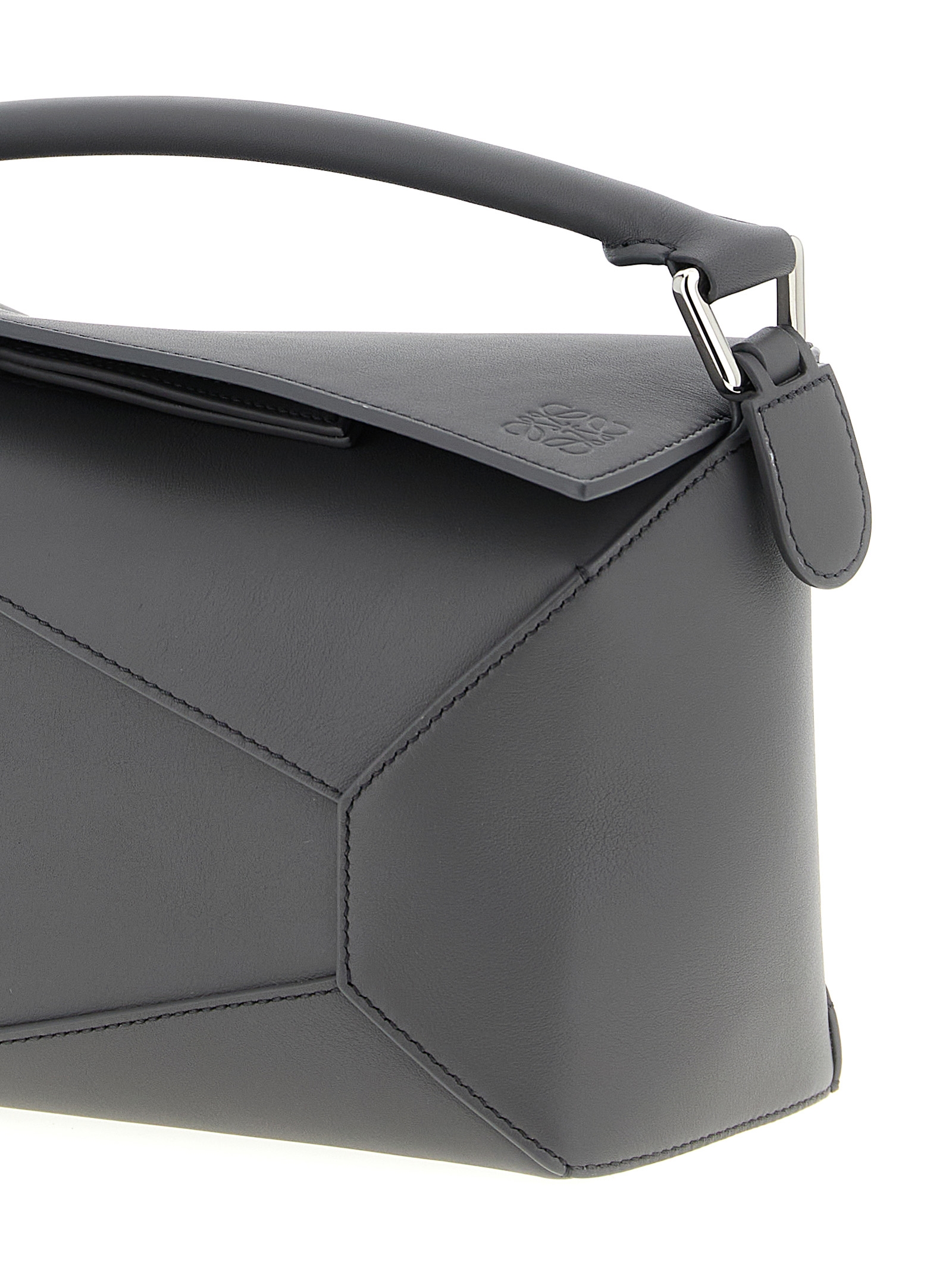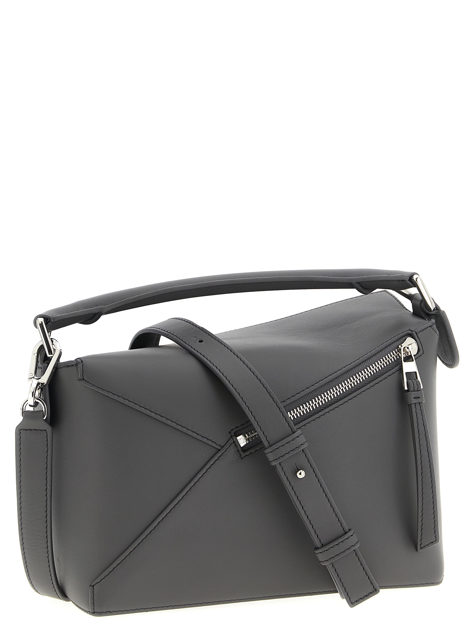 Small ‘Puzzle Edge’ smooth calf leather handbag, classic construction for overlapping panels with single-line stitching, fixed handle, flap closure with embossed Anagram logo and hidden zip underneath, back zip pocket, herringbone cotton canvas lining, adjustable and removable shoulder strap.