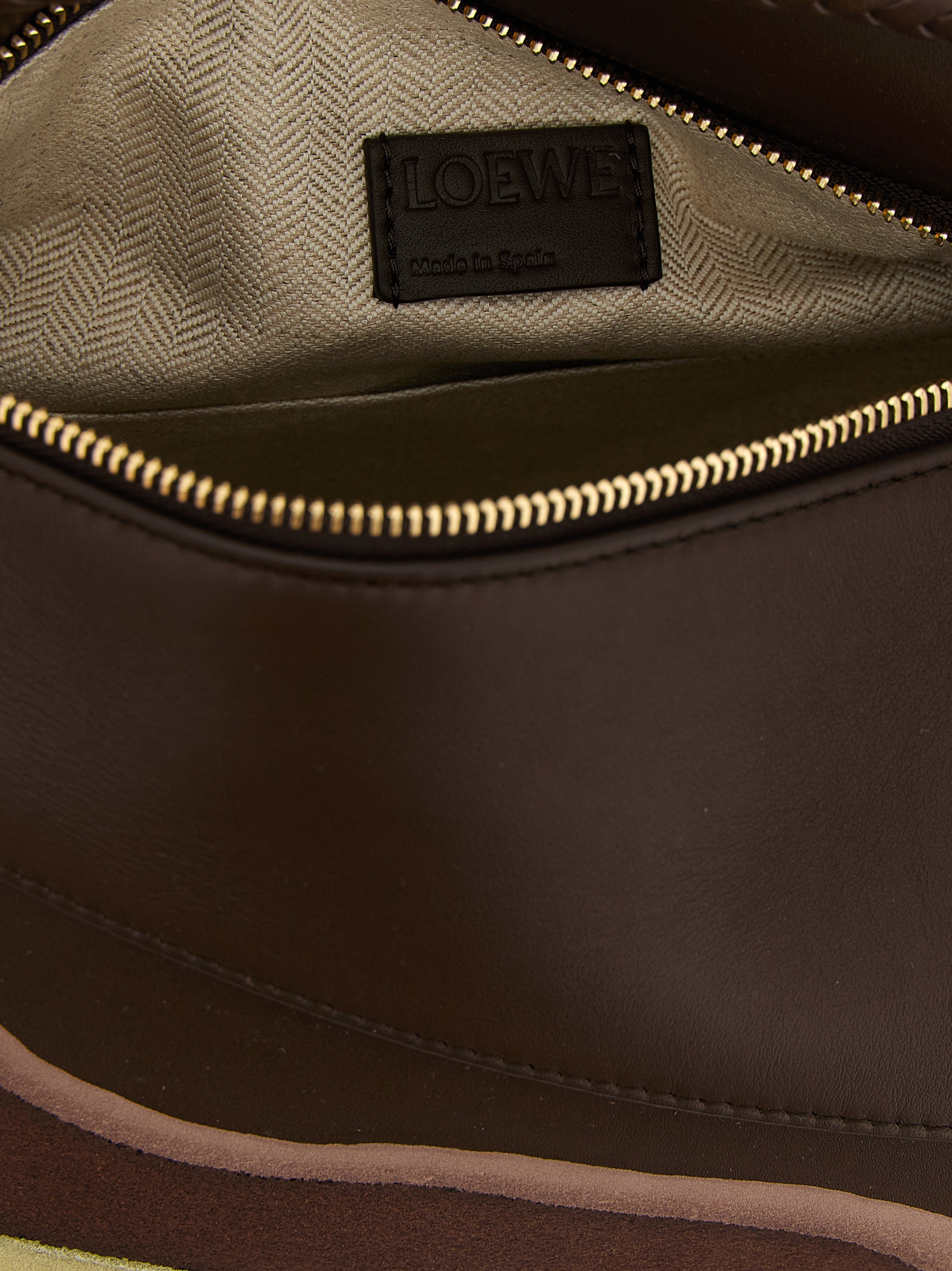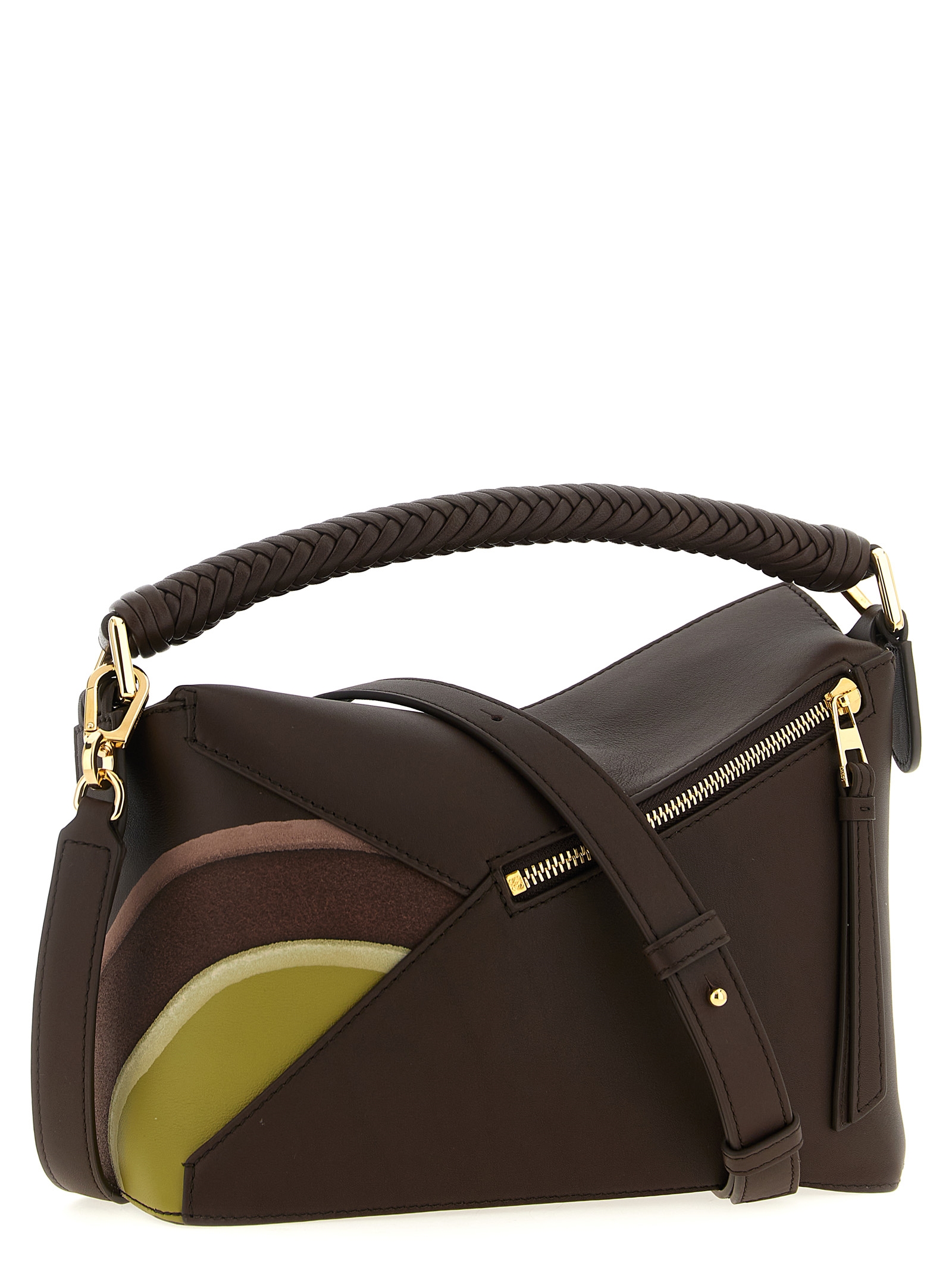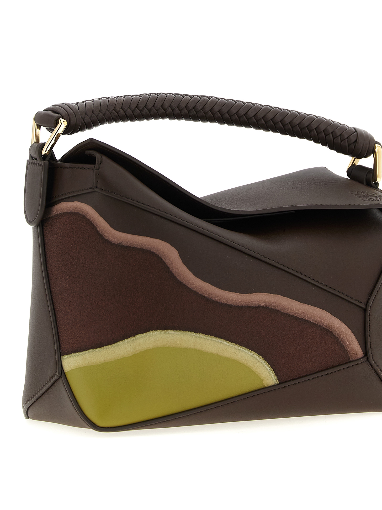Small ‘Puzzle Edge’ handbag in calf nappa leather and suede, classic construction for overlapping panels with single-line stitching, fixed woven handle, flap closure with embossed logo and hidden zip underneath, back zip pocket, adjustable and removable shoulder strap.
