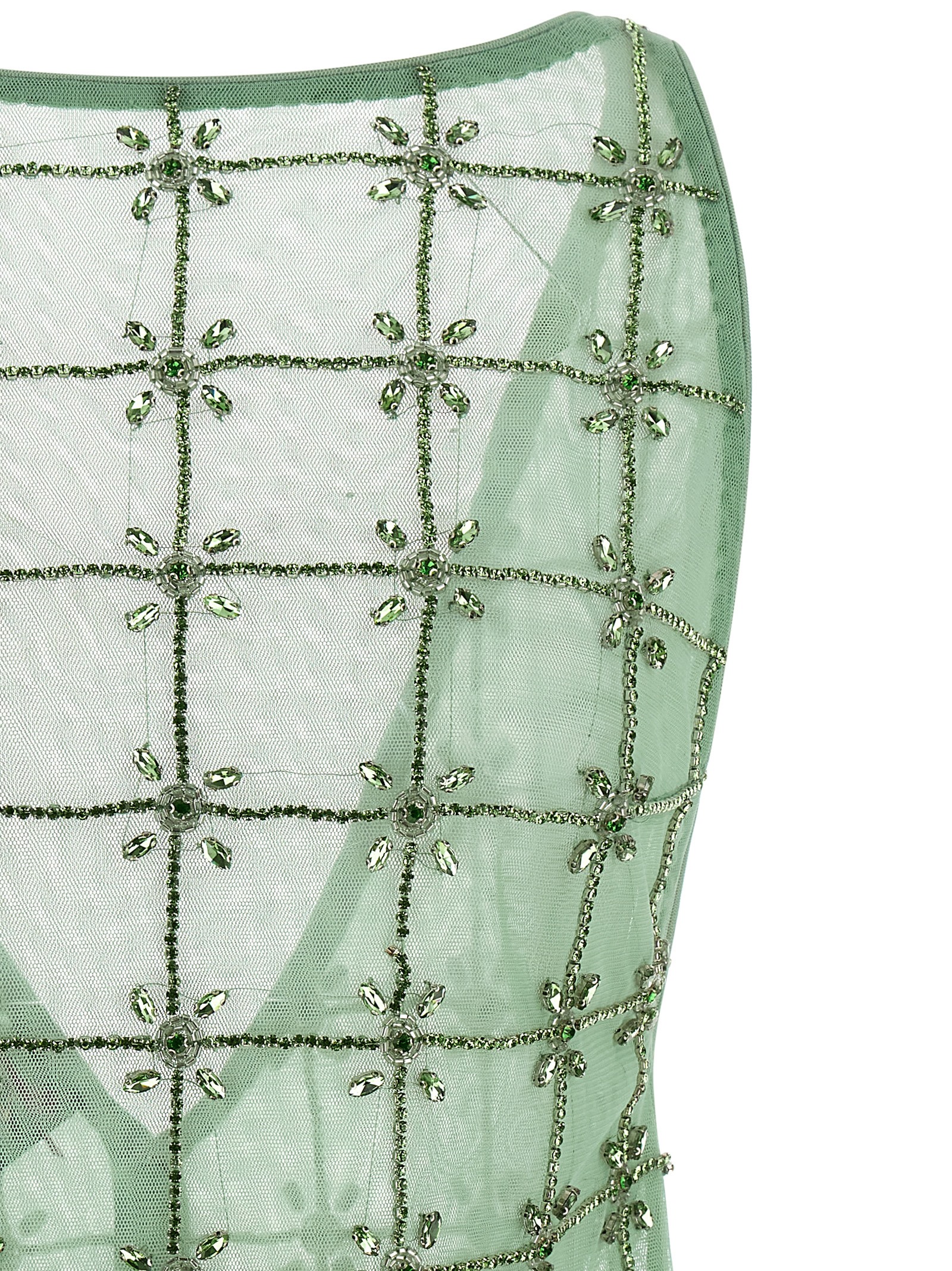 ‘Quandong’ tulle, rhinestone embroidery and all-over beads, boat neck with deep back neckline, back closure with hidden zip, sleeveless.