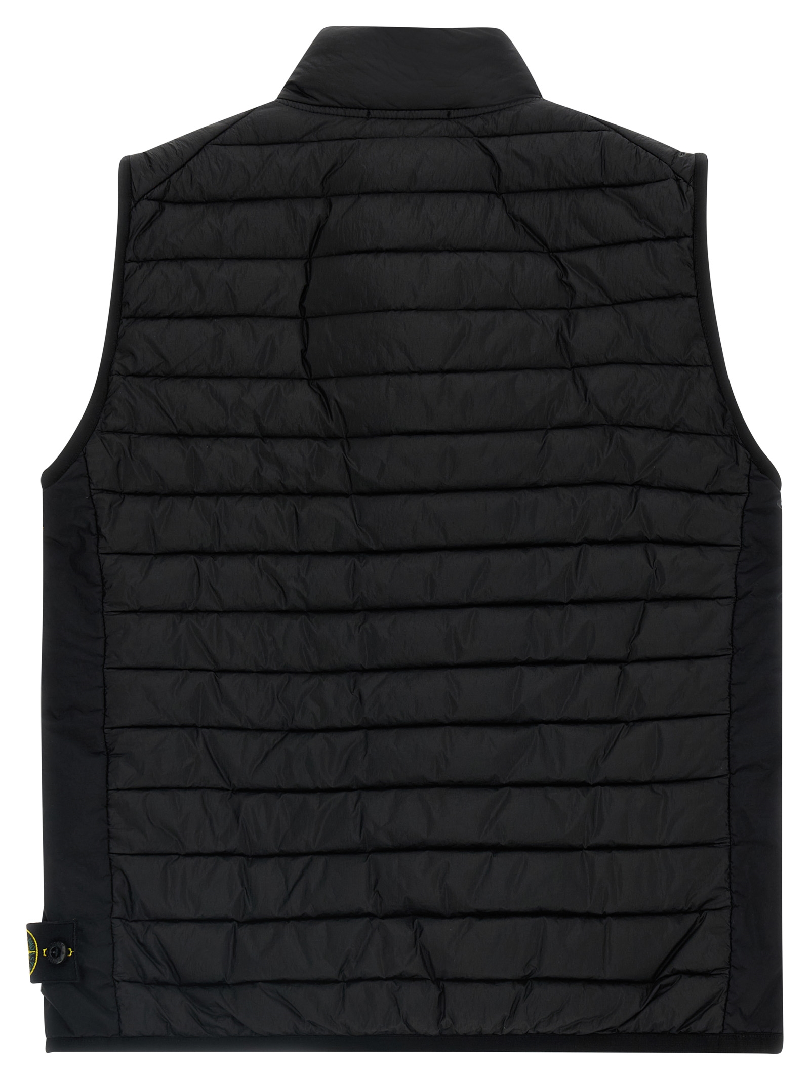 Quilted and slightly padded nylon vest with wrinkled effect, standing collar, front zip closure, side logo badge, elastic hem.
