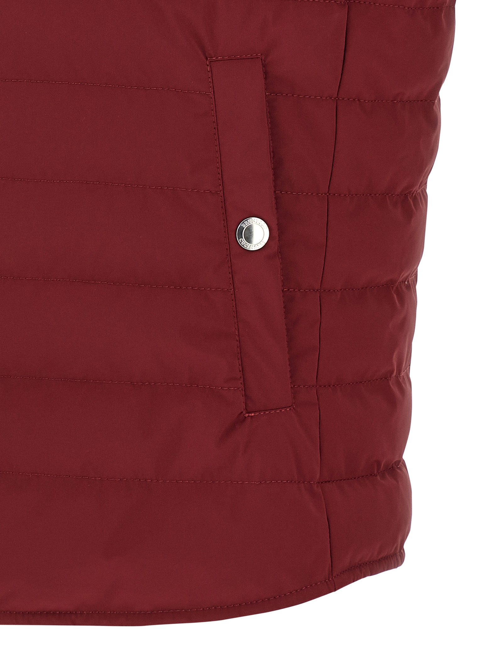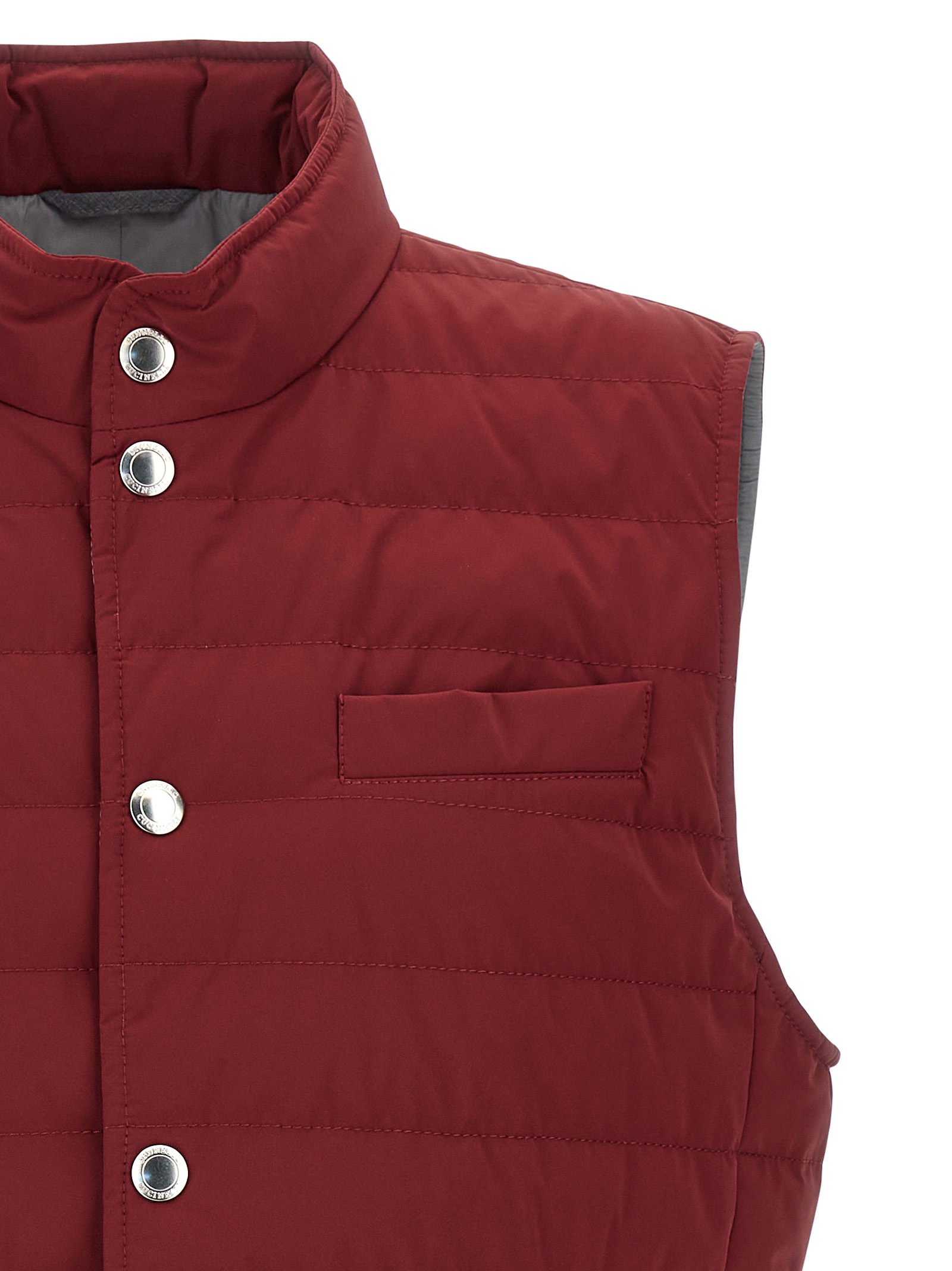 Vest in quilted water-repellent technical fabric slightly padded with goose down, high neck, front snap button closure, pockets.