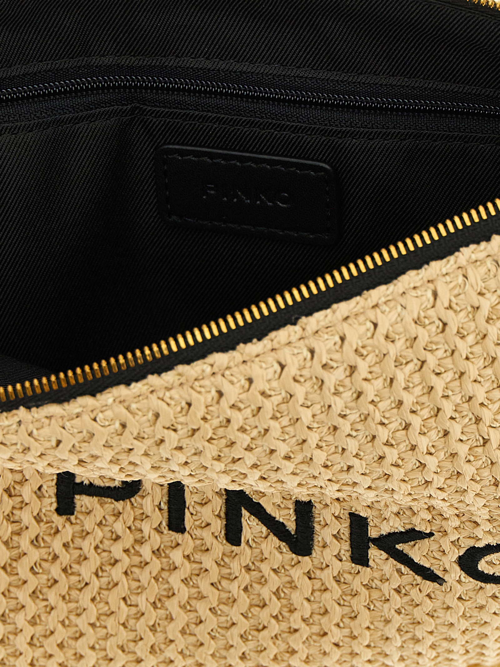 Braided raffia-effect fabric clutch bag, tone-on-tone fringes at the edges, contrasting logo lettering embroidery on the front, top zip closure, lining, and an inner pocket.