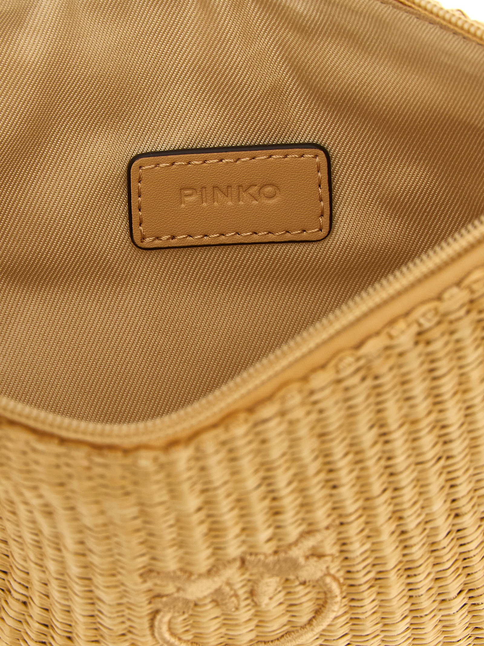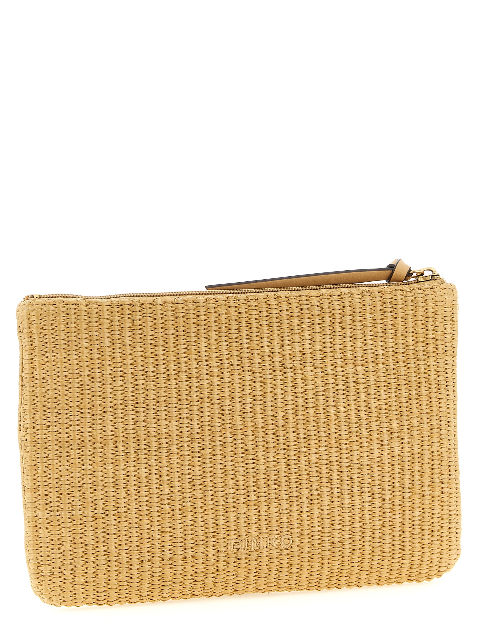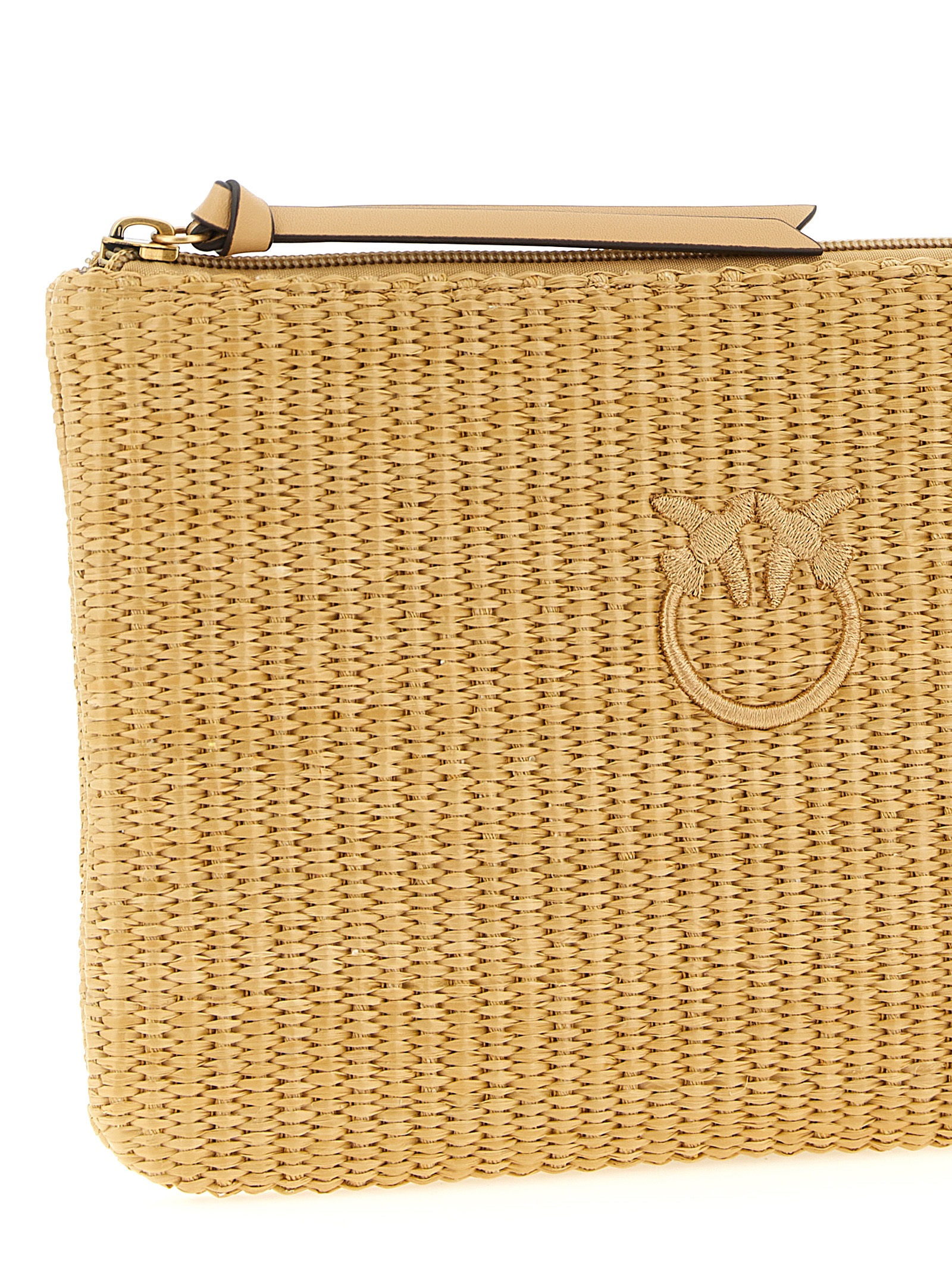 Braided raffia-effect fabric clutch bag, front tonal ‘Love Birds’ embroidery, top zip closure, cotton drill lining, and inner pocket.