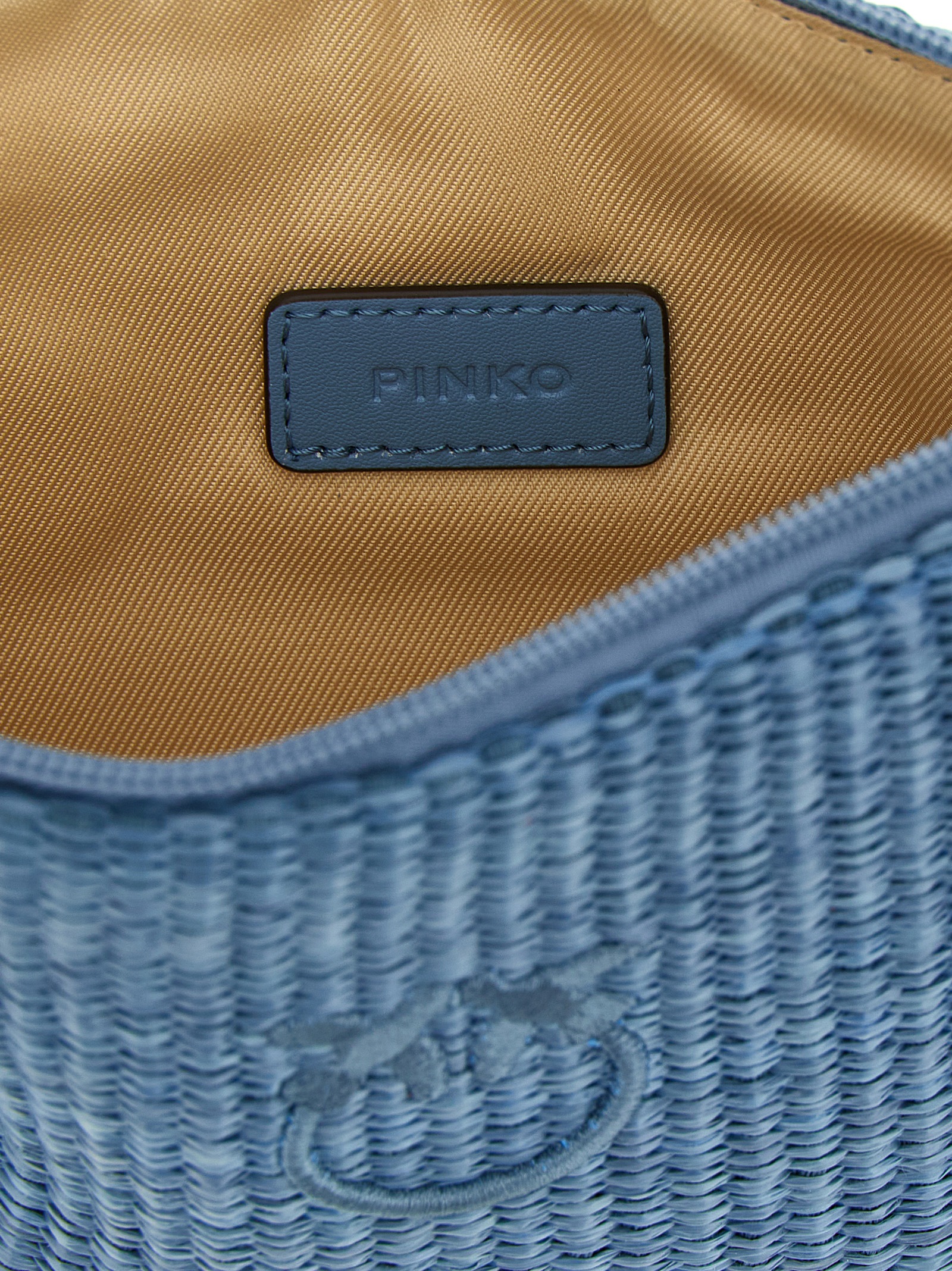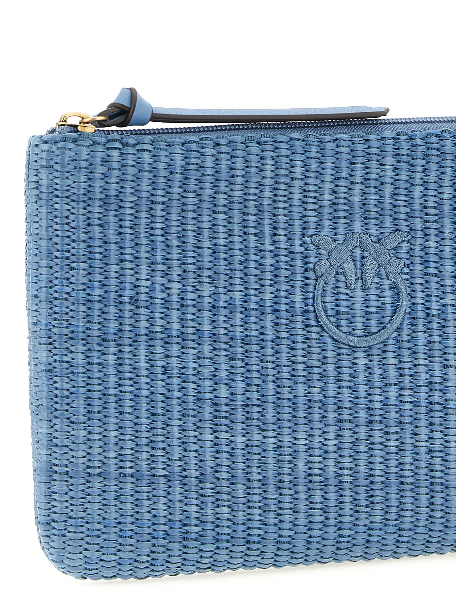Braided raffia-effect fabric clutch bag, front tonal ‘Love Birds’ embroidery, top zip closure, cotton drill lining, and inner pocket.