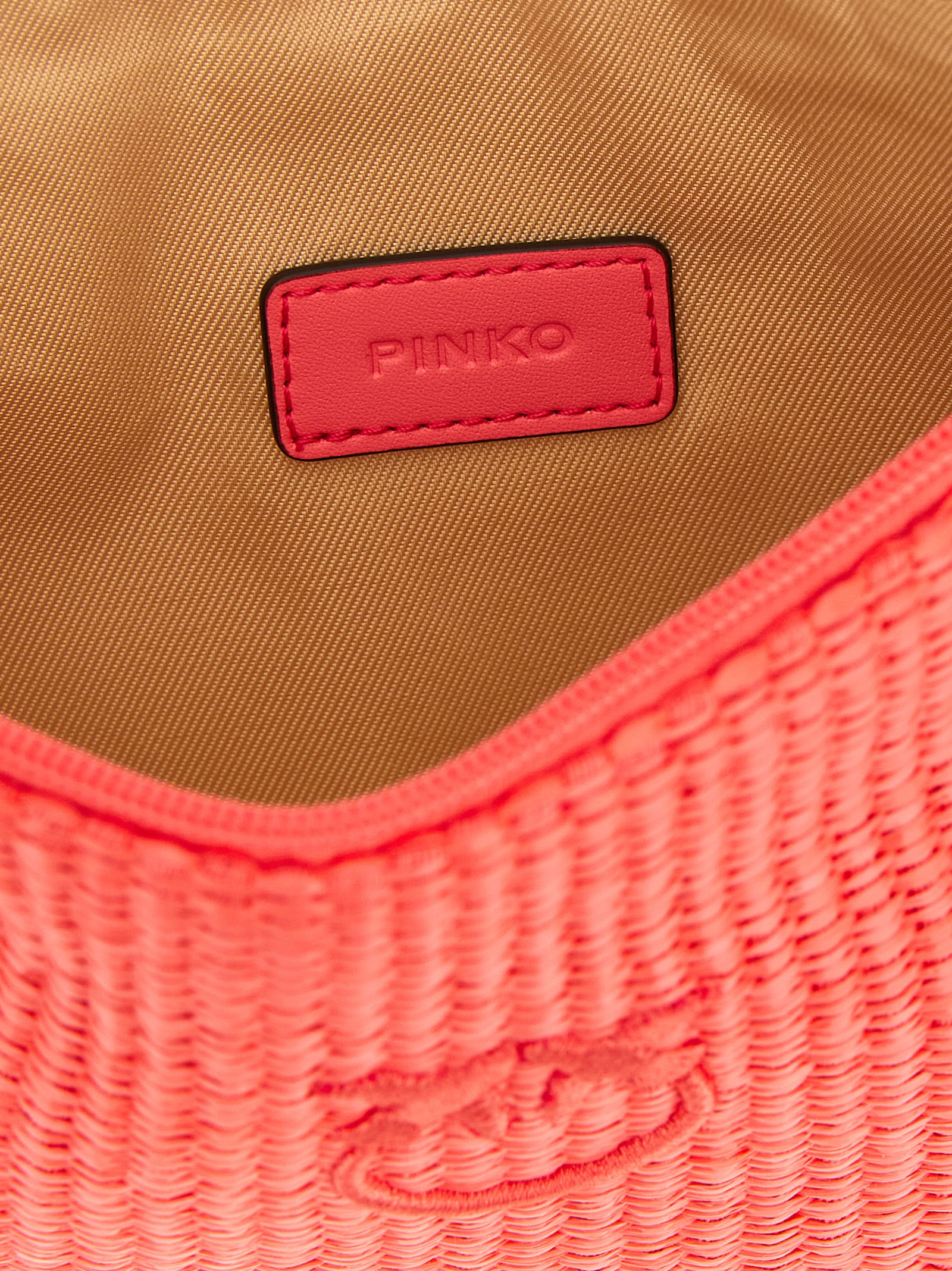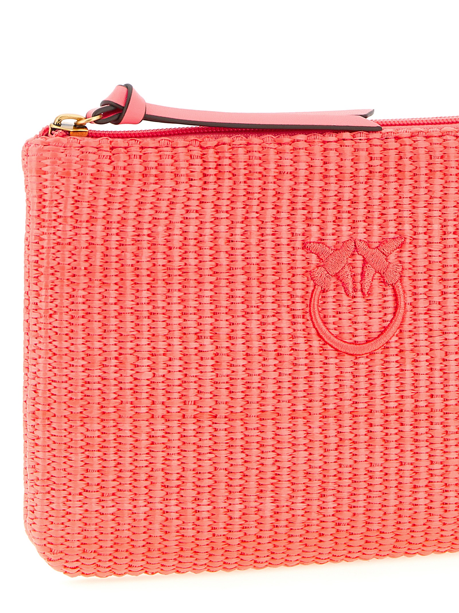 Braided raffia-effect fabric clutch bag, front tonal ‘Love Birds’ embroidery, top zip closure, cotton drill lining, and inner pocket.