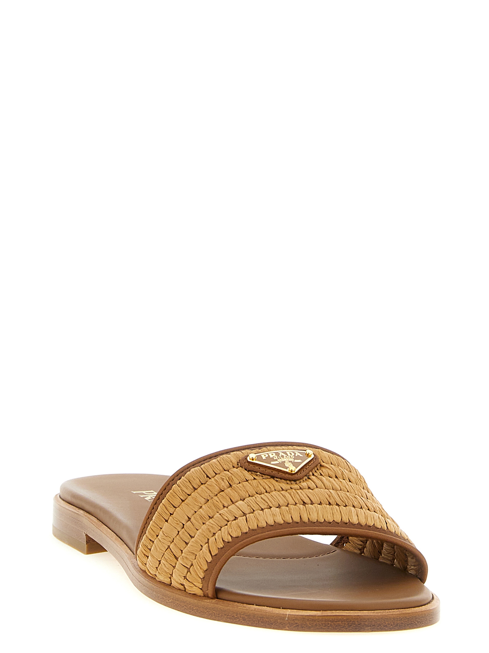 Slides in woven viscose raffia with crochet and smooth leather craftsmanship, front enameled metal triangle logo, monobloc leather and rubber sole.