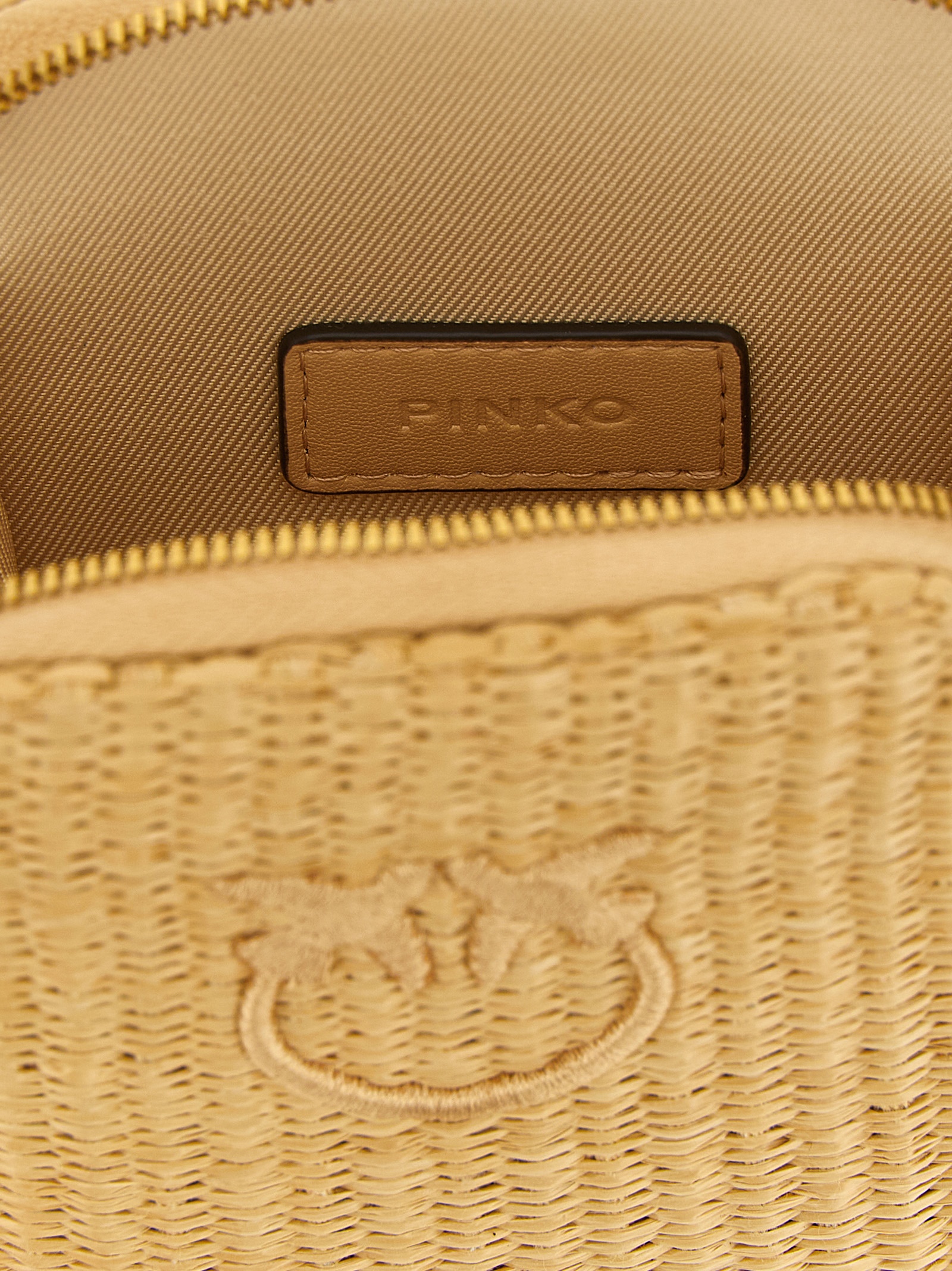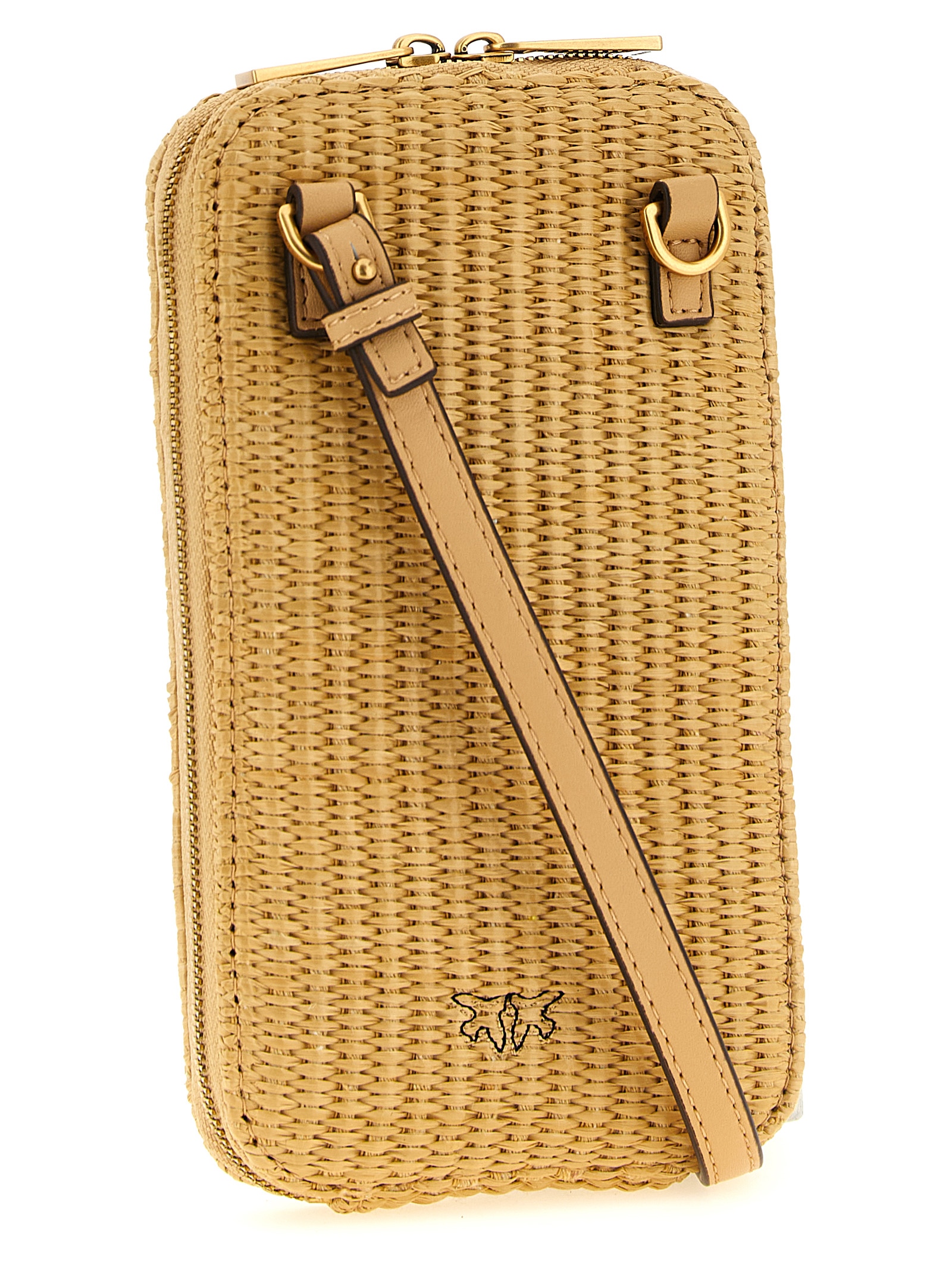 Braided raffia smartphone holder with tone-on-tone Love Birds Diamond embroidery on the front, zip-around closure, adjustable and removable leather handle and shoulder strap.