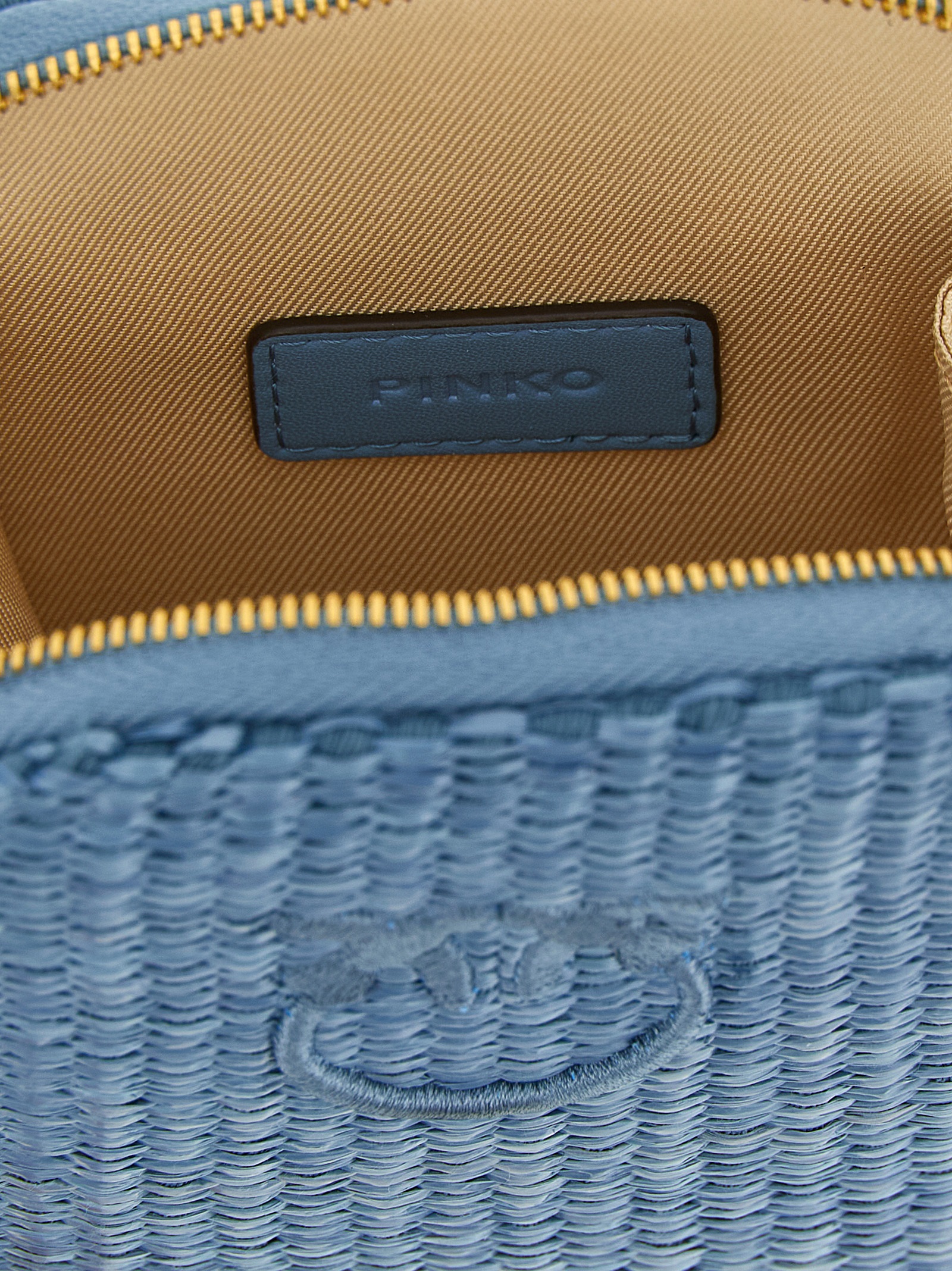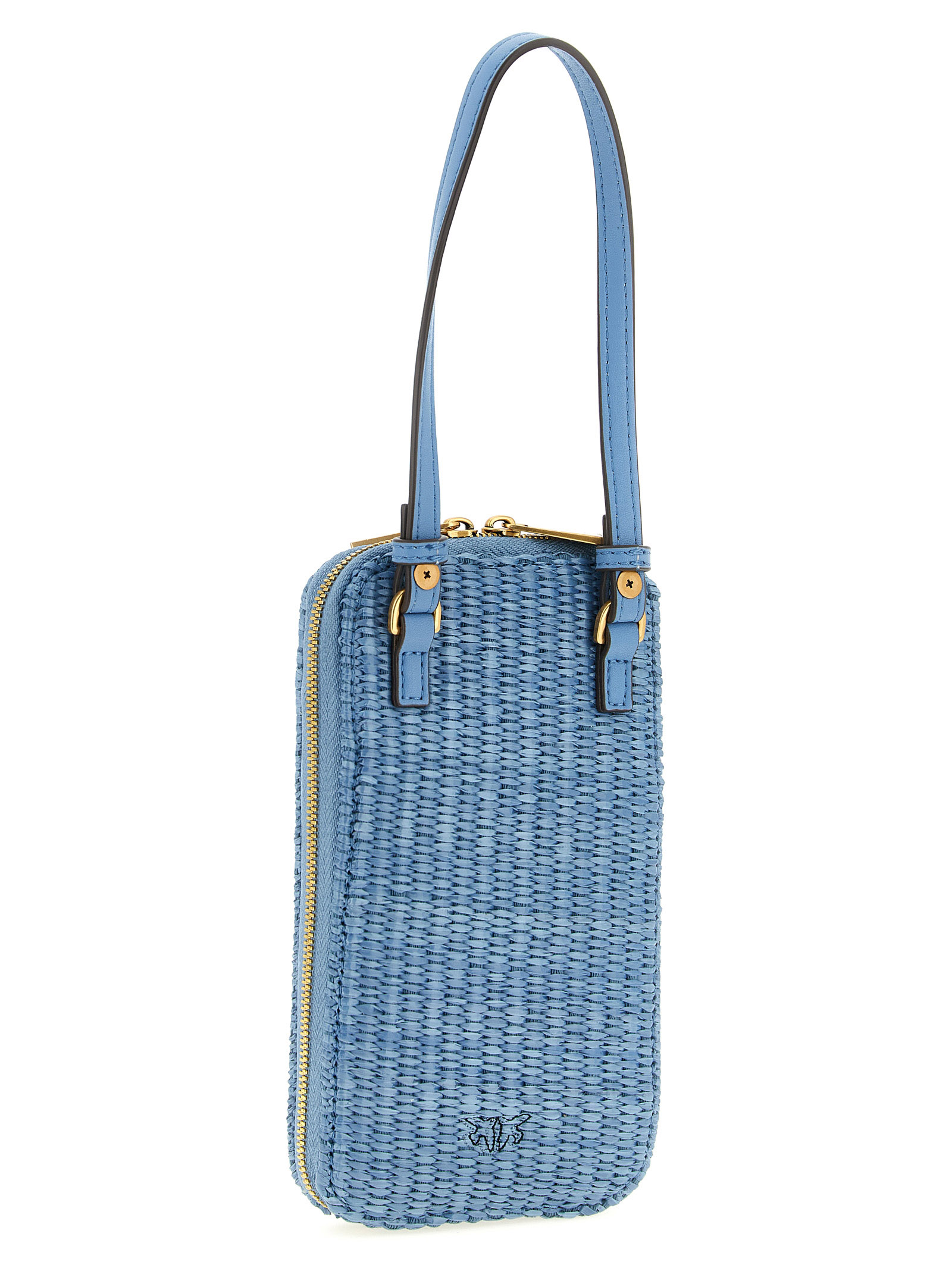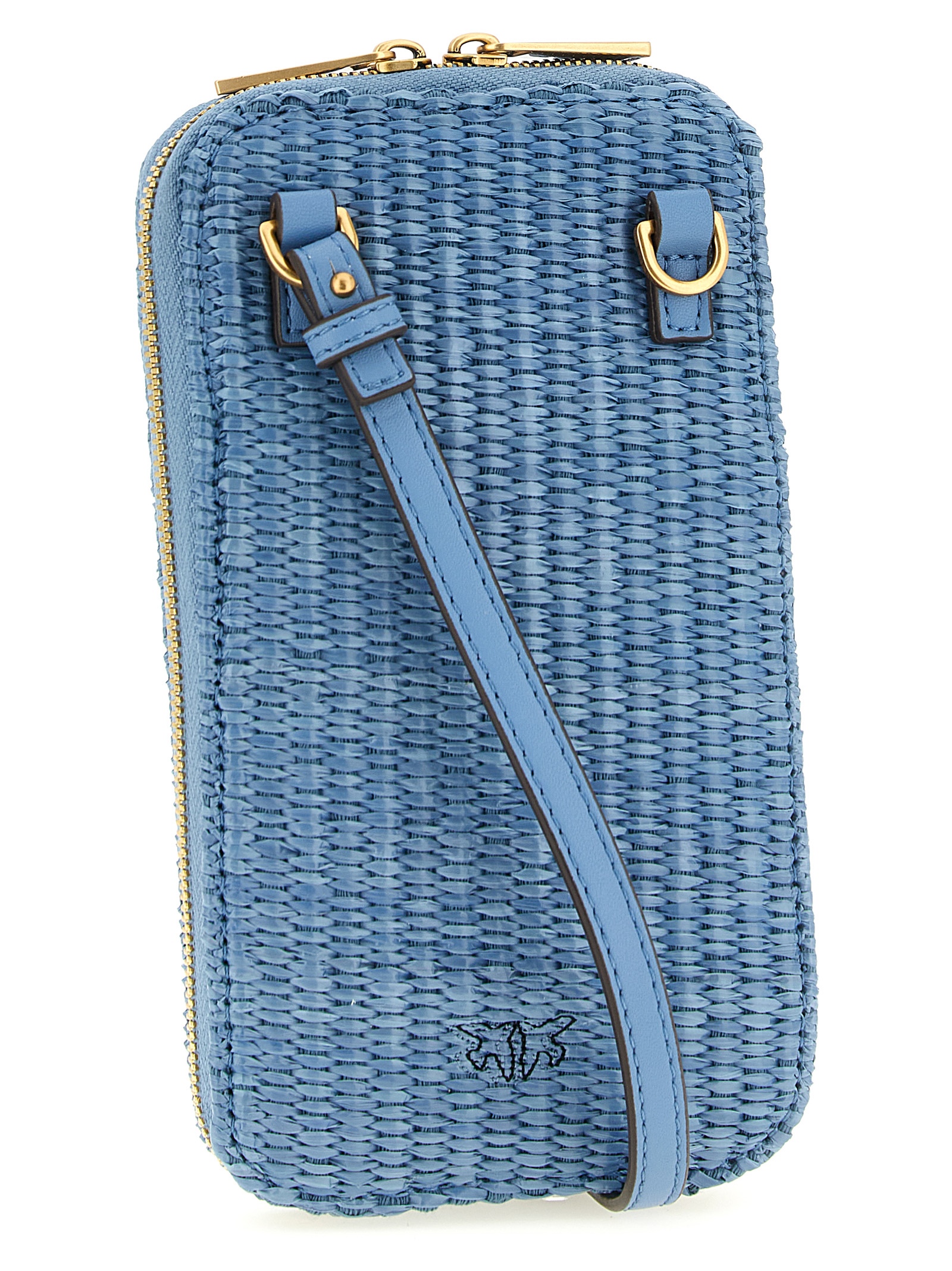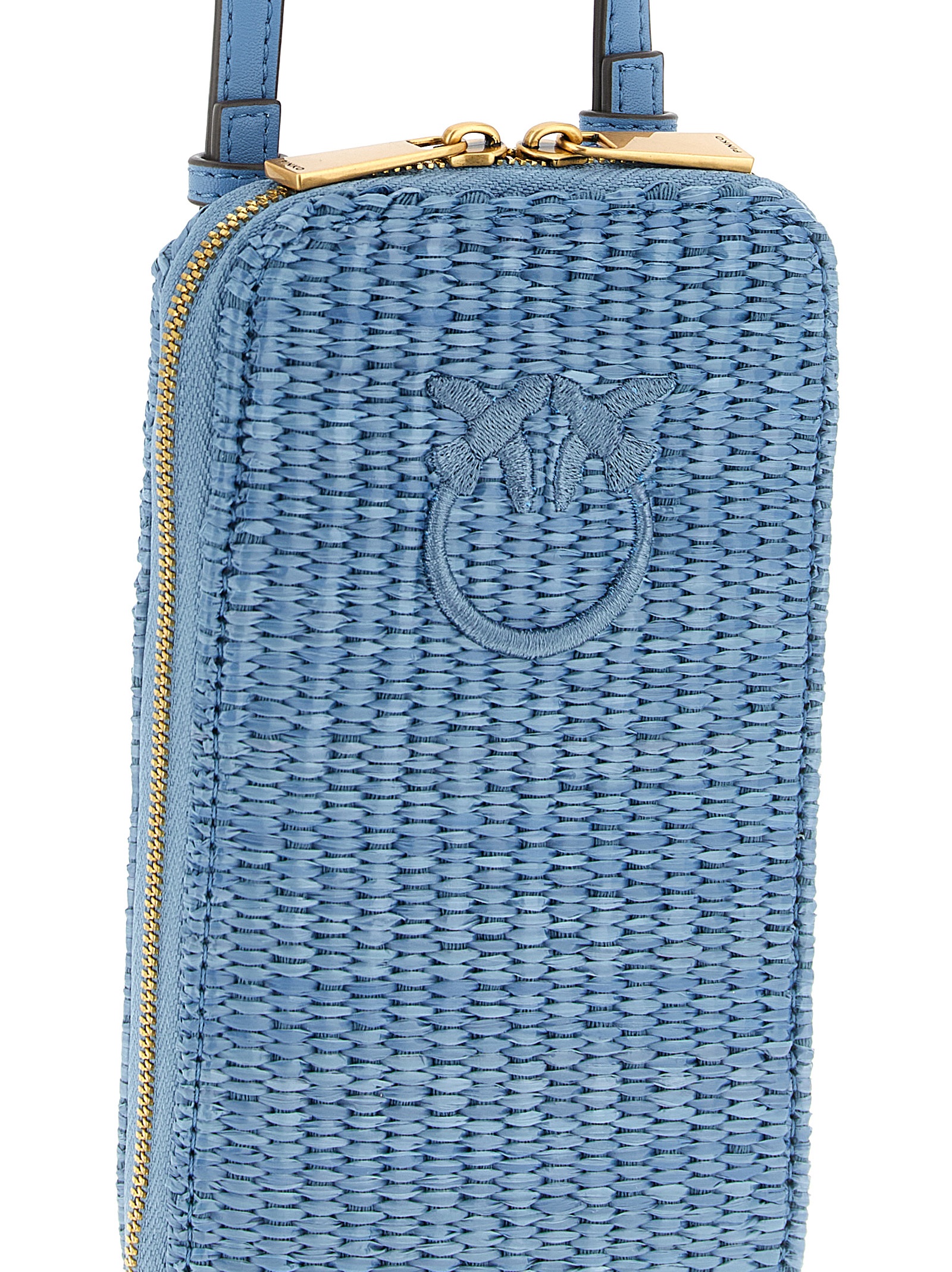 Braided raffia smartphone holder with tone-on-tone Love Birds Diamond embroidery on the front, zip-around closure, adjustable and removable leather handle and shoulder strap.