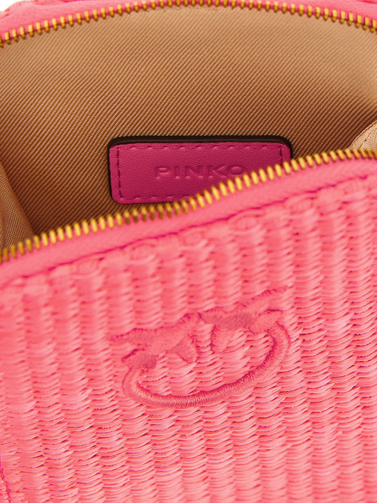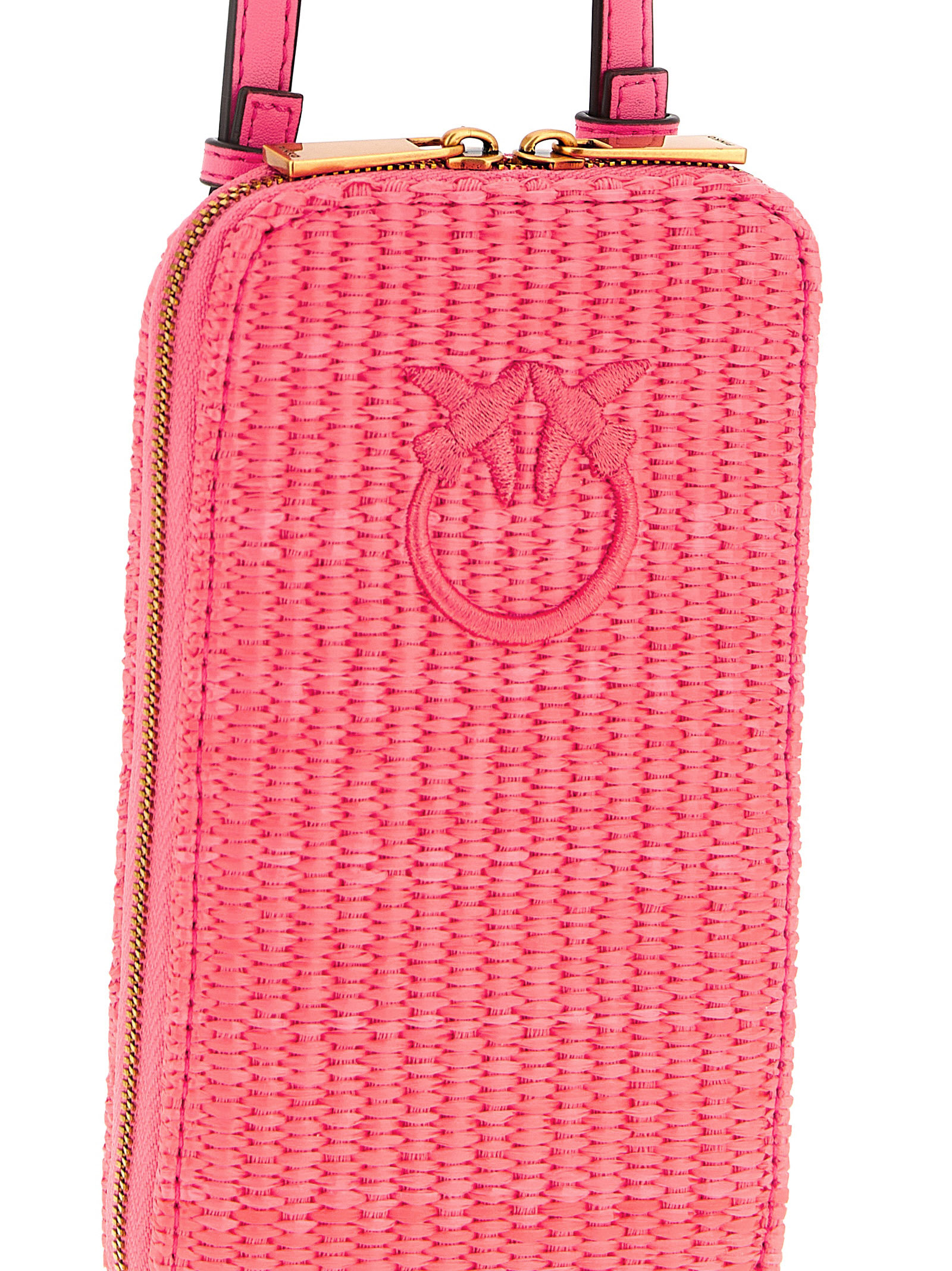 Braided raffia smartphone holder with tone-on-tone Love Birds Diamond embroidery on the front, zip-around closure, adjustable and removable leather handle and shoulder strap.