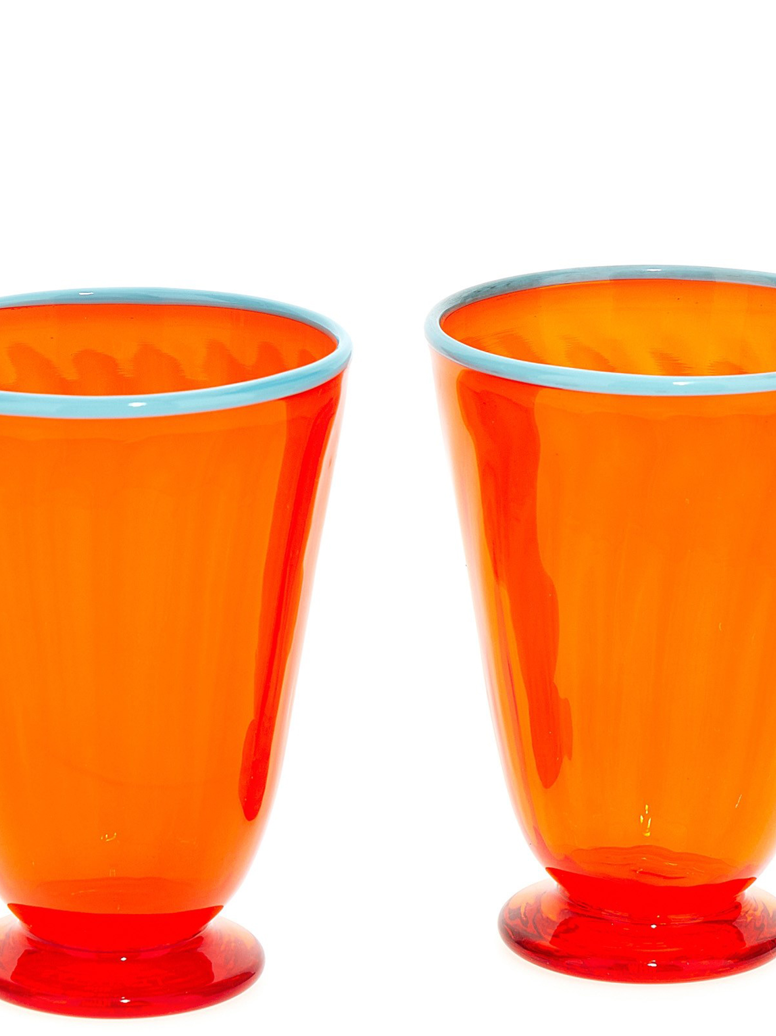 ‘Rainbow’ 2-cup set in glass from The Above-Eye Factory, with slightly tapered shape, processed glass feet and a contrast edging. Signs of a handmade nature may be present Washable for re-washing on a sensitive schedule