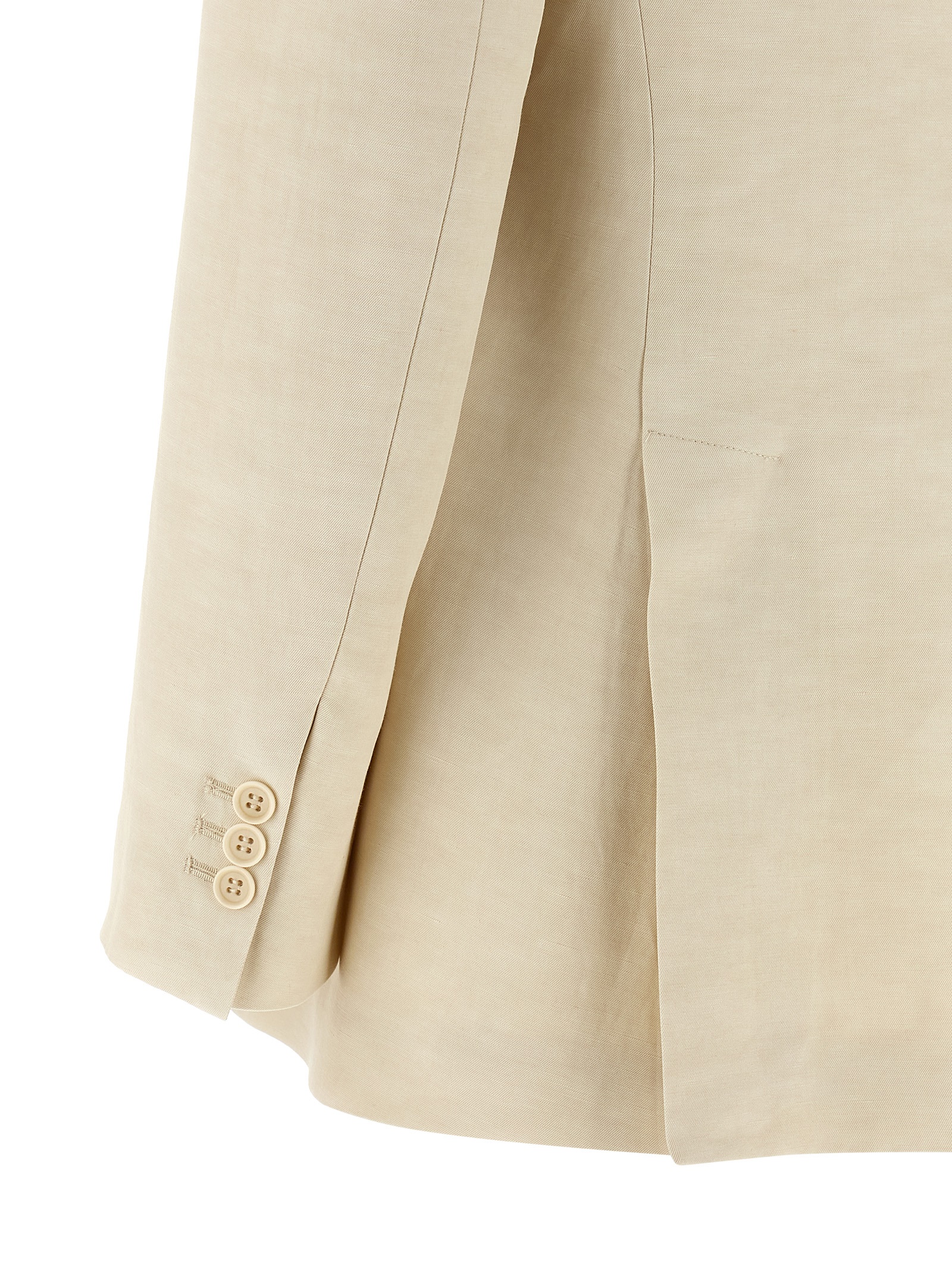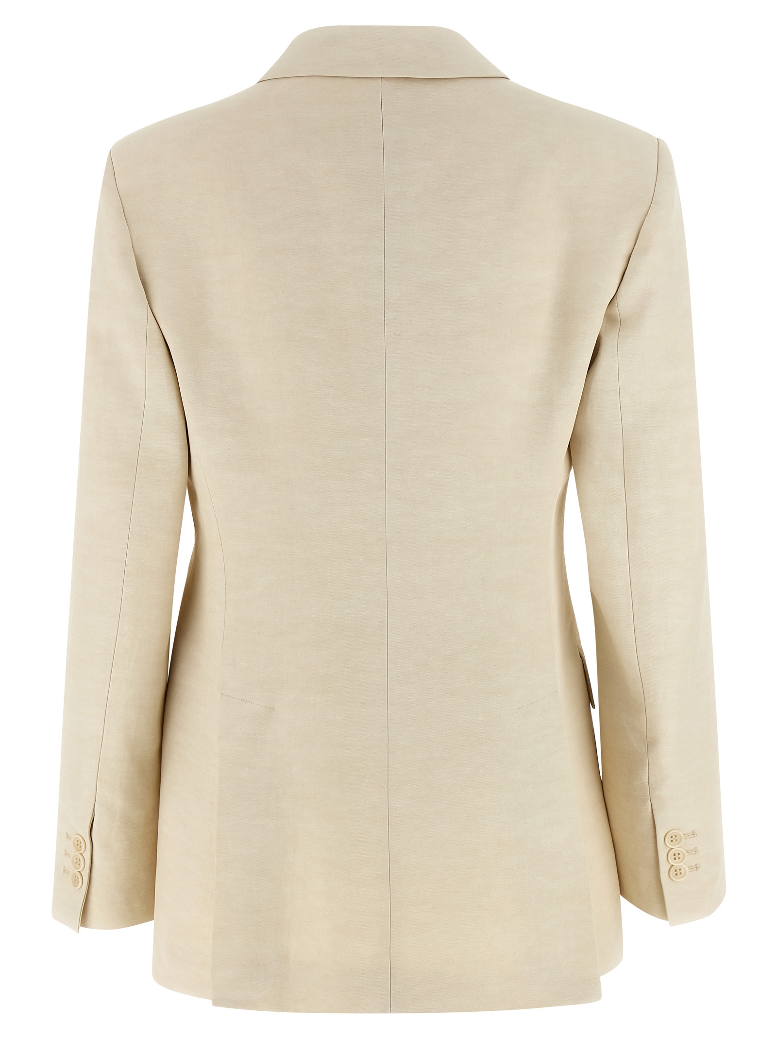 ‘Raisa’ double-breasted linen blend blazer with front button closure, V-neck with lapels, slightly padded shoulders, front pockets, long sleeves with buttons and inner elastic hidden on the wrist.