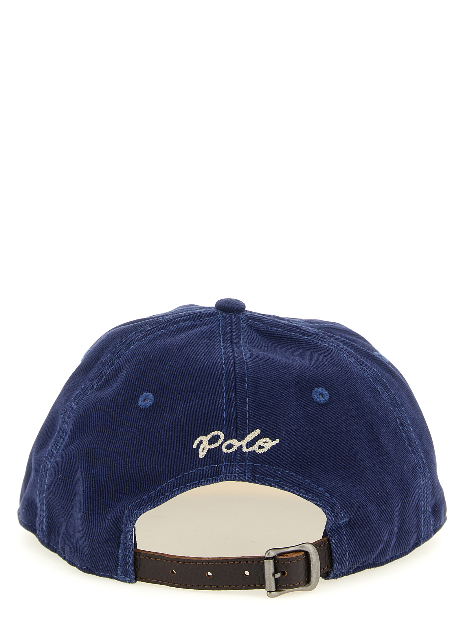 Fish-and-washed twill cap on the left with peach and washed hand finish, baseball design, six-panel construction, contrast felt ‘Ralph’ patch on the front, chain stitch logo embroidery and adjustable leather strap at the back.
