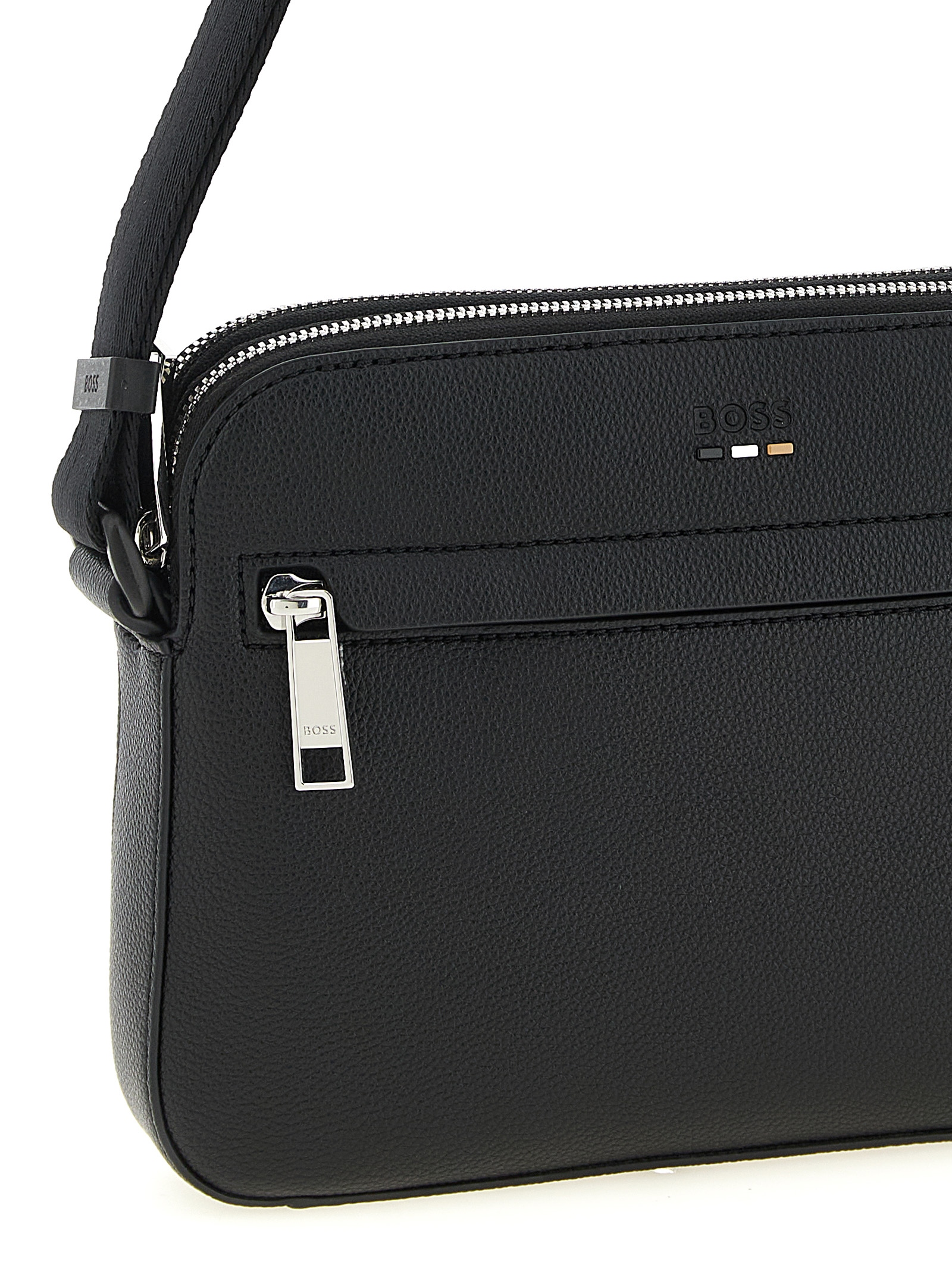 ‘Ray Double’ crossbody bag in hammered leather-effect fabric, embossed logo and front zip pocket, double top zip closure, adjustable fabric shoulder strap.