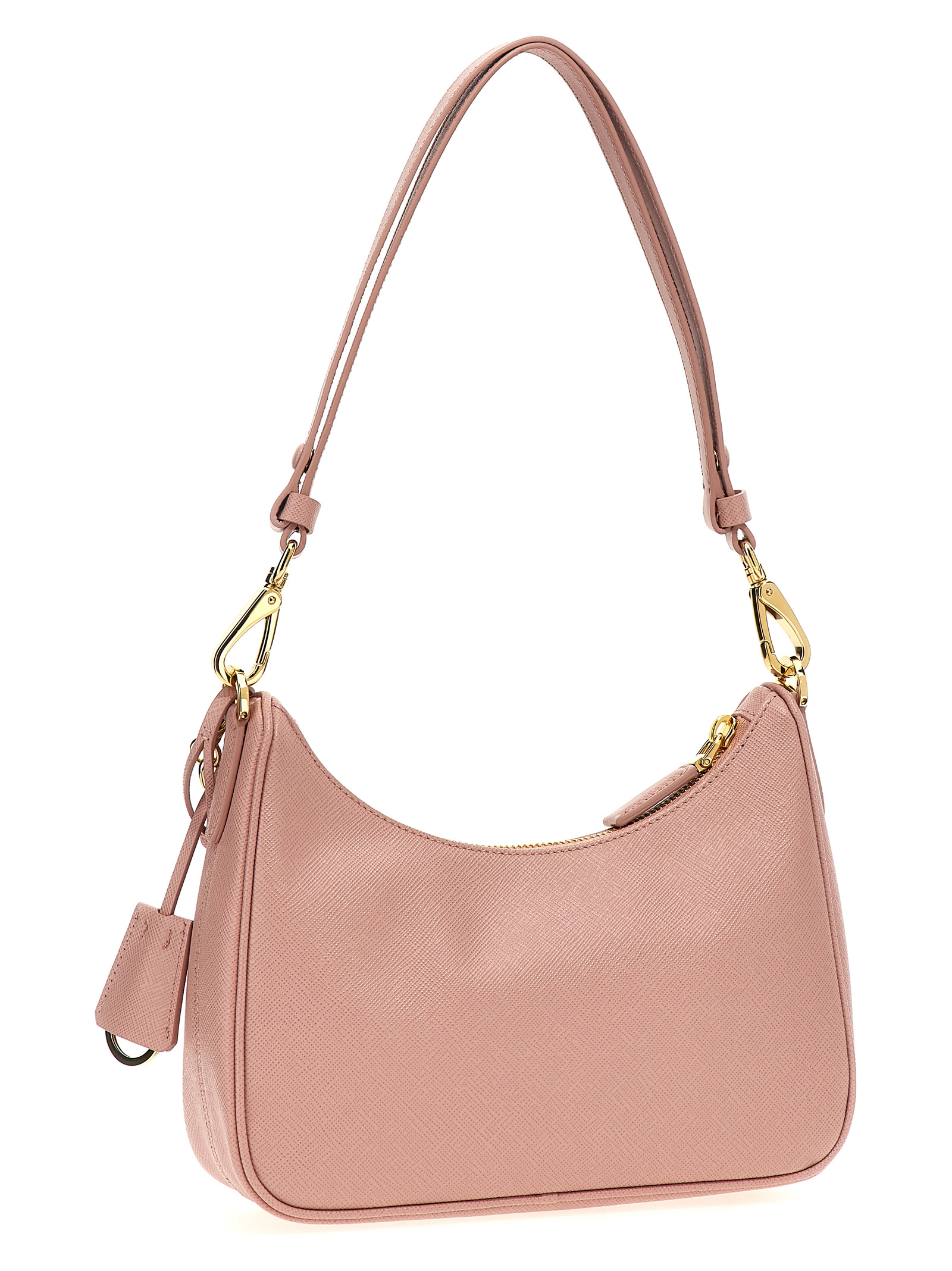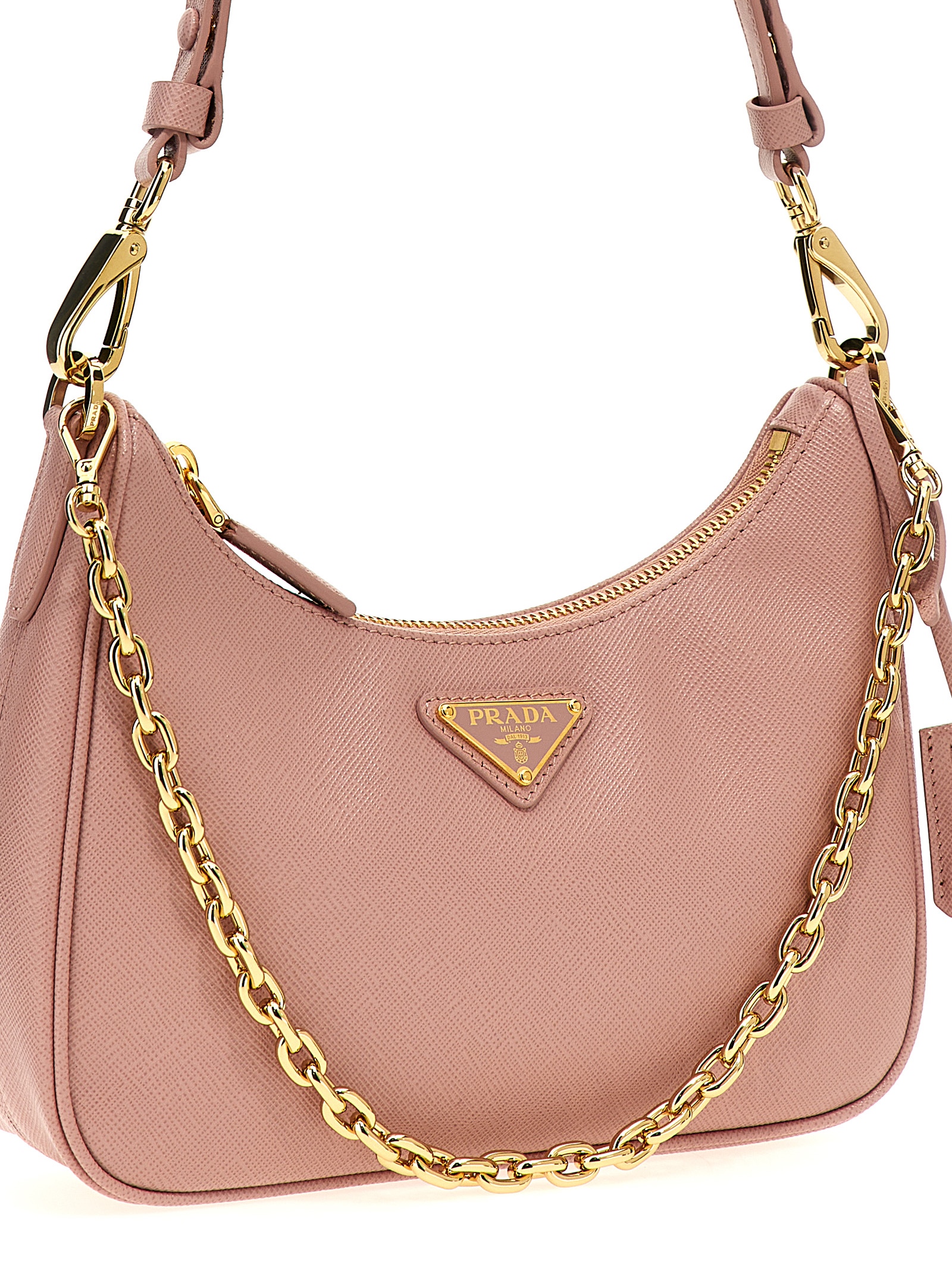 ‘Re-Edition’ mini shoulder bag in Saffiano leather with zip closure, removable leather handle, removable chain handle, front enameled metal triangle logo, and removable leather and metal key ring.