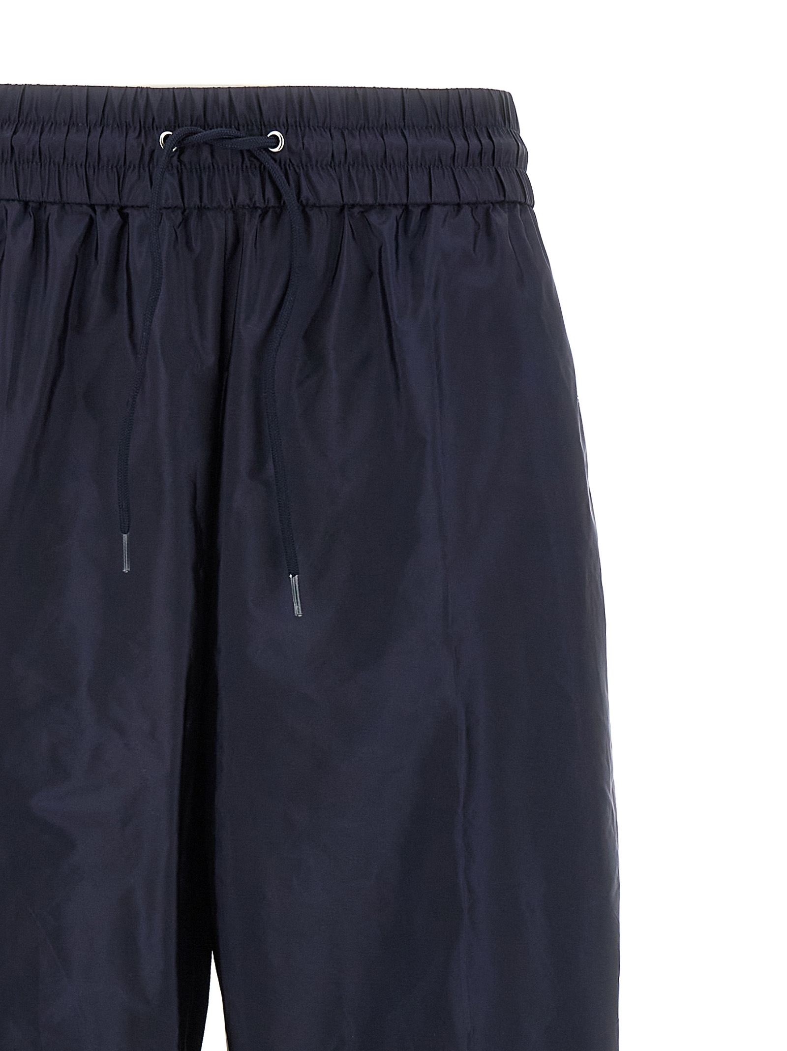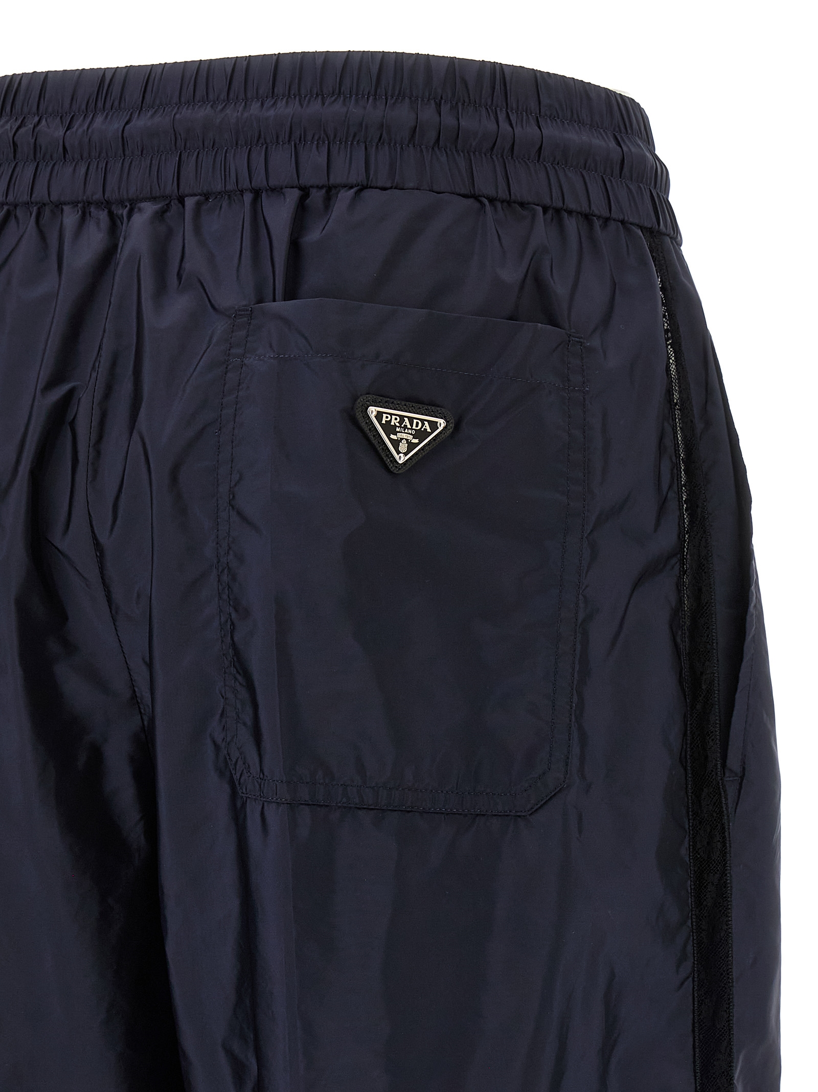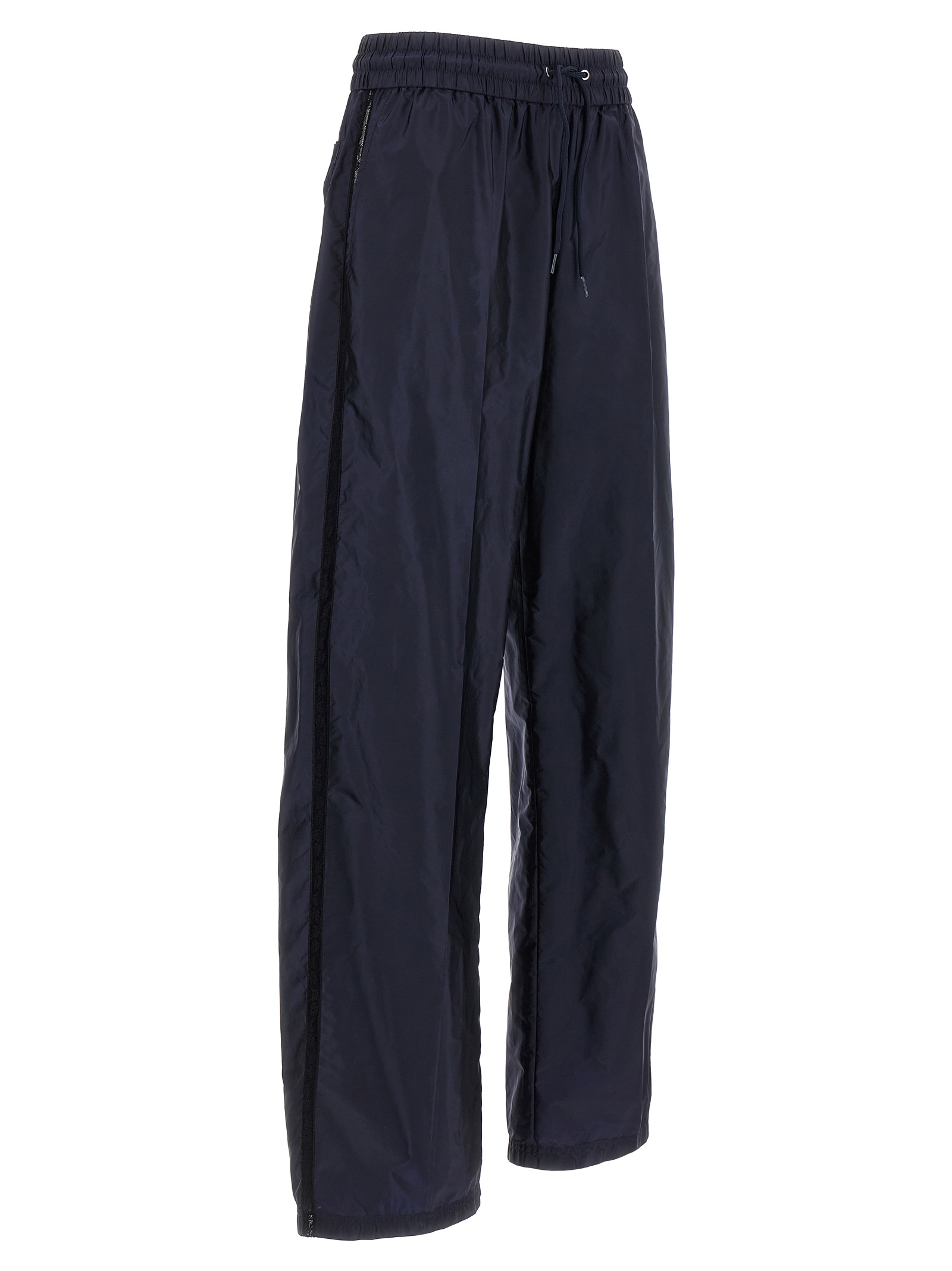 Re-Nylon pants with lace inserts on the sides, adjustable drawstring elastic at the waist, pockets, wide and straight leg, enameled metal triangle logo on the back.