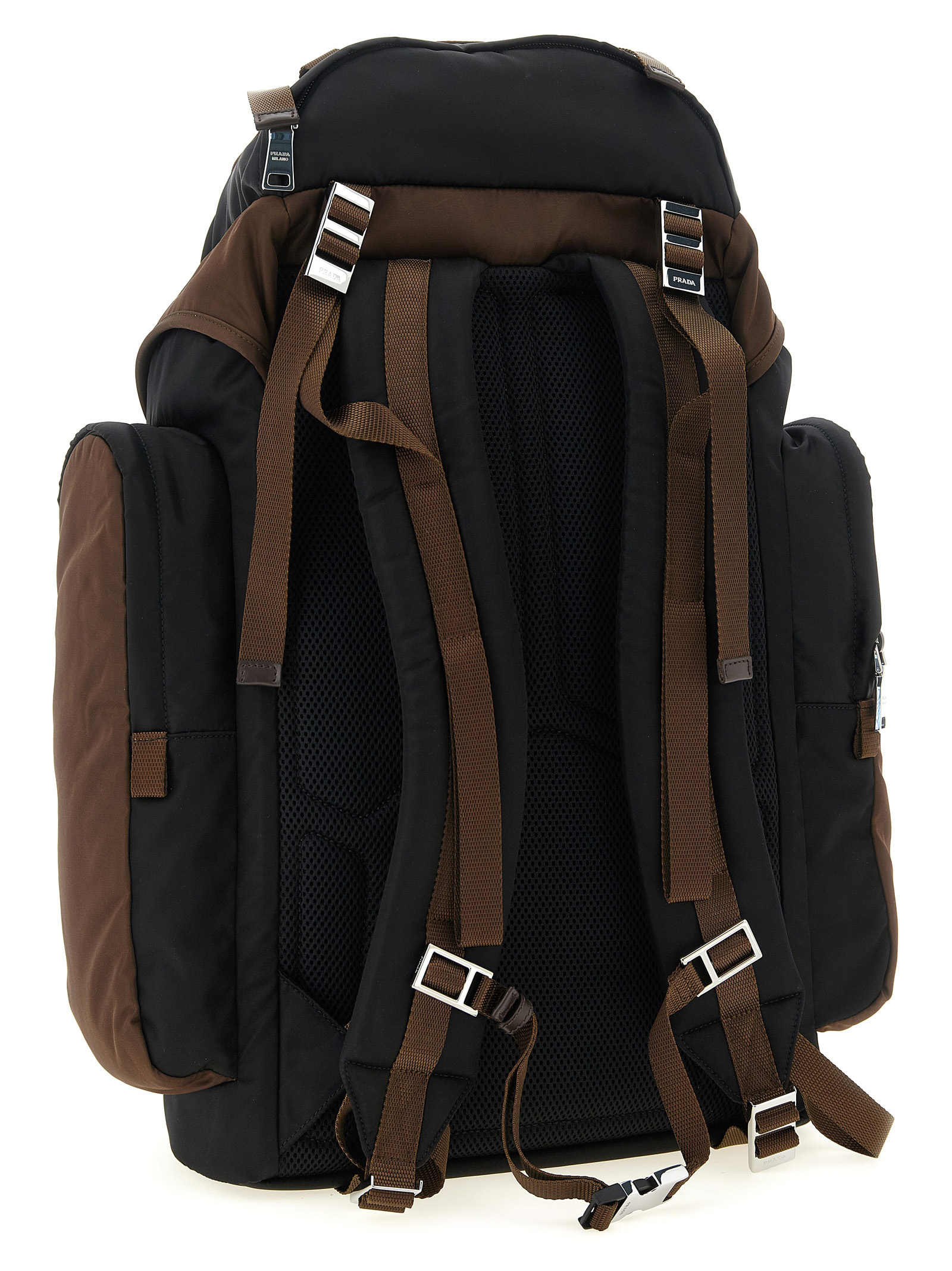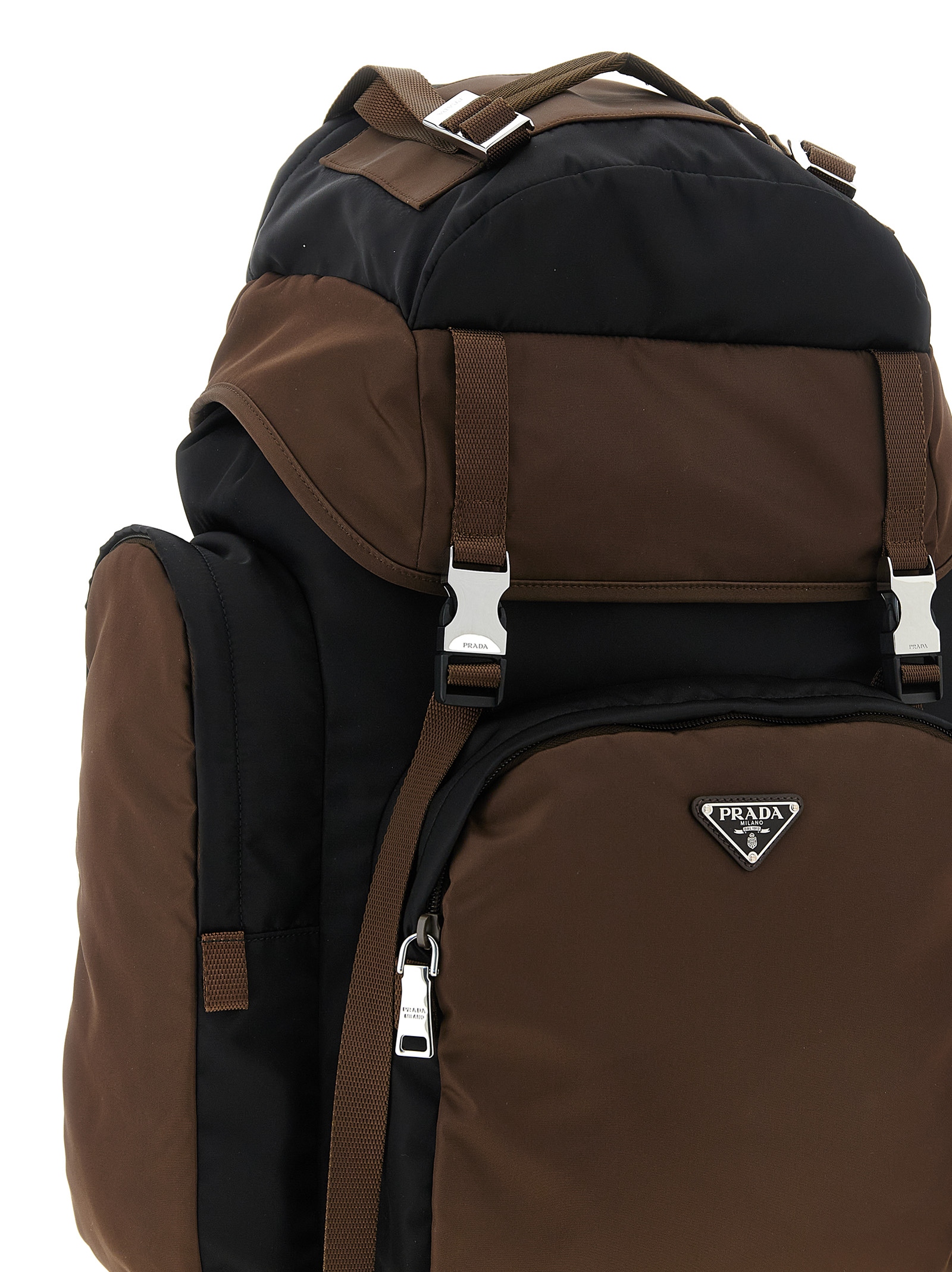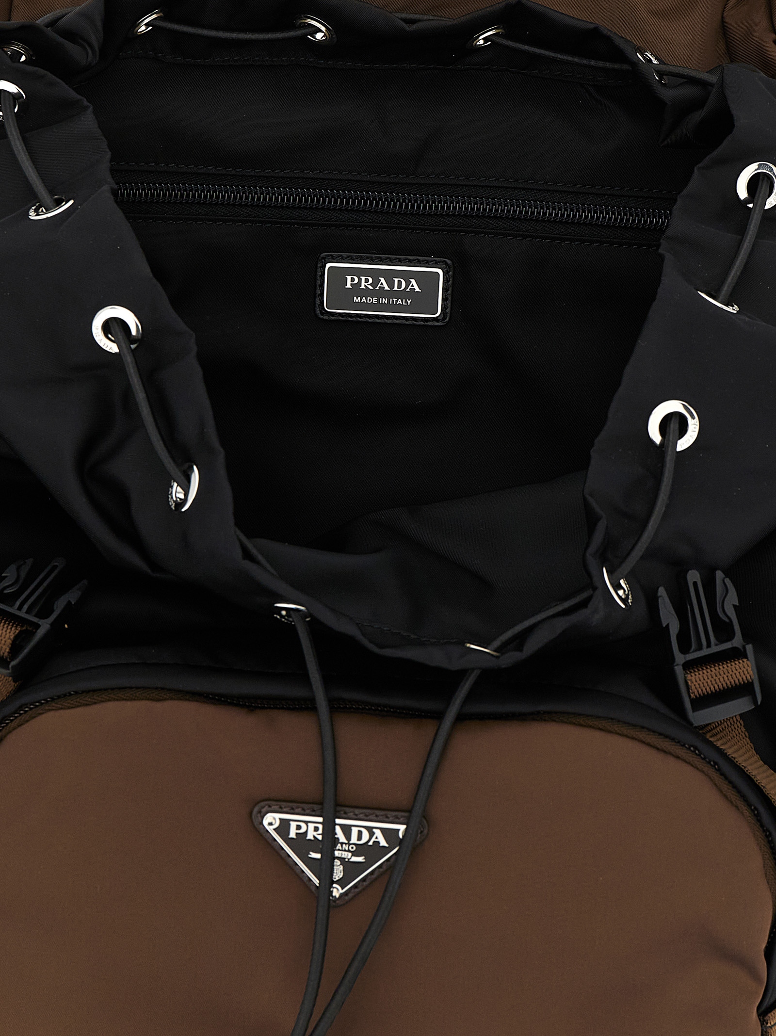 Re-Nylon backpack with leather details, trekking-inspired multipocket style, front enameled metal triangle logo, fixed top handle, flap closure with double tuc, inner drawstring, adjustable shoulder straps, padded mesh fabric backrest, Re-Nylon lining.