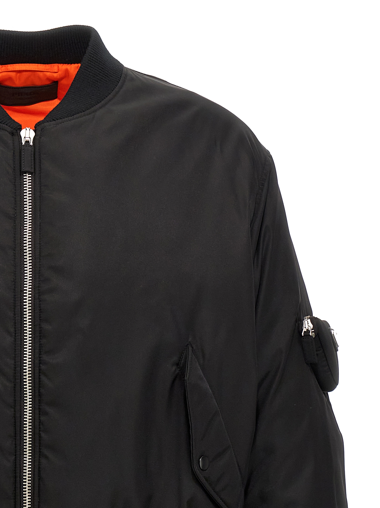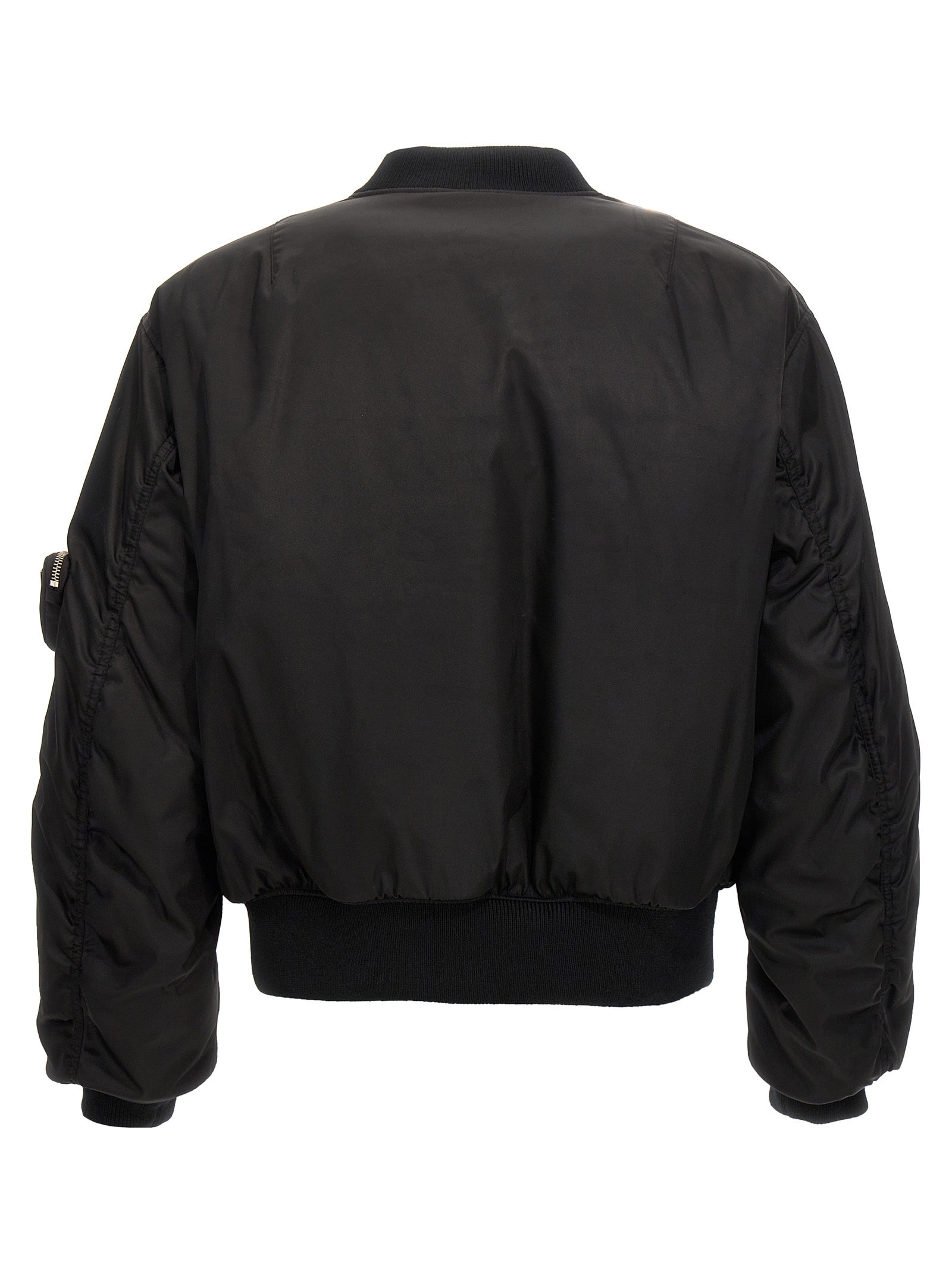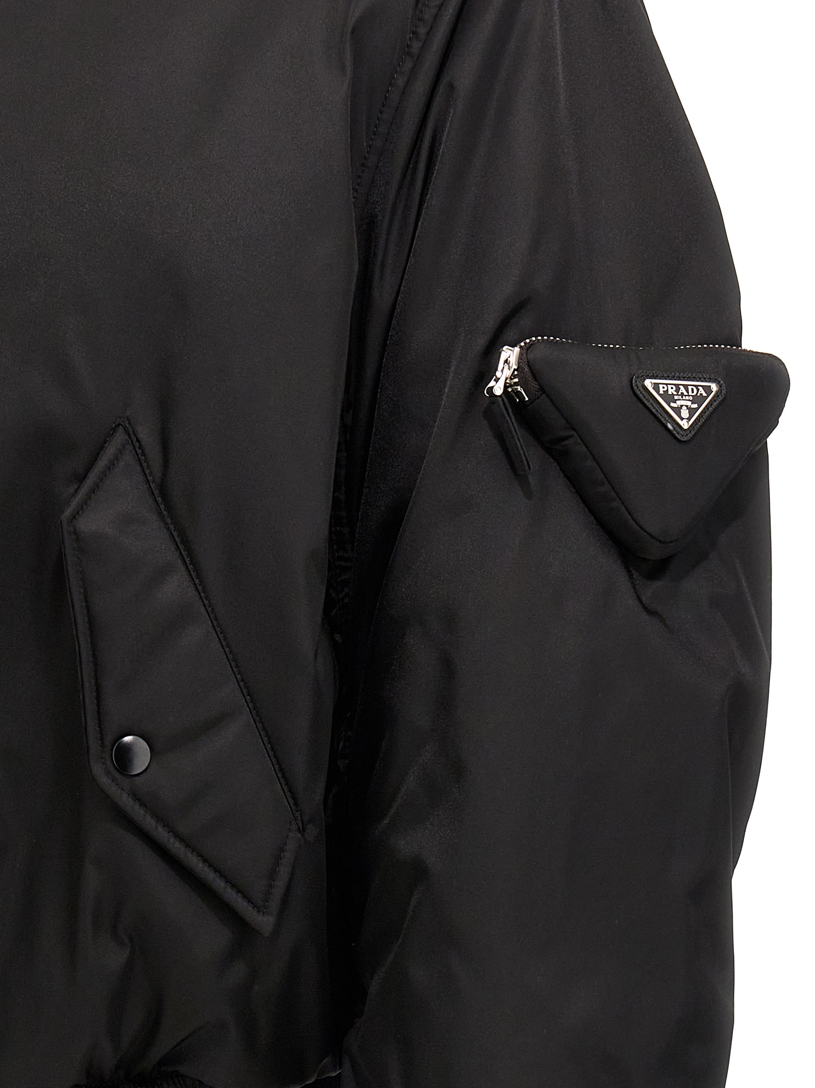 Re-Nylon padded bomber jacket, zip closure, pockets, long sleeves with knitted cuffs, pouch detail on the sleeves with enameled metal triangle logo.